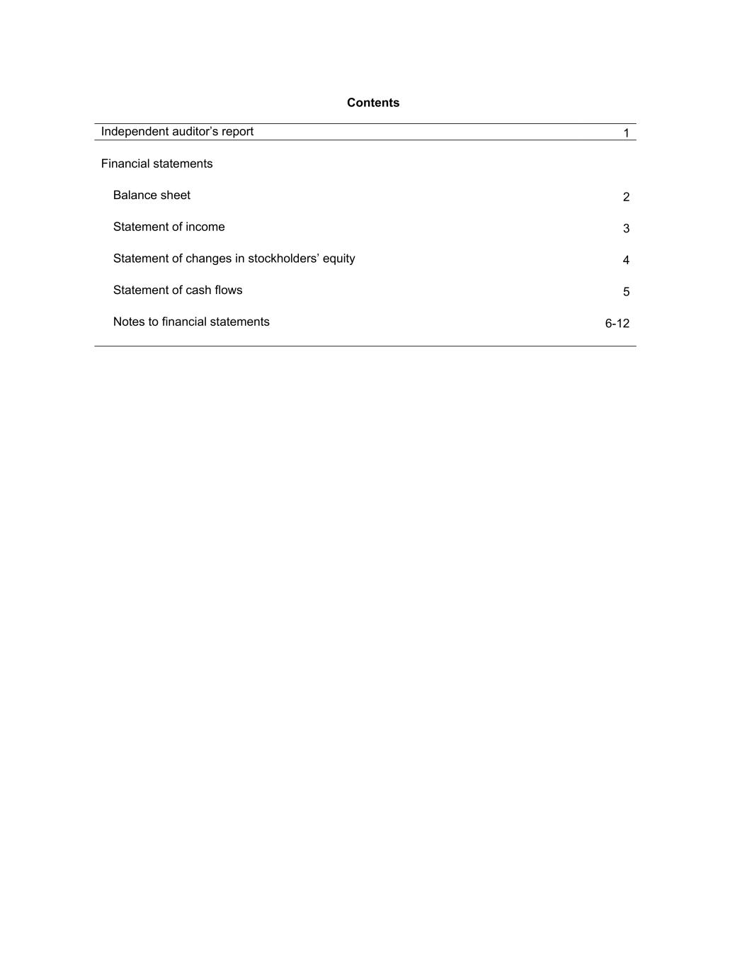 Contents Independent auditor’s report 1 Financial statements Balance sheet 2 Statement of income 3 Statement of changes in stockholders’ equity 4 Statement of cash flows 5 Notes to financial statements 6-12