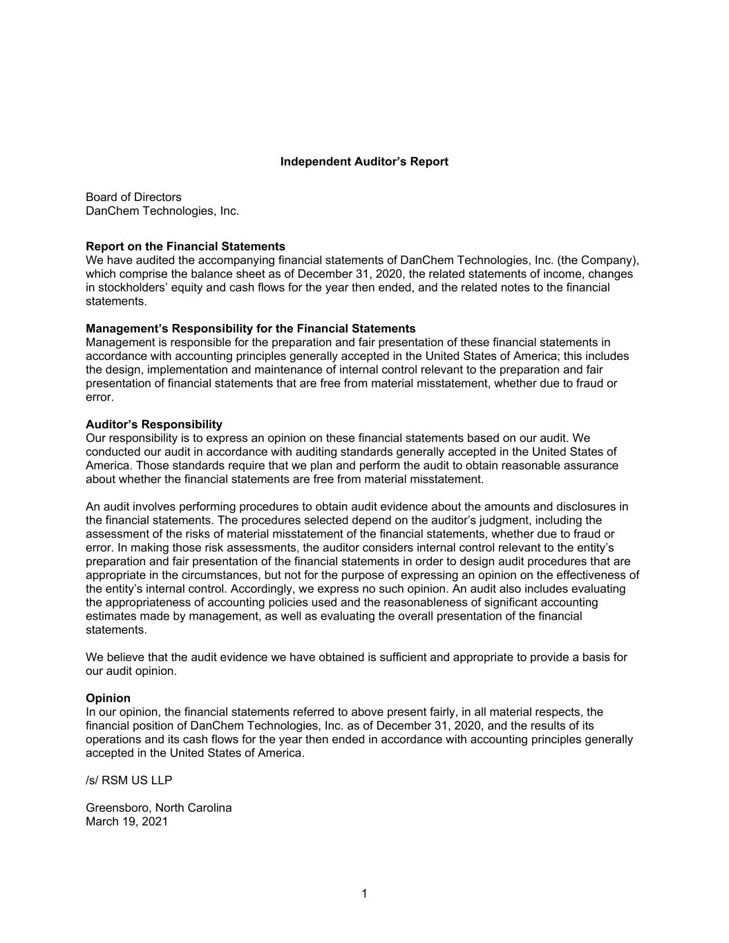 1 Independent Auditor’s Report Board of Directors DanChem Technologies, Inc. Report on the Financial Statements We have audited the accompanying financial statements of DanChem Technologies, Inc. (the Company), which comprise the balance sheet as of December 31, 2020, the related statements of income, changes in stockholders’ equity and cash flows for the year then ended, and the related notes to the financial statements. Management’s Responsibility for the Financial Statements Management is responsible for the preparation and fair presentation of these financial statements in accordance with accounting principles generally accepted in the United States of America; this includes the design, implementation and maintenance of internal control relevant to the preparation and fair presentation of financial statements that are free from material misstatement, whether due to fraud or error. Auditor’s Responsibility Our responsibility is to express an opinion on these financial statements based on our audit. We conducted our audit in accordance with auditing standards generally accepted in the United States of America. Those standards require that we plan and perform the audit to obtain reasonable assurance about whether the financial statements are free from material misstatement. An audit involves performing procedures to obtain audit evidence about the amounts and disclosures in the financial statements. The procedures selected depend on the auditor’s judgment, including the assessment of the risks of material misstatement of the financial statements, whether due to fraud or error. In making those risk assessments, the auditor considers internal control relevant to the entity’s preparation and fair presentation of the financial statements in order to design audit procedures that are appropriate in the circumstances, but not for the purpose of expressing an opinion on the effectiveness of the entity’s internal control. Accordingly, we express no such opinion. An audit also includes evaluating the appropriateness of accounting policies used and the reasonableness of significant accounting estimates made by management, as well as evaluating the overall presentation of the financial statements. We believe that the audit evidence we have obtained is sufficient and appropriate to provide a basis for our audit opinion. Opinion In our opinion, the financial statements referred to above present fairly, in all material respects, the financial position of DanChem Technologies, Inc. as of December 31, 2020, and the results of its operations and its cash flows for the year then ended in accordance with accounting principles generally accepted in the United States of America. /s/ RSM US LLP Greensboro, North Carolina March 19, 2021