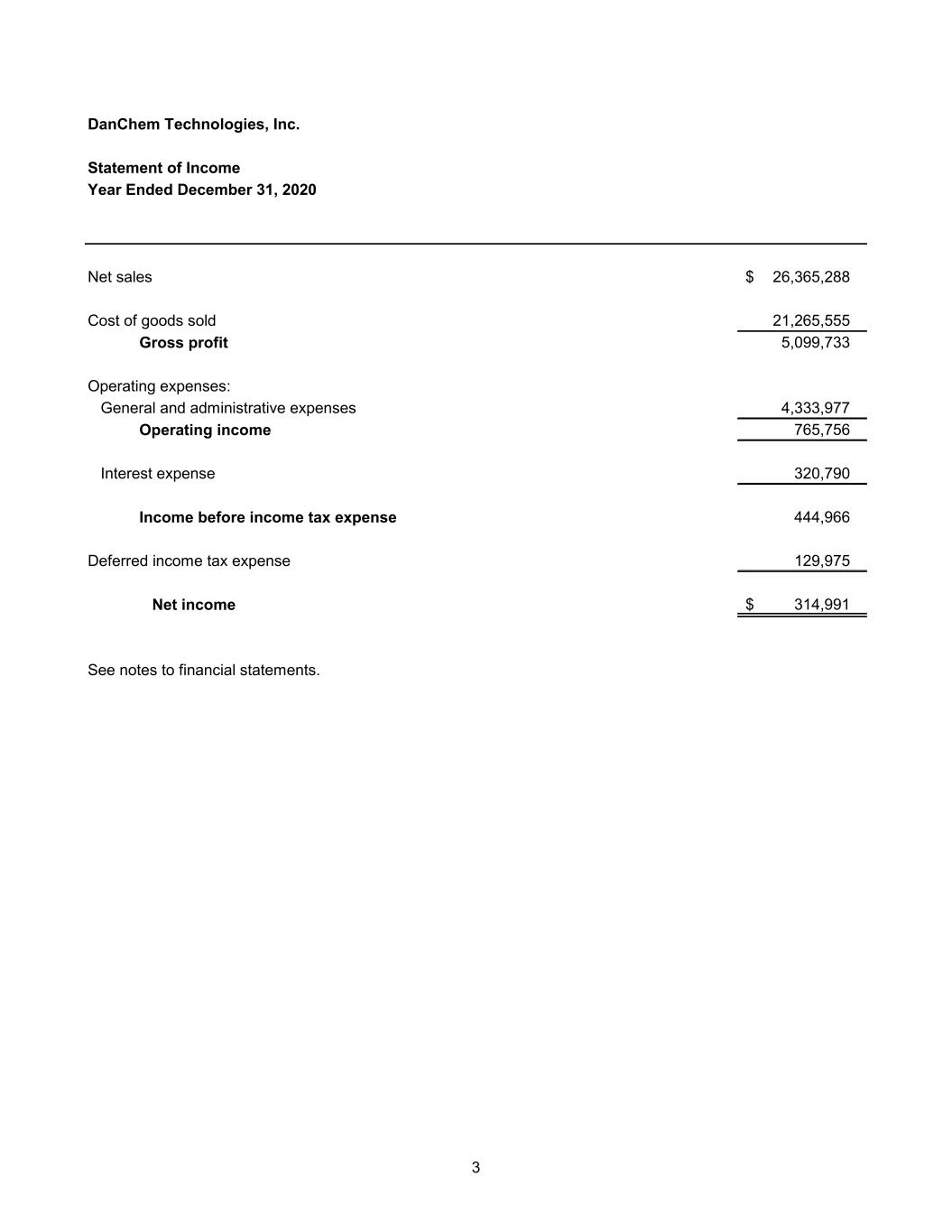 3 DanChem Technologies, Inc. Statement of Income Year Ended December 31, 2020 Net sales 26,365,288 $ Cost of goods sold 21,265,555 Gross profit 5,099,733 Operating expenses: General and administrative expenses 4,333,977 Operating income 765,756 Interest expense 320,790 Income before income tax expense 444,966 Deferred income tax expense 129,975 Net income 314,991 $ See notes to financial statements.