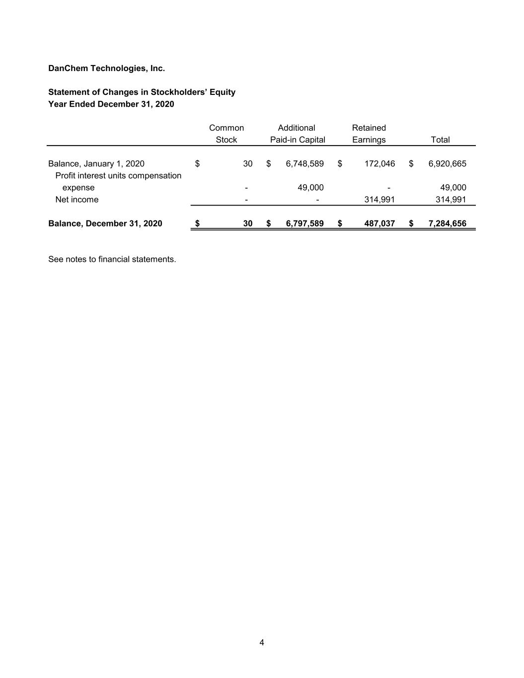 4 DanChem Technologies, Inc. Statement of Changes in Stockholders’ Equity Year Ended December 31, 2020 Common Additional Retained Stock Paid-in Capital Earnings Total Balance, January 1, 2020 30 $ 6,748,589 $ 172,046 $ 6,920,665 $ Profit interest units compensation expense - 49,000 - 49,000 Net income - - 314,991 314,991 Balance, December 31, 2020 30 $ 6,797,589 $ 487,037 $ 7,284,656 $ See notes to financial statements.