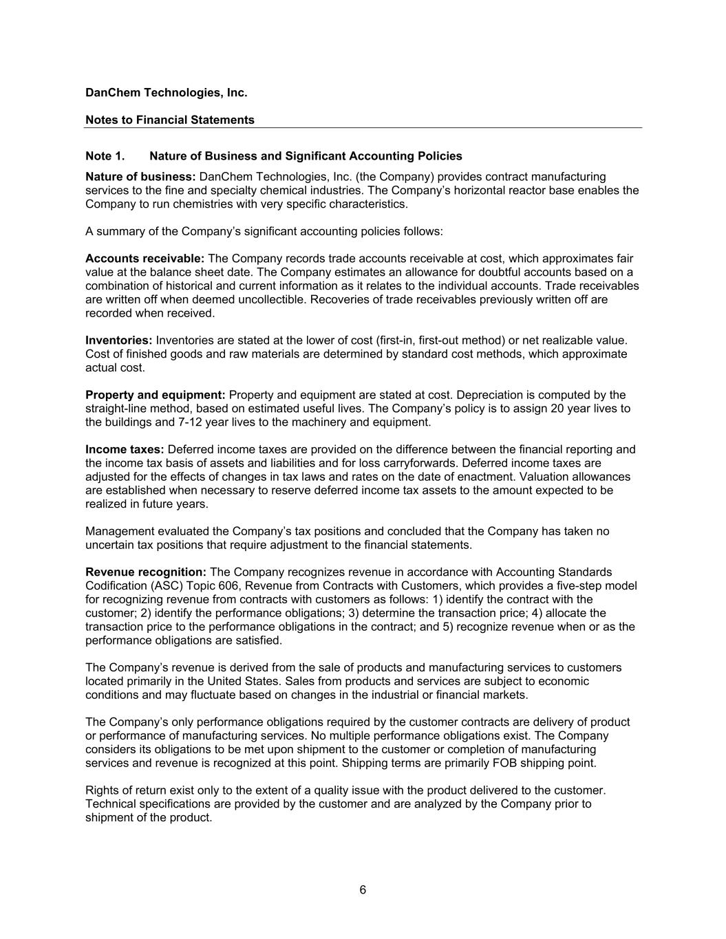 DanChem Technologies, Inc. Notes to Financial Statements 6 Note 1. Nature of Business and Significant Accounting Policies Nature of business: DanChem Technologies, Inc. (the Company) provides contract manufacturing services to the fine and specialty chemical industries. The Company’s horizontal reactor base enables the Company to run chemistries with very specific characteristics. A summary of the Company’s significant accounting policies follows: Accounts receivable: The Company records trade accounts receivable at cost, which approximates fair value at the balance sheet date. The Company estimates an allowance for doubtful accounts based on a combination of historical and current information as it relates to the individual accounts. Trade receivables are written off when deemed uncollectible. Recoveries of trade receivables previously written off are recorded when received. Inventories: Inventories are stated at the lower of cost (first-in, first-out method) or net realizable value. Cost of finished goods and raw materials are determined by standard cost methods, which approximate actual cost. Property and equipment: Property and equipment are stated at cost. Depreciation is computed by the straight-line method, based on estimated useful lives. The Company’s policy is to assign 20 year lives to the buildings and 7-12 year lives to the machinery and equipment. Income taxes: Deferred income taxes are provided on the difference between the financial reporting and the income tax basis of assets and liabilities and for loss carryforwards. Deferred income taxes are adjusted for the effects of changes in tax laws and rates on the date of enactment. Valuation allowances are established when necessary to reserve deferred income tax assets to the amount expected to be realized in future years. Management evaluated the Company’s tax positions and concluded that the Company has taken no uncertain tax positions that require adjustment to the financial statements. Revenue recognition: The Company recognizes revenue in accordance with Accounting Standards Codification (ASC) Topic 606, Revenue from Contracts with Customers, which provides a five-step model for recognizing revenue from contracts with customers as follows: 1) identify the contract with the customer; 2) identify the performance obligations; 3) determine the transaction price; 4) allocate the transaction price to the performance obligations in the contract; and 5) recognize revenue when or as the performance obligations are satisfied. The Company’s revenue is derived from the sale of products and manufacturing services to customers located primarily in the United States. Sales from products and services are subject to economic conditions and may fluctuate based on changes in the industrial or financial markets. The Company’s only performance obligations required by the customer contracts are delivery of product or performance of manufacturing services. No multiple performance obligations exist. The Company considers its obligations to be met upon shipment to the customer or completion of manufacturing services and revenue is recognized at this point. Shipping terms are primarily FOB shipping point. Rights of return exist only to the extent of a quality issue with the product delivered to the customer. Technical specifications are provided by the customer and are analyzed by the Company prior to shipment of the product.