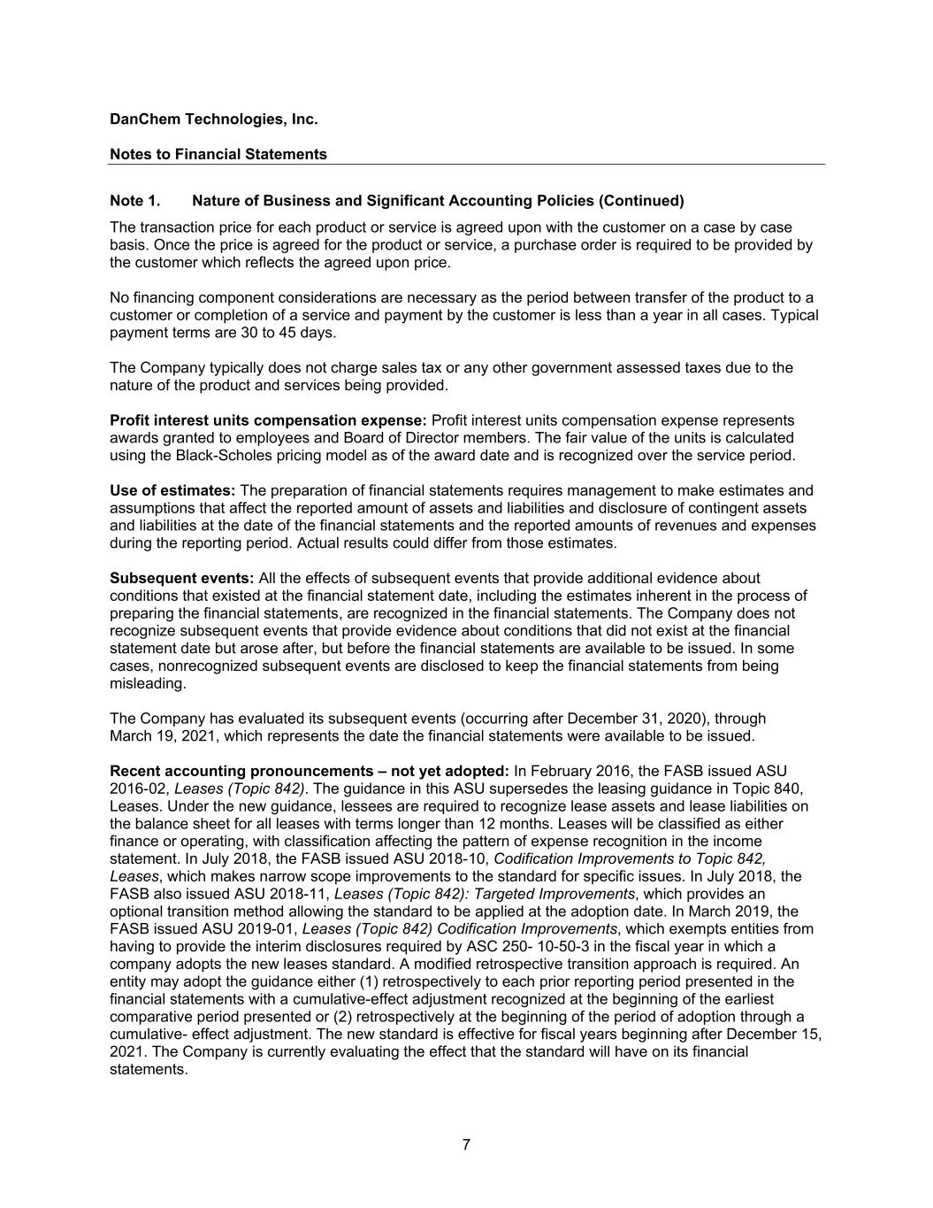 DanChem Technologies, Inc. Notes to Financial Statements 7 Note 1. Nature of Business and Significant Accounting Policies (Continued) The transaction price for each product or service is agreed upon with the customer on a case by case basis. Once the price is agreed for the product or service, a purchase order is required to be provided by the customer which reflects the agreed upon price. No financing component considerations are necessary as the period between transfer of the product to a customer or completion of a service and payment by the customer is less than a year in all cases. Typical payment terms are 30 to 45 days. The Company typically does not charge sales tax or any other government assessed taxes due to the nature of the product and services being provided. Profit interest units compensation expense: Profit interest units compensation expense represents awards granted to employees and Board of Director members. The fair value of the units is calculated using the Black-Scholes pricing model as of the award date and is recognized over the service period. Use of estimates: The preparation of financial statements requires management to make estimates and assumptions that affect the reported amount of assets and liabilities and disclosure of contingent assets and liabilities at the date of the financial statements and the reported amounts of revenues and expenses during the reporting period. Actual results could differ from those estimates. Subsequent events: All the effects of subsequent events that provide additional evidence about conditions that existed at the financial statement date, including the estimates inherent in the process of preparing the financial statements, are recognized in the financial statements. The Company does not recognize subsequent events that provide evidence about conditions that did not exist at the financial statement date but arose after, but before the financial statements are available to be issued. In some cases, nonrecognized subsequent events are disclosed to keep the financial statements from being misleading. The Company has evaluated its subsequent events (occurring after December 31, 2020), through March 19, 2021, which represents the date the financial statements were available to be issued. Recent accounting pronouncements – not yet adopted: In February 2016, the FASB issued ASU 2016-02, Leases (Topic 842). The guidance in this ASU supersedes the leasing guidance in Topic 840, Leases. Under the new guidance, lessees are required to recognize lease assets and lease liabilities on the balance sheet for all leases with terms longer than 12 months. Leases will be classified as either finance or operating, with classification affecting the pattern of expense recognition in the income statement. In July 2018, the FASB issued ASU 2018-10, Codification Improvements to Topic 842, Leases, which makes narrow scope improvements to the standard for specific issues. In July 2018, the FASB also issued ASU 2018-11, Leases (Topic 842): Targeted Improvements, which provides an optional transition method allowing the standard to be applied at the adoption date. In March 2019, the FASB issued ASU 2019-01, Leases (Topic 842) Codification Improvements, which exempts entities from having to provide the interim disclosures required by ASC 250- 10-50-3 in the fiscal year in which a company adopts the new leases standard. A modified retrospective transition approach is required. An entity may adopt the guidance either (1) retrospectively to each prior reporting period presented in the financial statements with a cumulative-effect adjustment recognized at the beginning of the earliest comparative period presented or (2) retrospectively at the beginning of the period of adoption through a cumulative- effect adjustment. The new standard is effective for fiscal years beginning after December 15, 2021. The Company is currently evaluating the effect that the standard will have on its financial statements.