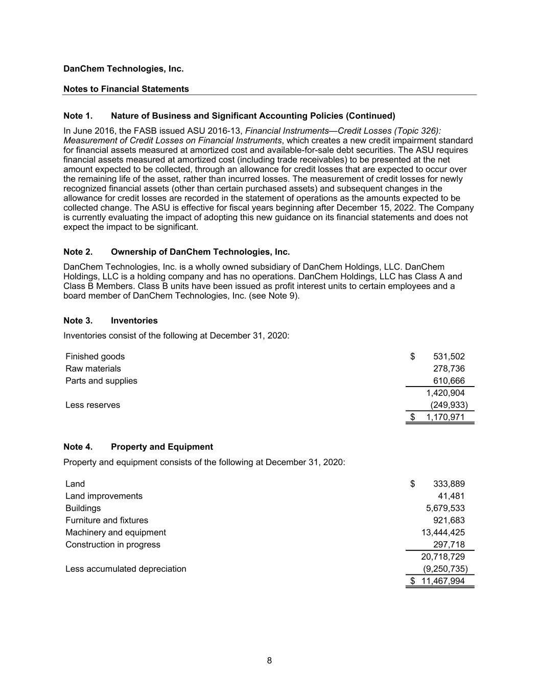 DanChem Technologies, Inc. Notes to Financial Statements 8 Note 1. Nature of Business and Significant Accounting Policies (Continued) In June 2016, the FASB issued ASU 2016-13, Financial Instruments—Credit Losses (Topic 326): Measurement of Credit Losses on Financial Instruments, which creates a new credit impairment standard for financial assets measured at amortized cost and available-for-sale debt securities. The ASU requires financial assets measured at amortized cost (including trade receivables) to be presented at the net amount expected to be collected, through an allowance for credit losses that are expected to occur over the remaining life of the asset, rather than incurred losses. The measurement of credit losses for newly recognized financial assets (other than certain purchased assets) and subsequent changes in the allowance for credit losses are recorded in the statement of operations as the amounts expected to be collected change. The ASU is effective for fiscal years beginning after December 15, 2022. The Company is currently evaluating the impact of adopting this new guidance on its financial statements and does not expect the impact to be significant. Note 2. Ownership of DanChem Technologies, Inc. DanChem Technologies, Inc. is a wholly owned subsidiary of DanChem Holdings, LLC. DanChem Holdings, LLC is a holding company and has no operations. DanChem Holdings, LLC has Class A and Class B Members. Class B units have been issued as profit interest units to certain employees and a board member of DanChem Technologies, Inc. (see Note 9). Note 3. Inventories Inventories consist of the following at December 31, 2020: Finished goods 531,502 $ Raw materials 278,736 Parts and supplies 610,666 1,420,904 Less reserves (249,933) 1,170,971 $ Note 4. Property and Equipment Property and equipment consists of the following at December 31, 2020: Land 333,889 $ Land improvements 41,481 Buildings 5,679,533 Furniture and fixtures 921,683 Machinery and equipment 13,444,425 Construction in progress 297,718 20,718,729 Less accumulated depreciation (9,250,735) 11,467,994 $