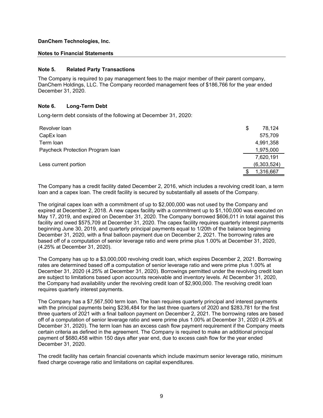 DanChem Technologies, Inc. Notes to Financial Statements 9 Note 5. Related Party Transactions The Company is required to pay management fees to the major member of their parent company, DanChem Holdings, LLC. The Company recorded management fees of $186,766 for the year ended December 31, 2020. Note 6. Long-Term Debt Long-term debt consists of the following at December 31, 2020: Revolver loan 78,124 $ CapEx loan 575,709 Term loan 4,991,358 Paycheck Protection Program loan 1,975,000 7,620,191 Less current portion (6,303,524) 1,316,667 $ The Company has a credit facility dated December 2, 2016, which includes a revolving credit loan, a term loan and a capex loan. The credit facility is secured by substantially all assets of the Company. The original capex loan with a commitment of up to $2,000,000 was not used by the Company and expired at December 2, 2018. A new capex facility with a commitment up to $1,100,000 was executed on May 17, 2019, and expired on December 31, 2020. The Company borrowed $606,011 in total against this facility and owed $575,709 at December 31, 2020. The capex facility requires quarterly interest payments beginning June 30, 2019, and quarterly principal payments equal to 1/20th of the balance beginning December 31, 2020, with a final balloon payment due on December 2, 2021. The borrowing rates are based off of a computation of senior leverage ratio and were prime plus 1.00% at December 31, 2020, (4.25% at December 31, 2020). The Company has up to a $3,000,000 revolving credit loan, which expires December 2, 2021. Borrowing rates are determined based off a computation of senior leverage ratio and were prime plus 1.00% at December 31, 2020 (4.25% at December 31, 2020). Borrowings permitted under the revolving credit loan are subject to limitations based upon accounts receivable and inventory levels. At December 31, 2020, the Company had availability under the revolving credit loan of $2,900,000. The revolving credit loan requires quarterly interest payments. The Company has a $7,567,500 term loan. The loan requires quarterly principal and interest payments with the principal payments being $236,484 for the last three quarters of 2020 and $283,781 for the first three quarters of 2021 with a final balloon payment on December 2, 2021. The borrowing rates are based off of a computation of senior leverage ratio and were prime plus 1.00% at December 31, 2020 (4.25% at December 31, 2020). The term loan has an excess cash flow payment requirement if the Company meets certain criteria as defined in the agreement. The Company is required to make an additional principal payment of $680,458 within 150 days after year end, due to excess cash flow for the year ended December 31, 2020. The credit facility has certain financial covenants which include maximum senior leverage ratio, minimum fixed charge coverage ratio and limitations on capital expenditures.