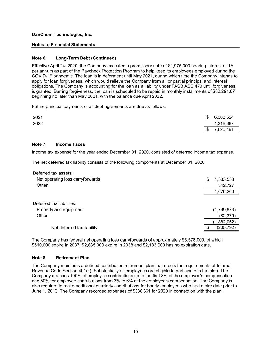 DanChem Technologies, Inc. Notes to Financial Statements 10 Note 6. Long-Term Debt (Continued) Effective April 24, 2020, the Company executed a promissory note of $1,975,000 bearing interest at 1% per annum as part of the Paycheck Protection Program to help keep its employees employed during the COVID-19 pandemic. The loan is in deferment until May 2021, during which time the Company intends to apply for loan forgiveness, which would relieve the Company from all or partial principal and interest obligations. The Company is accounting for the loan as a liability under FASB ASC 470 until forgiveness is granted. Barring forgiveness, the loan is scheduled to be repaid in monthly installments of $82,291.67 beginning no later than May 2021, with the balance due April 2022. Future principal payments of all debt agreements are due as follows: 2021 6,303,524 $ 2022 1,316,667 7,620,191 $ Note 7. Income Taxes Income tax expense for the year ended December 31, 2020, consisted of deferred income tax expense. The net deferred tax liability consists of the following components at December 31, 2020: Deferred tax assets: Net operating loss carryforwards 1,333,533 $ Other 342,727 1,676,260 Deferred tax liabilities: Property and equipment (1,799,673) Other (82,379) (1,882,052) Net deferred tax liability (205,792) $ The Company has federal net operating loss carryforwards of approximately $5,578,000, of which $510,000 expire in 2037, $2,885,000 expire in 2038 and $2,183,000 has no expiration date. Note 8. Retirement Plan The Company maintains a defined contribution retirement plan that meets the requirements of Internal Revenue Code Section 401(k). Substantially all employees are eligible to participate in the plan. The Company matches 100% of employee contributions up to the first 3% of the employee's compensation and 50% for employee contributions from 3% to 6% of the employee's compensation. The Company is also required to make additional quarterly contributions for hourly employees who had a hire date prior to June 1, 2013. The Company recorded expenses of $338,661 for 2020 in connection with the plan.