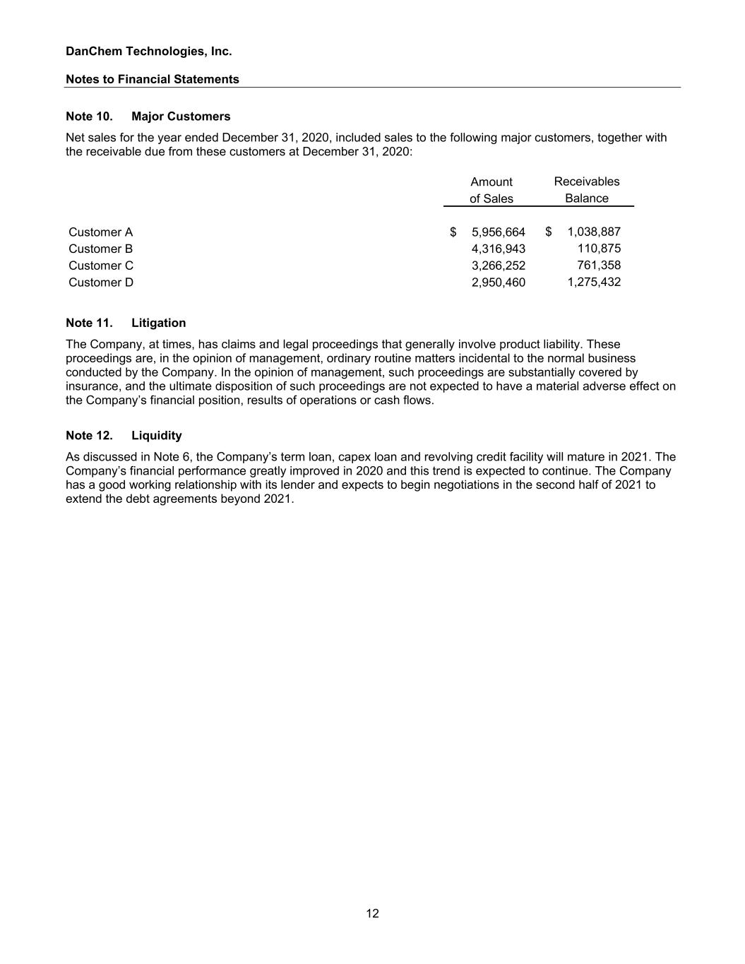 DanChem Technologies, Inc. Notes to Financial Statements 12 Note 10. Major Customers Net sales for the year ended December 31, 2020, included sales to the following major customers, together with the receivable due from these customers at December 31, 2020: Amount Receivables of Sales Balance Customer A 5,956,664 $ 1,038,887 $ Customer B 4,316,943 110,875 Customer C 3,266,252 761,358 Customer D 2,950,460 1,275,432 Note 11. Litigation The Company, at times, has claims and legal proceedings that generally involve product liability. These proceedings are, in the opinion of management, ordinary routine matters incidental to the normal business conducted by the Company. In the opinion of management, such proceedings are substantially covered by insurance, and the ultimate disposition of such proceedings are not expected to have a material adverse effect on the Company’s financial position, results of operations or cash flows. Note 12. Liquidity As discussed in Note 6, the Company’s term loan, capex loan and revolving credit facility will mature in 2021. The Company’s financial performance greatly improved in 2020 and this trend is expected to continue. The Company has a good working relationship with its lender and expects to begin negotiations in the second half of 2021 to extend the debt agreements beyond 2021.