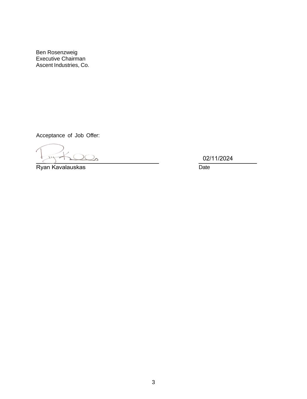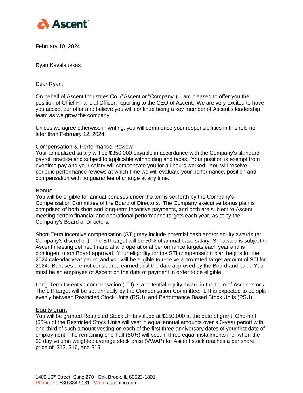 February 10, 2024 Ryan Kavalauskas Dear Ryan, On behalf of Ascent Industries Co. ("Ascent or "Company"), I am pleased to offer you the position of Chief Financial Officer, reporting to the CEO of Ascent. We are very excited to have you accept our offer and believe you will continue being a key member of Ascent's leadership team as we grow the company. Unless we agree otherwise in writing, you will commence your responsibilities in this role no later than February 12, 2024. Compensation & Performance Review Your annualized salary will be $350,000 payable in accordance with the Company's standard payroll practice and subject to applicable withholding and taxes. Your position is exempt from overtime pay and your salary will compensate you for all hours worked. You will receive periodic performance reviews at which time we will evaluate your performance, position and compensation with no guarantee of change at any time. Bonus You will be eligible for annual bonuses under the terms set forth by the Company's Compensation Committee of the Board of Directors. The Company executive bonus plan is comprised of both short and long-term incentive payments, and both are subject to Ascent meeting certain financial and operational performance targets each year, as et by the Company's Board of Directors. Short-Term Incentive compensation (STI) may include potential cash and/or equity awards (at Company's discretion). The STI target will be 50% of annual base salary. STI award is subject to Ascent meeting defined financial and operational performance targets each year and is contingent upon Board approval. Your eligibility for the STI compensation plan begins for the 2024 calendar year period and you will be eligible to receive a pro-rated target amount of STI for 2024. Bonuses are not considered earned until the date approved by the Board and paid. You must be an employee of Ascent on the date of payment in order to be eligible. Long-Term Incentive compensation (LTI) is a potential equity award in the form of Ascent stock. The LTI target will be set annually by the Compensation Committee. LTI is expected to be split evenly between Restricted Stock Units (RSU), and Performance Based Stock Units (PSU). Equity grant You will be granted Restricted Stock Units valued at $150,000 at the date of grant. One-half (50%) of the Restricted Stock Units will vest in equal annual amounts over a 3-year period with one-third of such amount vesting on each of the first three anniversary dates of your first date of employment. The remaining one-half (50%) will vest in three equal installments if or when the 30 day volume weighted average stock price (VWAP) for Ascent stock reaches a per share price of: $13, $16, and $19. 1400 16th Street, Suite 270 I Oak Brook, IL 60523-1801 Phone: +1.630.884.9181 I Web: ascentco.com