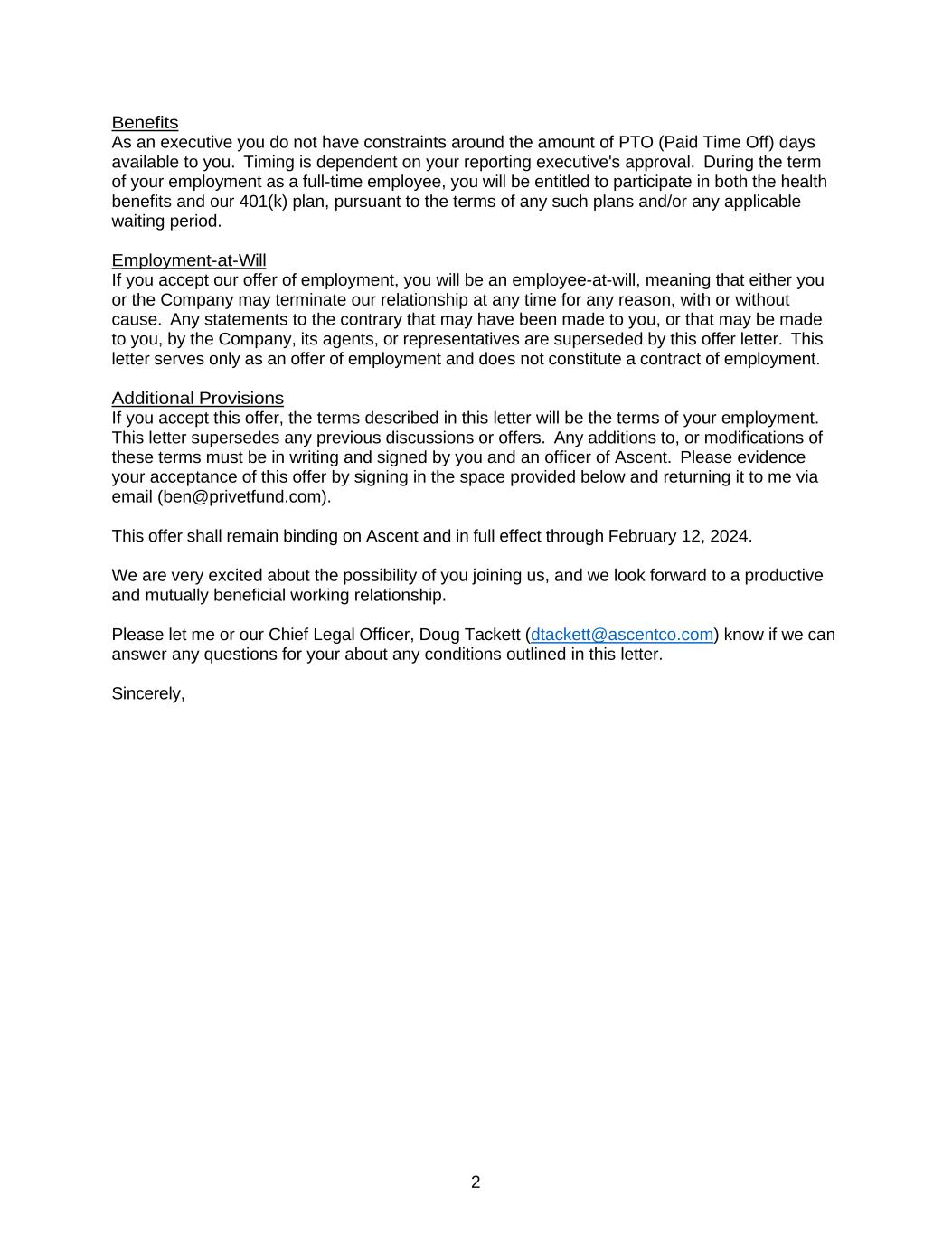 2 Benefits As an executive you do not have constraints around the amount of PTO (Paid Time Off) days available to you. Timing is dependent on your reporting executive's approval. During the term of your employment as a full-time employee, you will be entitled to participate in both the health benefits and our 401(k) plan, pursuant to the terms of any such plans and/or any applicable waiting period. Employment-at-Will If you accept our offer of employment, you will be an employee-at-will, meaning that either you or the Company may terminate our relationship at any time for any reason, with or without cause. Any statements to the contrary that may have been made to you, or that may be made to you, by the Company, its agents, or representatives are superseded by this offer letter. This letter serves only as an offer of employment and does not constitute a contract of employment. Additional Provisions If you accept this offer, the terms described in this letter will be the terms of your employment. This letter supersedes any previous discussions or offers. Any additions to, or modifications of these terms must be in writing and signed by you and an officer of Ascent. Please evidence your acceptance of this offer by signing in the space provided below and returning it to me via email (ben@privetfund.com). This offer shall remain binding on Ascent and in full effect through February 12, 2024. We are very excited about the possibility of you joining us, and we look forward to a productive and mutually beneficial working relationship. Please let me or our Chief Legal Officer, Doug Tackett (dtackett@ascentco.com) know if we can answer any questions for your about any conditions outlined in this letter. Sincerely,