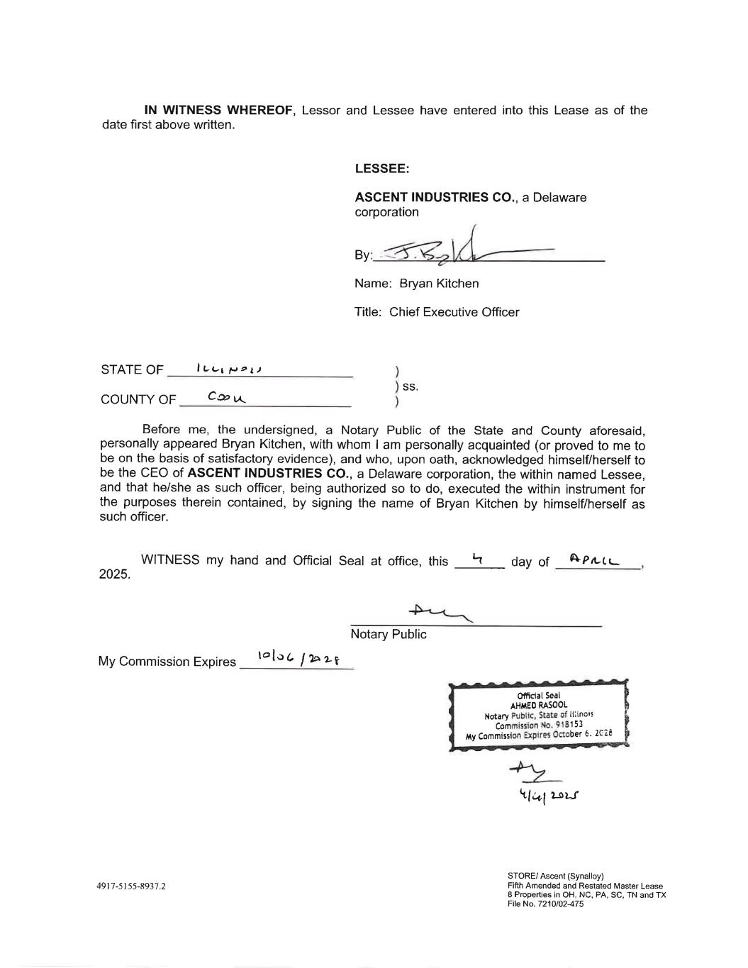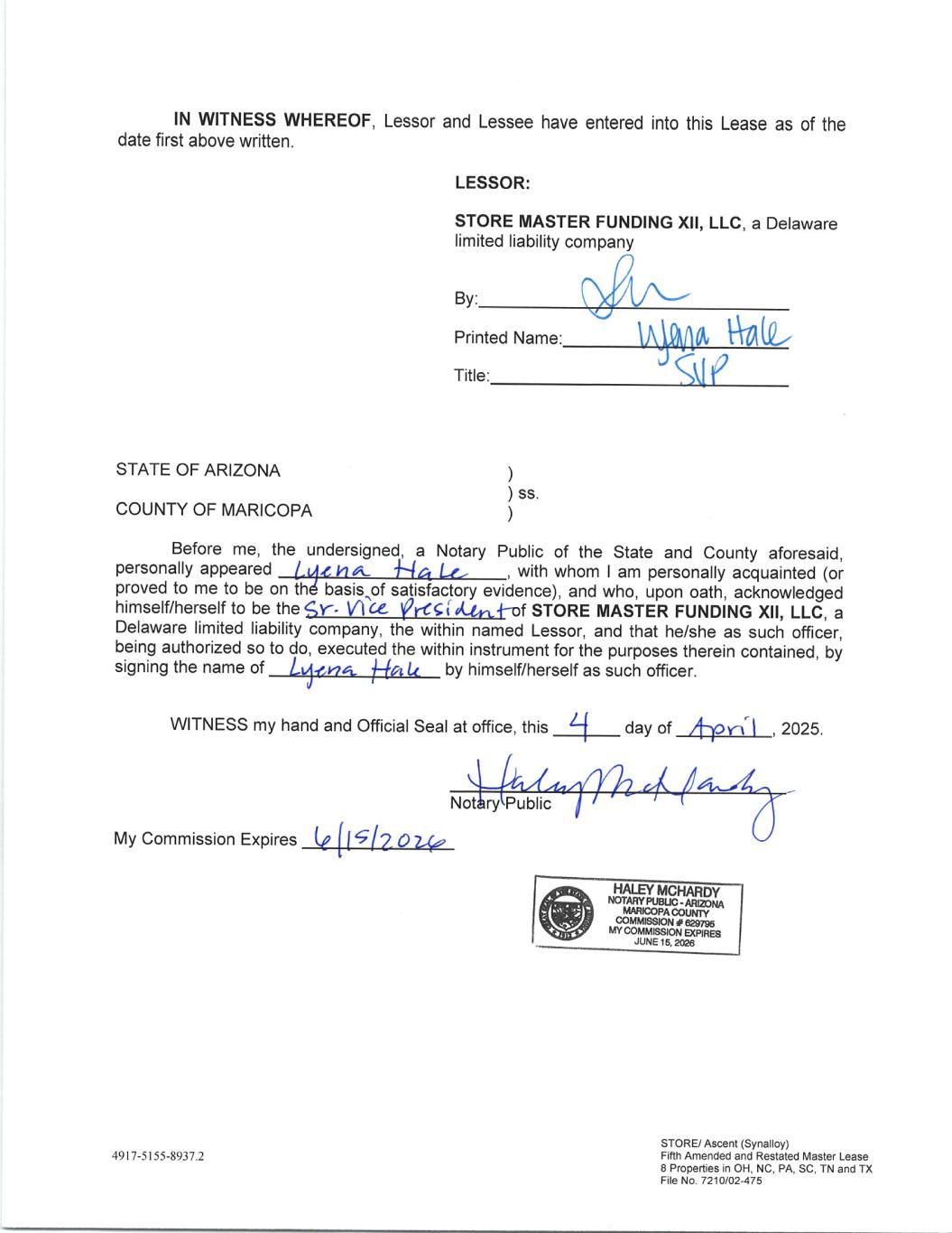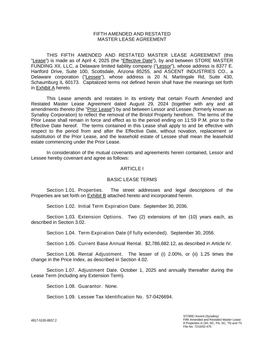 STORE/ Ascent (Synalloy) Fifth Amended and Restated Master Lease 8 Properties in OH, NC, PA, SC, TN and TX File No. 7210/02-475 4917-5155-8937.2 FIFTH AMENDED AND RESTATED MASTER LEASE AGREEMENT THIS FIFTH AMENDED AND RESTATED MASTER LEASE AGREEMENT (this “Lease”) is made as of April 4, 2025 (the “Effective Date”), by and between STORE MASTER FUNDING XII, LLC, a Delaware limited liability company (“Lessor”), whose address is 8377 E. Hartford Drive, Suite 100, Scottsdale, Arizona 85255, and ASCENT INDUSTRIES CO., a Delaware corporation (“Lessee”), whose address is 20 N. Martingale Rd, Suite 430, Schaumburg IL 60173. Capitalized terms not defined herein shall have the meanings set forth in Exhibit A hereto. This Lease amends and restates in its entirety that certain Fourth Amended and Restated Master Lease Agreement dated August 29, 2024 (together with any and all amendments thereto (the "Prior Lease") by and between Lessor and Lessee (formerly known as Synalloy Corporation) to reflect the removal of the Bristol Property herefrom. The terms of the Prior Lease shall remain in force and effect as to the period ending on 11:59 P.M. prior to the Effective Date hereof. The terms contained in this Lease shall apply to and be effective with respect to the period from and after the Effective Date, without novation, replacement or substitution of the Prior Lease, and the leasehold estate of Lessee shall mean the leasehold estate commencing under the Prior Lease. In consideration of the mutual covenants and agreements herein contained, Lessor and Lessee hereby covenant and agree as follows: ARTICLE I BASIC LEASE TERMS Section 1.01. Properties. The street addresses and legal descriptions of the Properties are set forth on Exhibit B attached hereto and incorporated herein. Section 1.02. Initial Term Expiration Date. September 30, 2036. Section 1.03. Extension Options. Two (2) extensions of ten (10) years each, as described in Section 3.02. Section 1.04. Term Expiration Date (if fully extended). September 30, 2056. Section 1.05. Current Base Annual Rental. $2,786,682.12, as described in Article IV. Section 1.06. Rental Adjustment. The lesser of (i) 2.00%, or (ii) 1.25 times the change in the Price Index, as described in Section 4.02. Section 1.07. Adjustment Date. October 1, 2025 and annually thereafter during the Lease Term (including any Extension Term). Section 1.08. Guarantor. None. Section 1.09. Lessee Tax Identification No. 57-0426694.