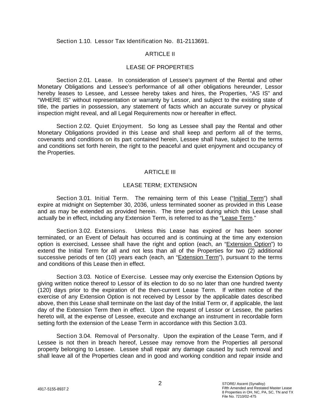 STORE/ Ascent (Synalloy) Fifth Amended and Restated Master Lease 8 Properties in OH, NC, PA, SC, TN and TX File No. 7210/02-475 2 4917-5155-8937.2 Section 1.10. Lessor Tax Identification No. 81-2113691. ARTICLE II LEASE OF PROPERTIES Section 2.01. Lease. In consideration of Lessee’s payment of the Rental and other Monetary Obligations and Lessee’s performance of all other obligations hereunder, Lessor hereby leases to Lessee, and Lessee hereby takes and hires, the Properties, “AS IS” and “WHERE IS” without representation or warranty by Lessor, and subject to the existing state of title, the parties in possession, any statement of facts which an accurate survey or physical inspection might reveal, and all Legal Requirements now or hereafter in effect. Section 2.02. Quiet Enjoyment. So long as Lessee shall pay the Rental and other Monetary Obligations provided in this Lease and shall keep and perform all of the terms, covenants and conditions on its part contained herein, Lessee shall have, subject to the terms and conditions set forth herein, the right to the peaceful and quiet enjoyment and occupancy of the Properties. ARTICLE III LEASE TERM; EXTENSION Section 3.01. Initial Term. The remaining term of this Lease (“Initial Term”) shall expire at midnight on September 30, 2036, unless terminated sooner as provided in this Lease and as may be extended as provided herein. The time period during which this Lease shall actually be in effect, including any Extension Term, is referred to as the “Lease Term.” Section 3.02. Extensions. Unless this Lease has expired or has been sooner terminated, or an Event of Default has occurred and is continuing at the time any extension option is exercised, Lessee shall have the right and option (each, an “Extension Option”) to extend the Initial Term for all and not less than all of the Properties for two (2) additional successive periods of ten (10) years each (each, an “Extension Term”), pursuant to the terms and conditions of this Lease then in effect. Section 3.03. Notice of Exercise. Lessee may only exercise the Extension Options by giving written notice thereof to Lessor of its election to do so no later than one hundred twenty (120) days prior to the expiration of the then-current Lease Term. If written notice of the exercise of any Extension Option is not received by Lessor by the applicable dates described above, then this Lease shall terminate on the last day of the Initial Term or, if applicable, the last day of the Extension Term then in effect. Upon the request of Lessor or Lessee, the parties hereto will, at the expense of Lessee, execute and exchange an instrument in recordable form setting forth the extension of the Lease Term in accordance with this Section 3.03. Section 3.04. Removal of Personalty. Upon the expiration of the Lease Term, and if Lessee is not then in breach hereof, Lessee may remove from the Properties all personal property belonging to Lessee. Lessee shall repair any damage caused by such removal and shall leave all of the Properties clean and in good and working condition and repair inside and