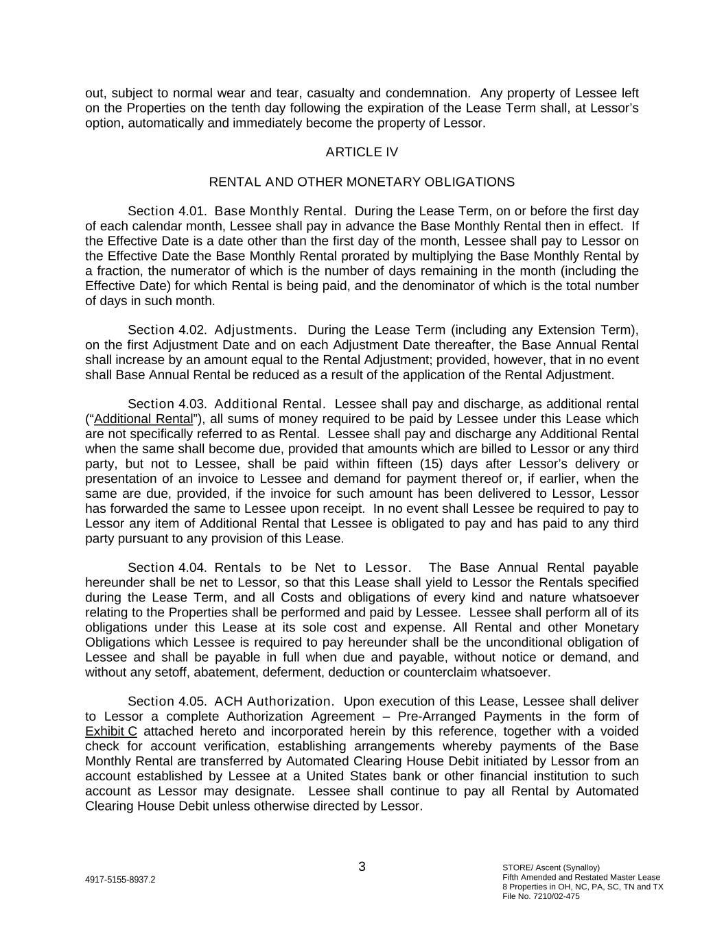 STORE/ Ascent (Synalloy) Fifth Amended and Restated Master Lease 8 Properties in OH, NC, PA, SC, TN and TX File No. 7210/02-475 3 4917-5155-8937.2 out, subject to normal wear and tear, casualty and condemnation. Any property of Lessee left on the Properties on the tenth day following the expiration of the Lease Term shall, at Lessor’s option, automatically and immediately become the property of Lessor. ARTICLE IV RENTAL AND OTHER MONETARY OBLIGATIONS Section 4.01. Base Monthly Rental. During the Lease Term, on or before the first day of each calendar month, Lessee shall pay in advance the Base Monthly Rental then in effect. If the Effective Date is a date other than the first day of the month, Lessee shall pay to Lessor on the Effective Date the Base Monthly Rental prorated by multiplying the Base Monthly Rental by a fraction, the numerator of which is the number of days remaining in the month (including the Effective Date) for which Rental is being paid, and the denominator of which is the total number of days in such month. Section 4.02. Adjustments. During the Lease Term (including any Extension Term), on the first Adjustment Date and on each Adjustment Date thereafter, the Base Annual Rental shall increase by an amount equal to the Rental Adjustment; provided, however, that in no event shall Base Annual Rental be reduced as a result of the application of the Rental Adjustment. Section 4.03. Additional Rental. Lessee shall pay and discharge, as additional rental (“Additional Rental”), all sums of money required to be paid by Lessee under this Lease which are not specifically referred to as Rental. Lessee shall pay and discharge any Additional Rental when the same shall become due, provided that amounts which are billed to Lessor or any third party, but not to Lessee, shall be paid within fifteen (15) days after Lessor’s delivery or presentation of an invoice to Lessee and demand for payment thereof or, if earlier, when the same are due, provided, if the invoice for such amount has been delivered to Lessor, Lessor has forwarded the same to Lessee upon receipt. In no event shall Lessee be required to pay to Lessor any item of Additional Rental that Lessee is obligated to pay and has paid to any third party pursuant to any provision of this Lease. Section 4.04. Rentals to be Net to Lessor. The Base Annual Rental payable hereunder shall be net to Lessor, so that this Lease shall yield to Lessor the Rentals specified during the Lease Term, and all Costs and obligations of every kind and nature whatsoever relating to the Properties shall be performed and paid by Lessee. Lessee shall perform all of its obligations under this Lease at its sole cost and expense. All Rental and other Monetary Obligations which Lessee is required to pay hereunder shall be the unconditional obligation of Lessee and shall be payable in full when due and payable, without notice or demand, and without any setoff, abatement, deferment, deduction or counterclaim whatsoever. Section 4.05. ACH Authorization. Upon execution of this Lease, Lessee shall deliver to Lessor a complete Authorization Agreement – Pre-Arranged Payments in the form of Exhibit C attached hereto and incorporated herein by this reference, together with a voided check for account verification, establishing arrangements whereby payments of the Base Monthly Rental are transferred by Automated Clearing House Debit initiated by Lessor from an account established by Lessee at a United States bank or other financial institution to such account as Lessor may designate. Lessee shall continue to pay all Rental by Automated Clearing House Debit unless otherwise directed by Lessor.