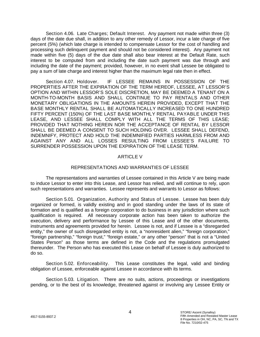 STORE/ Ascent (Synalloy) Fifth Amended and Restated Master Lease 8 Properties in OH, NC, PA, SC, TN and TX File No. 7210/02-475 4 4917-5155-8937.2 Section 4.06. Late Charges; Default Interest. Any payment not made within three (3) days of the date due shall, in addition to any other remedy of Lessor, incur a late charge of five percent (5%) (which late charge is intended to compensate Lessor for the cost of handling and processing such delinquent payment and should not be considered interest). Any payment not made within five (5) days of the due date shall also bear interest at the Default Rate, such interest to be computed from and including the date such payment was due through and including the date of the payment; provided, however, in no event shall Lessee be obligated to pay a sum of late charge and interest higher than the maximum legal rate then in effect. Section 4.07. Holdover. IF LESSEE REMAINS IN POSSESSION OF THE PROPERTIES AFTER THE EXPIRATION OF THE TERM HEREOF, LESSEE, AT LESSOR’S OPTION AND WITHIN LESSOR’S SOLE DISCRETION, MAY BE DEEMED A TENANT ON A MONTH-TO-MONTH BASIS AND SHALL CONTINUE TO PAY RENTALS AND OTHER MONETARY OBLIGATIONS IN THE AMOUNTS HEREIN PROVIDED, EXCEPT THAT THE BASE MONTHLY RENTAL SHALL BE AUTOMATICALLY INCREASED TO ONE HUNDRED FIFTY PERCENT (150%) OF THE LAST BASE MONTHLY RENTAL PAYABLE UNDER THIS LEASE, AND LESSEE SHALL COMPLY WITH ALL THE TERMS OF THIS LEASE; PROVIDED THAT NOTHING HEREIN NOR THE ACCEPTANCE OF RENTAL BY LESSOR SHALL BE DEEMED A CONSENT TO SUCH HOLDING OVER. LESSEE SHALL DEFEND, INDEMNIFY, PROTECT AND HOLD THE INDEMNIFIED PARTIES HARMLESS FROM AND AGAINST ANY AND ALL LOSSES RESULTING FROM LESSEE’S FAILURE TO SURRENDER POSSESSION UPON THE EXPIRATION OF THE LEASE TERM. ARTICLE V REPRESENTATIONS AND WARRANTIES OF LESSEE The representations and warranties of Lessee contained in this Article V are being made to induce Lessor to enter into this Lease, and Lessor has relied, and will continue to rely, upon such representations and warranties. Lessee represents and warrants to Lessor as follows: Section 5.01. Organization, Authority and Status of Lessee. Lessee has been duly organized or formed, is validly existing and in good standing under the laws of its state of formation and is qualified as a foreign corporation to do business in any jurisdiction where such qualification is required. All necessary corporate action has been taken to authorize the execution, delivery and performance by Lessee of this Lease and of the other documents, instruments and agreements provided for herein. Lessee is not, and if Lessee is a “disregarded entity,” the owner of such disregarded entity is not, a “nonresident alien,” “foreign corporation,” “foreign partnership,” “foreign trust,” “foreign estate,” or any other “person” that is not a “United States Person” as those terms are defined in the Code and the regulations promulgated thereunder. The Person who has executed this Lease on behalf of Lessee is duly authorized to do so. Section 5.02. Enforceability. This Lease constitutes the legal, valid and binding obligation of Lessee, enforceable against Lessee in accordance with its terms. Section 5.03. Litigation. There are no suits, actions, proceedings or investigations pending, or to the best of its knowledge, threatened against or involving any Lessee Entity or