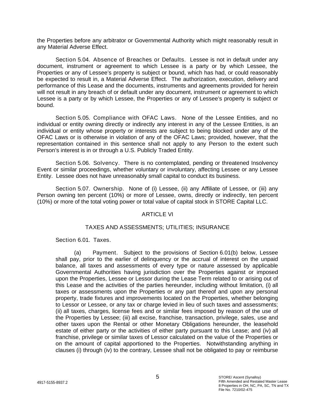 STORE/ Ascent (Synalloy) Fifth Amended and Restated Master Lease 8 Properties in OH, NC, PA, SC, TN and TX File No. 7210/02-475 5 4917-5155-8937.2 the Properties before any arbitrator or Governmental Authority which might reasonably result in any Material Adverse Effect. Section 5.04. Absence of Breaches or Defaults. Lessee is not in default under any document, instrument or agreement to which Lessee is a party or by which Lessee, the Properties or any of Lessee’s property is subject or bound, which has had, or could reasonably be expected to result in, a Material Adverse Effect. The authorization, execution, delivery and performance of this Lease and the documents, instruments and agreements provided for herein will not result in any breach of or default under any document, instrument or agreement to which Lessee is a party or by which Lessee, the Properties or any of Lessee’s property is subject or bound. Section 5.05. Compliance with OFAC Laws. None of the Lessee Entities, and no individual or entity owning directly or indirectly any interest in any of the Lessee Entities, is an individual or entity whose property or interests are subject to being blocked under any of the OFAC Laws or is otherwise in violation of any of the OFAC Laws; provided, however, that the representation contained in this sentence shall not apply to any Person to the extent such Person’s interest is in or through a U.S. Publicly Traded Entity. Section 5.06. Solvency. There is no contemplated, pending or threatened Insolvency Event or similar proceedings, whether voluntary or involuntary, affecting Lessee or any Lessee Entity. Lessee does not have unreasonably small capital to conduct its business. Section 5.07. Ownership. None of (i) Lessee, (ii) any Affiliate of Lessee, or (iii) any Person owning ten percent (10%) or more of Lessee, owns, directly or indirectly, ten percent (10%) or more of the total voting power or total value of capital stock in STORE Capital LLC. ARTICLE VI TAXES AND ASSESSMENTS; UTILITIES; INSURANCE Section 6.01. Taxes. (a) Payment. Subject to the provisions of Section 6.01(b) below, Lessee shall pay, prior to the earlier of delinquency or the accrual of interest on the unpaid balance, all taxes and assessments of every type or nature assessed by applicable Governmental Authorities having jurisdiction over the Properties against or imposed upon the Properties, Lessee or Lessor during the Lease Term related to or arising out of this Lease and the activities of the parties hereunder, including without limitation, (i) all taxes or assessments upon the Properties or any part thereof and upon any personal property, trade fixtures and improvements located on the Properties, whether belonging to Lessor or Lessee, or any tax or charge levied in lieu of such taxes and assessments; (ii) all taxes, charges, license fees and or similar fees imposed by reason of the use of the Properties by Lessee; (iii) all excise, franchise, transaction, privilege, sales, use and other taxes upon the Rental or other Monetary Obligations hereunder, the leasehold estate of either party or the activities of either party pursuant to this Lease; and (iv) all franchise, privilege or similar taxes of Lessor calculated on the value of the Properties or on the amount of capital apportioned to the Properties. Notwithstanding anything in clauses (i) through (iv) to the contrary, Lessee shall not be obligated to pay or reimburse