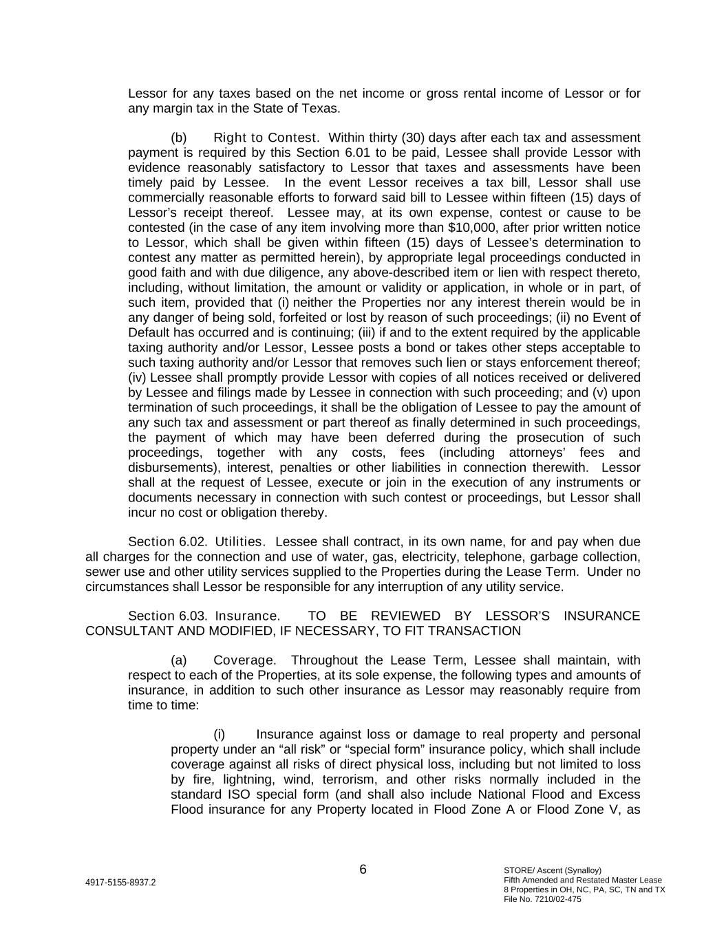 STORE/ Ascent (Synalloy) Fifth Amended and Restated Master Lease 8 Properties in OH, NC, PA, SC, TN and TX File No. 7210/02-475 6 4917-5155-8937.2 Lessor for any taxes based on the net income or gross rental income of Lessor or for any margin tax in the State of Texas. (b) Right to Contest. Within thirty (30) days after each tax and assessment payment is required by this Section 6.01 to be paid, Lessee shall provide Lessor with evidence reasonably satisfactory to Lessor that taxes and assessments have been timely paid by Lessee. In the event Lessor receives a tax bill, Lessor shall use commercially reasonable efforts to forward said bill to Lessee within fifteen (15) days of Lessor’s receipt thereof. Lessee may, at its own expense, contest or cause to be contested (in the case of any item involving more than $10,000, after prior written notice to Lessor, which shall be given within fifteen (15) days of Lessee’s determination to contest any matter as permitted herein), by appropriate legal proceedings conducted in good faith and with due diligence, any above-described item or lien with respect thereto, including, without limitation, the amount or validity or application, in whole or in part, of such item, provided that (i) neither the Properties nor any interest therein would be in any danger of being sold, forfeited or lost by reason of such proceedings; (ii) no Event of Default has occurred and is continuing; (iii) if and to the extent required by the applicable taxing authority and/or Lessor, Lessee posts a bond or takes other steps acceptable to such taxing authority and/or Lessor that removes such lien or stays enforcement thereof; (iv) Lessee shall promptly provide Lessor with copies of all notices received or delivered by Lessee and filings made by Lessee in connection with such proceeding; and (v) upon termination of such proceedings, it shall be the obligation of Lessee to pay the amount of any such tax and assessment or part thereof as finally determined in such proceedings, the payment of which may have been deferred during the prosecution of such proceedings, together with any costs, fees (including attorneys’ fees and disbursements), interest, penalties or other liabilities in connection therewith. Lessor shall at the request of Lessee, execute or join in the execution of any instruments or documents necessary in connection with such contest or proceedings, but Lessor shall incur no cost or obligation thereby. Section 6.02. Utilities. Lessee shall contract, in its own name, for and pay when due all charges for the connection and use of water, gas, electricity, telephone, garbage collection, sewer use and other utility services supplied to the Properties during the Lease Term. Under no circumstances shall Lessor be responsible for any interruption of any utility service. Section 6.03. Insurance. TO BE REVIEWED BY LESSOR’S INSURANCE CONSULTANT AND MODIFIED, IF NECESSARY, TO FIT TRANSACTION (a) Coverage. Throughout the Lease Term, Lessee shall maintain, with respect to each of the Properties, at its sole expense, the following types and amounts of insurance, in addition to such other insurance as Lessor may reasonably require from time to time: (i) Insurance against loss or damage to real property and personal property under an “all risk” or “special form” insurance policy, which shall include coverage against all risks of direct physical loss, including but not limited to loss by fire, lightning, wind, terrorism, and other risks normally included in the standard ISO special form (and shall also include National Flood and Excess Flood insurance for any Property located in Flood Zone A or Flood Zone V, as