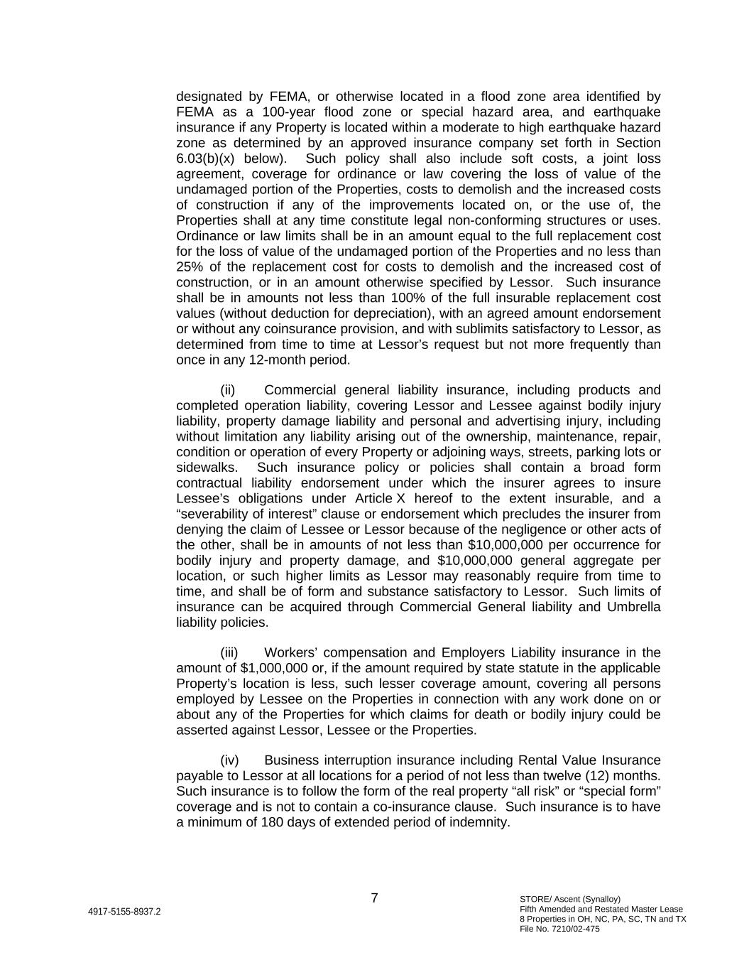STORE/ Ascent (Synalloy) Fifth Amended and Restated Master Lease 8 Properties in OH, NC, PA, SC, TN and TX File No. 7210/02-475 7 4917-5155-8937.2 designated by FEMA, or otherwise located in a flood zone area identified by FEMA as a 100-year flood zone or special hazard area, and earthquake insurance if any Property is located within a moderate to high earthquake hazard zone as determined by an approved insurance company set forth in Section 6.03(b)(x) below). Such policy shall also include soft costs, a joint loss agreement, coverage for ordinance or law covering the loss of value of the undamaged portion of the Properties, costs to demolish and the increased costs of construction if any of the improvements located on, or the use of, the Properties shall at any time constitute legal non-conforming structures or uses. Ordinance or law limits shall be in an amount equal to the full replacement cost for the loss of value of the undamaged portion of the Properties and no less than 25% of the replacement cost for costs to demolish and the increased cost of construction, or in an amount otherwise specified by Lessor. Such insurance shall be in amounts not less than 100% of the full insurable replacement cost values (without deduction for depreciation), with an agreed amount endorsement or without any coinsurance provision, and with sublimits satisfactory to Lessor, as determined from time to time at Lessor’s request but not more frequently than once in any 12-month period. (ii) Commercial general liability insurance, including products and completed operation liability, covering Lessor and Lessee against bodily injury liability, property damage liability and personal and advertising injury, including without limitation any liability arising out of the ownership, maintenance, repair, condition or operation of every Property or adjoining ways, streets, parking lots or sidewalks. Such insurance policy or policies shall contain a broad form contractual liability endorsement under which the insurer agrees to insure Lessee’s obligations under Article X hereof to the extent insurable, and a “severability of interest” clause or endorsement which precludes the insurer from denying the claim of Lessee or Lessor because of the negligence or other acts of the other, shall be in amounts of not less than $10,000,000 per occurrence for bodily injury and property damage, and $10,000,000 general aggregate per location, or such higher limits as Lessor may reasonably require from time to time, and shall be of form and substance satisfactory to Lessor. Such limits of insurance can be acquired through Commercial General liability and Umbrella liability policies. (iii) Workers’ compensation and Employers Liability insurance in the amount of $1,000,000 or, if the amount required by state statute in the applicable Property’s location is less, such lesser coverage amount, covering all persons employed by Lessee on the Properties in connection with any work done on or about any of the Properties for which claims for death or bodily injury could be asserted against Lessor, Lessee or the Properties. (iv) Business interruption insurance including Rental Value Insurance payable to Lessor at all locations for a period of not less than twelve (12) months. Such insurance is to follow the form of the real property “all risk” or “special form” coverage and is not to contain a co-insurance clause. Such insurance is to have a minimum of 180 days of extended period of indemnity.