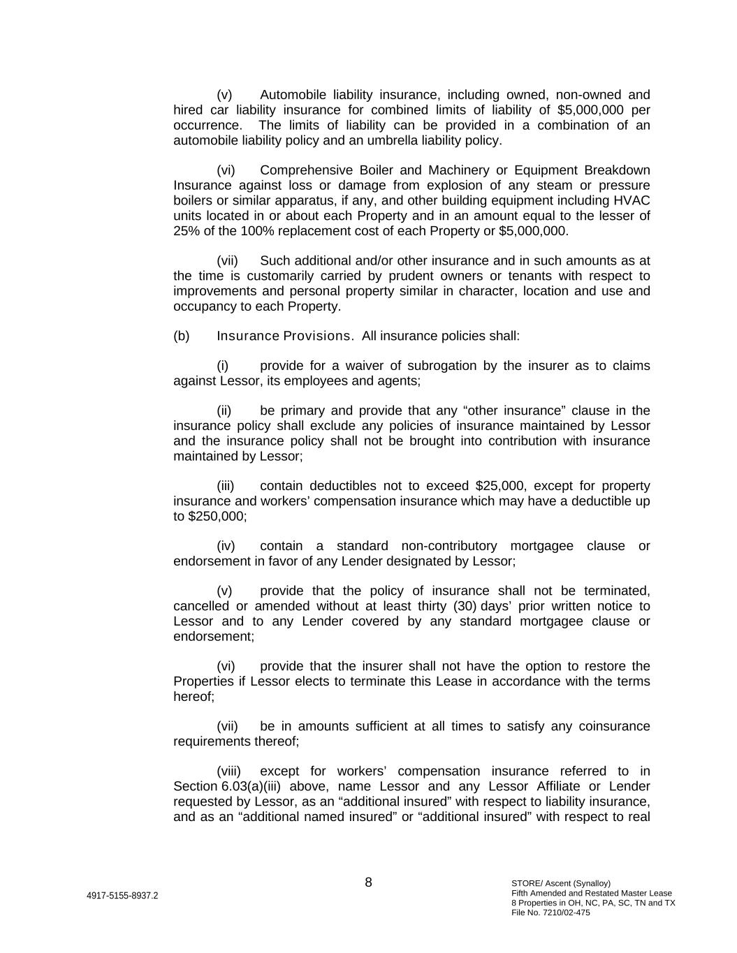 STORE/ Ascent (Synalloy) Fifth Amended and Restated Master Lease 8 Properties in OH, NC, PA, SC, TN and TX File No. 7210/02-475 8 4917-5155-8937.2 (v) Automobile liability insurance, including owned, non-owned and hired car liability insurance for combined limits of liability of $5,000,000 per occurrence. The limits of liability can be provided in a combination of an automobile liability policy and an umbrella liability policy. (vi) Comprehensive Boiler and Machinery or Equipment Breakdown Insurance against loss or damage from explosion of any steam or pressure boilers or similar apparatus, if any, and other building equipment including HVAC units located in or about each Property and in an amount equal to the lesser of 25% of the 100% replacement cost of each Property or $5,000,000. (vii) Such additional and/or other insurance and in such amounts as at the time is customarily carried by prudent owners or tenants with respect to improvements and personal property similar in character, location and use and occupancy to each Property. (b) Insurance Provisions. All insurance policies shall: (i) provide for a waiver of subrogation by the insurer as to claims against Lessor, its employees and agents; (ii) be primary and provide that any “other insurance” clause in the insurance policy shall exclude any policies of insurance maintained by Lessor and the insurance policy shall not be brought into contribution with insurance maintained by Lessor; (iii) contain deductibles not to exceed $25,000, except for property insurance and workers’ compensation insurance which may have a deductible up to $250,000; (iv) contain a standard non-contributory mortgagee clause or endorsement in favor of any Lender designated by Lessor; (v) provide that the policy of insurance shall not be terminated, cancelled or amended without at least thirty (30) days’ prior written notice to Lessor and to any Lender covered by any standard mortgagee clause or endorsement; (vi) provide that the insurer shall not have the option to restore the Properties if Lessor elects to terminate this Lease in accordance with the terms hereof; (vii) be in amounts sufficient at all times to satisfy any coinsurance requirements thereof; (viii) except for workers’ compensation insurance referred to in Section 6.03(a)(iii) above, name Lessor and any Lessor Affiliate or Lender requested by Lessor, as an “additional insured” with respect to liability insurance, and as an “additional named insured” or “additional insured” with respect to real