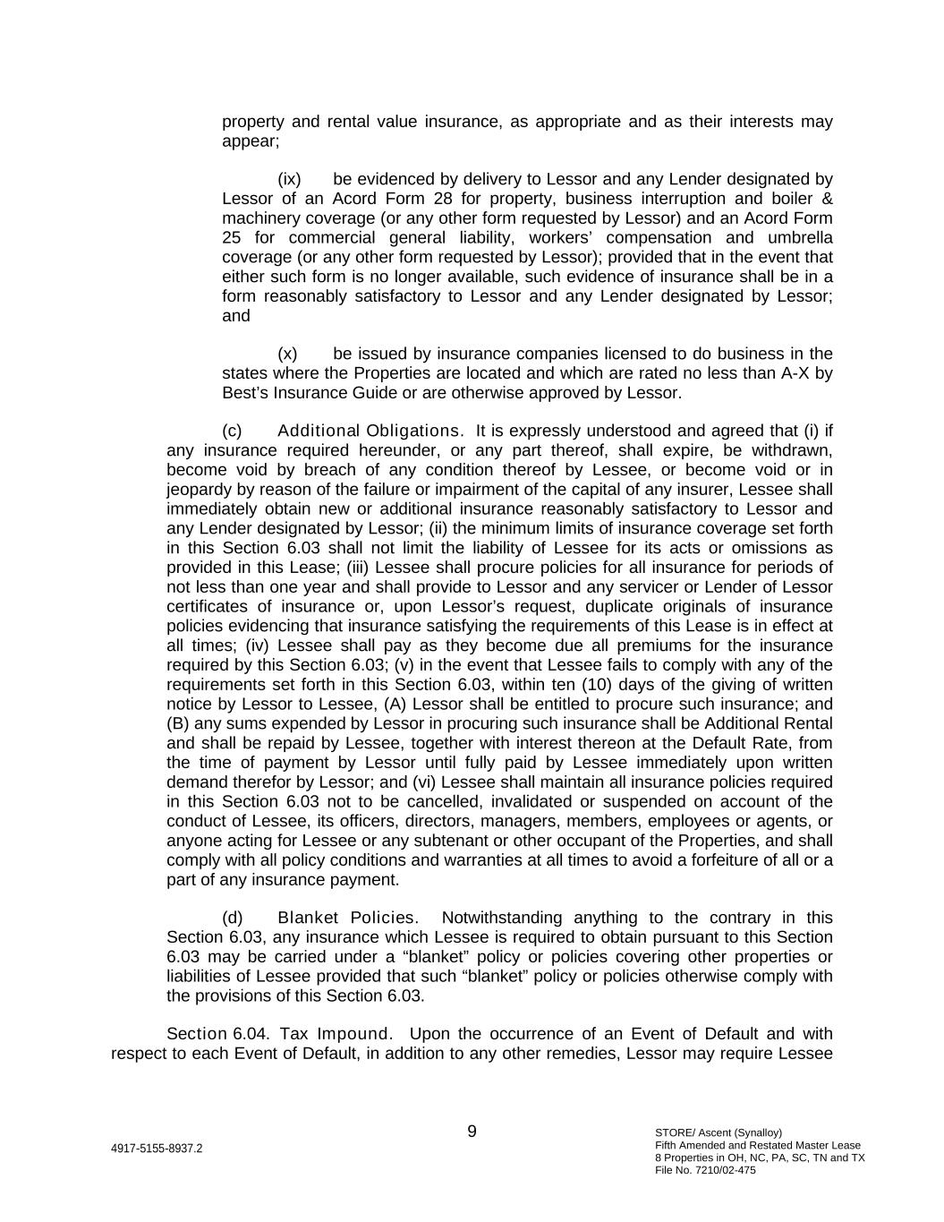 STORE/ Ascent (Synalloy) Fifth Amended and Restated Master Lease 8 Properties in OH, NC, PA, SC, TN and TX File No. 7210/02-475 9 4917-5155-8937.2 property and rental value insurance, as appropriate and as their interests may appear; (ix) be evidenced by delivery to Lessor and any Lender designated by Lessor of an Acord Form 28 for property, business interruption and boiler & machinery coverage (or any other form requested by Lessor) and an Acord Form 25 for commercial general liability, workers’ compensation and umbrella coverage (or any other form requested by Lessor); provided that in the event that either such form is no longer available, such evidence of insurance shall be in a form reasonably satisfactory to Lessor and any Lender designated by Lessor; and (x) be issued by insurance companies licensed to do business in the states where the Properties are located and which are rated no less than A-X by Best’s Insurance Guide or are otherwise approved by Lessor. (c) Additional Obligations. It is expressly understood and agreed that (i) if any insurance required hereunder, or any part thereof, shall expire, be withdrawn, become void by breach of any condition thereof by Lessee, or become void or in jeopardy by reason of the failure or impairment of the capital of any insurer, Lessee shall immediately obtain new or additional insurance reasonably satisfactory to Lessor and any Lender designated by Lessor; (ii) the minimum limits of insurance coverage set forth in this Section 6.03 shall not limit the liability of Lessee for its acts or omissions as provided in this Lease; (iii) Lessee shall procure policies for all insurance for periods of not less than one year and shall provide to Lessor and any servicer or Lender of Lessor certificates of insurance or, upon Lessor’s request, duplicate originals of insurance policies evidencing that insurance satisfying the requirements of this Lease is in effect at all times; (iv) Lessee shall pay as they become due all premiums for the insurance required by this Section 6.03; (v) in the event that Lessee fails to comply with any of the requirements set forth in this Section 6.03, within ten (10) days of the giving of written notice by Lessor to Lessee, (A) Lessor shall be entitled to procure such insurance; and (B) any sums expended by Lessor in procuring such insurance shall be Additional Rental and shall be repaid by Lessee, together with interest thereon at the Default Rate, from the time of payment by Lessor until fully paid by Lessee immediately upon written demand therefor by Lessor; and (vi) Lessee shall maintain all insurance policies required in this Section 6.03 not to be cancelled, invalidated or suspended on account of the conduct of Lessee, its officers, directors, managers, members, employees or agents, or anyone acting for Lessee or any subtenant or other occupant of the Properties, and shall comply with all policy conditions and warranties at all times to avoid a forfeiture of all or a part of any insurance payment. (d) Blanket Policies. Notwithstanding anything to the contrary in this Section 6.03, any insurance which Lessee is required to obtain pursuant to this Section 6.03 may be carried under a “blanket” policy or policies covering other properties or liabilities of Lessee provided that such “blanket” policy or policies otherwise comply with the provisions of this Section 6.03. Section 6.04. Tax Impound. Upon the occurrence of an Event of Default and with respect to each Event of Default, in addition to any other remedies, Lessor may require Lessee