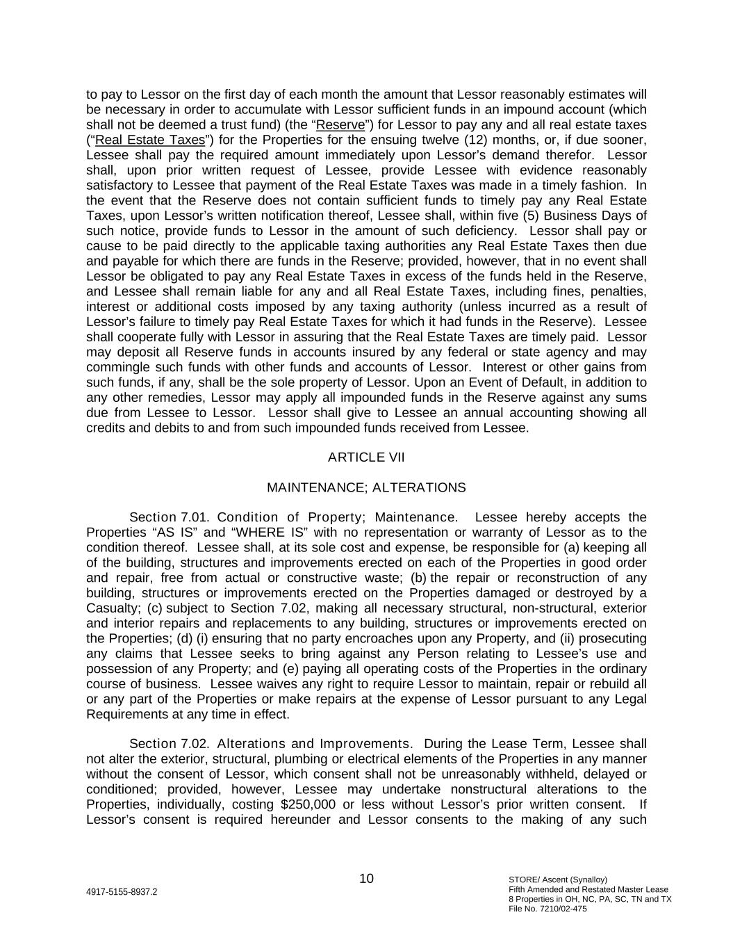 STORE/ Ascent (Synalloy) Fifth Amended and Restated Master Lease 8 Properties in OH, NC, PA, SC, TN and TX File No. 7210/02-475 10 4917-5155-8937.2 to pay to Lessor on the first day of each month the amount that Lessor reasonably estimates will be necessary in order to accumulate with Lessor sufficient funds in an impound account (which shall not be deemed a trust fund) (the “Reserve”) for Lessor to pay any and all real estate taxes (“Real Estate Taxes”) for the Properties for the ensuing twelve (12) months, or, if due sooner, Lessee shall pay the required amount immediately upon Lessor’s demand therefor. Lessor shall, upon prior written request of Lessee, provide Lessee with evidence reasonably satisfactory to Lessee that payment of the Real Estate Taxes was made in a timely fashion. In the event that the Reserve does not contain sufficient funds to timely pay any Real Estate Taxes, upon Lessor’s written notification thereof, Lessee shall, within five (5) Business Days of such notice, provide funds to Lessor in the amount of such deficiency. Lessor shall pay or cause to be paid directly to the applicable taxing authorities any Real Estate Taxes then due and payable for which there are funds in the Reserve; provided, however, that in no event shall Lessor be obligated to pay any Real Estate Taxes in excess of the funds held in the Reserve, and Lessee shall remain liable for any and all Real Estate Taxes, including fines, penalties, interest or additional costs imposed by any taxing authority (unless incurred as a result of Lessor’s failure to timely pay Real Estate Taxes for which it had funds in the Reserve). Lessee shall cooperate fully with Lessor in assuring that the Real Estate Taxes are timely paid. Lessor may deposit all Reserve funds in accounts insured by any federal or state agency and may commingle such funds with other funds and accounts of Lessor. Interest or other gains from such funds, if any, shall be the sole property of Lessor. Upon an Event of Default, in addition to any other remedies, Lessor may apply all impounded funds in the Reserve against any sums due from Lessee to Lessor. Lessor shall give to Lessee an annual accounting showing all credits and debits to and from such impounded funds received from Lessee. ARTICLE VII MAINTENANCE; ALTERATIONS Section 7.01. Condition of Property; Maintenance. Lessee hereby accepts the Properties “AS IS” and “WHERE IS” with no representation or warranty of Lessor as to the condition thereof. Lessee shall, at its sole cost and expense, be responsible for (a) keeping all of the building, structures and improvements erected on each of the Properties in good order and repair, free from actual or constructive waste; (b) the repair or reconstruction of any building, structures or improvements erected on the Properties damaged or destroyed by a Casualty; (c) subject to Section 7.02, making all necessary structural, non-structural, exterior and interior repairs and replacements to any building, structures or improvements erected on the Properties; (d) (i) ensuring that no party encroaches upon any Property, and (ii) prosecuting any claims that Lessee seeks to bring against any Person relating to Lessee’s use and possession of any Property; and (e) paying all operating costs of the Properties in the ordinary course of business. Lessee waives any right to require Lessor to maintain, repair or rebuild all or any part of the Properties or make repairs at the expense of Lessor pursuant to any Legal Requirements at any time in effect. Section 7.02. Alterations and Improvements. During the Lease Term, Lessee shall not alter the exterior, structural, plumbing or electrical elements of the Properties in any manner without the consent of Lessor, which consent shall not be unreasonably withheld, delayed or conditioned; provided, however, Lessee may undertake nonstructural alterations to the Properties, individually, costing $250,000 or less without Lessor’s prior written consent. If Lessor’s consent is required hereunder and Lessor consents to the making of any such