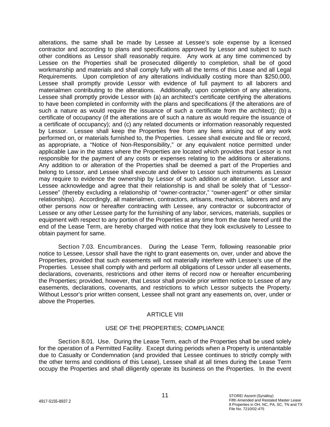 STORE/ Ascent (Synalloy) Fifth Amended and Restated Master Lease 8 Properties in OH, NC, PA, SC, TN and TX File No. 7210/02-475 11 4917-5155-8937.2 alterations, the same shall be made by Lessee at Lessee’s sole expense by a licensed contractor and according to plans and specifications approved by Lessor and subject to such other conditions as Lessor shall reasonably require. Any work at any time commenced by Lessee on the Properties shall be prosecuted diligently to completion, shall be of good workmanship and materials and shall comply fully with all the terms of this Lease and all Legal Requirements. Upon completion of any alterations individually costing more than $250,000, Lessee shall promptly provide Lessor with evidence of full payment to all laborers and materialmen contributing to the alterations. Additionally, upon completion of any alterations, Lessee shall promptly provide Lessor with (a) an architect’s certificate certifying the alterations to have been completed in conformity with the plans and specifications (if the alterations are of such a nature as would require the issuance of such a certificate from the architect); (b) a certificate of occupancy (if the alterations are of such a nature as would require the issuance of a certificate of occupancy); and (c) any related documents or information reasonably requested by Lessor. Lessee shall keep the Properties free from any liens arising out of any work performed on, or materials furnished to, the Properties. Lessee shall execute and file or record, as appropriate, a “Notice of Non-Responsibility,” or any equivalent notice permitted under applicable Law in the states where the Properties are located which provides that Lessor is not responsible for the payment of any costs or expenses relating to the additions or alterations. Any addition to or alteration of the Properties shall be deemed a part of the Properties and belong to Lessor, and Lessee shall execute and deliver to Lessor such instruments as Lessor may require to evidence the ownership by Lessor of such addition or alteration. Lessor and Lessee acknowledge and agree that their relationship is and shall be solely that of “Lessor- Lessee” (thereby excluding a relationship of “owner-contractor,” “owner-agent” or other similar relationships). Accordingly, all materialmen, contractors, artisans, mechanics, laborers and any other persons now or hereafter contracting with Lessee, any contractor or subcontractor of Lessee or any other Lessee party for the furnishing of any labor, services, materials, supplies or equipment with respect to any portion of the Properties at any time from the date hereof until the end of the Lease Term, are hereby charged with notice that they look exclusively to Lessee to obtain payment for same. Section 7.03. Encumbrances. During the Lease Term, following reasonable prior notice to Lessee, Lessor shall have the right to grant easements on, over, under and above the Properties, provided that such easements will not materially interfere with Lessee’s use of the Properties. Lessee shall comply with and perform all obligations of Lessor under all easements, declarations, covenants, restrictions and other items of record now or hereafter encumbering the Properties; provided, however, that Lessor shall provide prior written notice to Lessee of any easements, declarations, covenants, and restrictions to which Lessor subjects the Property. Without Lessor’s prior written consent, Lessee shall not grant any easements on, over, under or above the Properties. ARTICLE VIII USE OF THE PROPERTIES; COMPLIANCE Section 8.01. Use. During the Lease Term, each of the Properties shall be used solely for the operation of a Permitted Facility. Except during periods when a Property is untenantable due to Casualty or Condemnation (and provided that Lessee continues to strictly comply with the other terms and conditions of this Lease), Lessee shall at all times during the Lease Term occupy the Properties and shall diligently operate its business on the Properties. In the event
