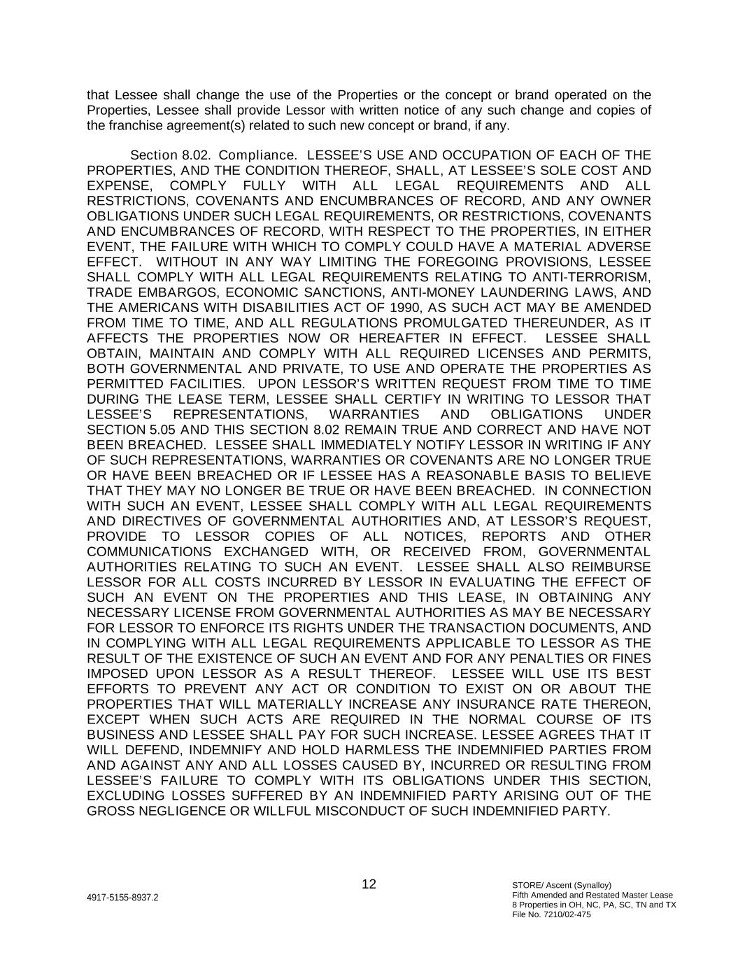 STORE/ Ascent (Synalloy) Fifth Amended and Restated Master Lease 8 Properties in OH, NC, PA, SC, TN and TX File No. 7210/02-475 12 4917-5155-8937.2 that Lessee shall change the use of the Properties or the concept or brand operated on the Properties, Lessee shall provide Lessor with written notice of any such change and copies of the franchise agreement(s) related to such new concept or brand, if any. Section 8.02. Compliance. LESSEE’S USE AND OCCUPATION OF EACH OF THE PROPERTIES, AND THE CONDITION THEREOF, SHALL, AT LESSEE’S SOLE COST AND EXPENSE, COMPLY FULLY WITH ALL LEGAL REQUIREMENTS AND ALL RESTRICTIONS, COVENANTS AND ENCUMBRANCES OF RECORD, AND ANY OWNER OBLIGATIONS UNDER SUCH LEGAL REQUIREMENTS, OR RESTRICTIONS, COVENANTS AND ENCUMBRANCES OF RECORD, WITH RESPECT TO THE PROPERTIES, IN EITHER EVENT, THE FAILURE WITH WHICH TO COMPLY COULD HAVE A MATERIAL ADVERSE EFFECT. WITHOUT IN ANY WAY LIMITING THE FOREGOING PROVISIONS, LESSEE SHALL COMPLY WITH ALL LEGAL REQUIREMENTS RELATING TO ANTI-TERRORISM, TRADE EMBARGOS, ECONOMIC SANCTIONS, ANTI-MONEY LAUNDERING LAWS, AND THE AMERICANS WITH DISABILITIES ACT OF 1990, AS SUCH ACT MAY BE AMENDED FROM TIME TO TIME, AND ALL REGULATIONS PROMULGATED THEREUNDER, AS IT AFFECTS THE PROPERTIES NOW OR HEREAFTER IN EFFECT. LESSEE SHALL OBTAIN, MAINTAIN AND COMPLY WITH ALL REQUIRED LICENSES AND PERMITS, BOTH GOVERNMENTAL AND PRIVATE, TO USE AND OPERATE THE PROPERTIES AS PERMITTED FACILITIES. UPON LESSOR’S WRITTEN REQUEST FROM TIME TO TIME DURING THE LEASE TERM, LESSEE SHALL CERTIFY IN WRITING TO LESSOR THAT LESSEE’S REPRESENTATIONS, WARRANTIES AND OBLIGATIONS UNDER SECTION 5.05 AND THIS SECTION 8.02 REMAIN TRUE AND CORRECT AND HAVE NOT BEEN BREACHED. LESSEE SHALL IMMEDIATELY NOTIFY LESSOR IN WRITING IF ANY OF SUCH REPRESENTATIONS, WARRANTIES OR COVENANTS ARE NO LONGER TRUE OR HAVE BEEN BREACHED OR IF LESSEE HAS A REASONABLE BASIS TO BELIEVE THAT THEY MAY NO LONGER BE TRUE OR HAVE BEEN BREACHED. IN CONNECTION WITH SUCH AN EVENT, LESSEE SHALL COMPLY WITH ALL LEGAL REQUIREMENTS AND DIRECTIVES OF GOVERNMENTAL AUTHORITIES AND, AT LESSOR’S REQUEST, PROVIDE TO LESSOR COPIES OF ALL NOTICES, REPORTS AND OTHER COMMUNICATIONS EXCHANGED WITH, OR RECEIVED FROM, GOVERNMENTAL AUTHORITIES RELATING TO SUCH AN EVENT. LESSEE SHALL ALSO REIMBURSE LESSOR FOR ALL COSTS INCURRED BY LESSOR IN EVALUATING THE EFFECT OF SUCH AN EVENT ON THE PROPERTIES AND THIS LEASE, IN OBTAINING ANY NECESSARY LICENSE FROM GOVERNMENTAL AUTHORITIES AS MAY BE NECESSARY FOR LESSOR TO ENFORCE ITS RIGHTS UNDER THE TRANSACTION DOCUMENTS, AND IN COMPLYING WITH ALL LEGAL REQUIREMENTS APPLICABLE TO LESSOR AS THE RESULT OF THE EXISTENCE OF SUCH AN EVENT AND FOR ANY PENALTIES OR FINES IMPOSED UPON LESSOR AS A RESULT THEREOF. LESSEE WILL USE ITS BEST EFFORTS TO PREVENT ANY ACT OR CONDITION TO EXIST ON OR ABOUT THE PROPERTIES THAT WILL MATERIALLY INCREASE ANY INSURANCE RATE THEREON, EXCEPT WHEN SUCH ACTS ARE REQUIRED IN THE NORMAL COURSE OF ITS BUSINESS AND LESSEE SHALL PAY FOR SUCH INCREASE. LESSEE AGREES THAT IT WILL DEFEND, INDEMNIFY AND HOLD HARMLESS THE INDEMNIFIED PARTIES FROM AND AGAINST ANY AND ALL LOSSES CAUSED BY, INCURRED OR RESULTING FROM LESSEE’S FAILURE TO COMPLY WITH ITS OBLIGATIONS UNDER THIS SECTION, EXCLUDING LOSSES SUFFERED BY AN INDEMNIFIED PARTY ARISING OUT OF THE GROSS NEGLIGENCE OR WILLFUL MISCONDUCT OF SUCH INDEMNIFIED PARTY.