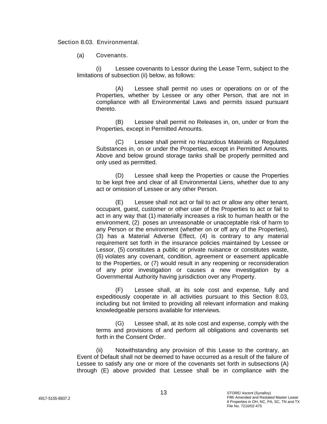 STORE/ Ascent (Synalloy) Fifth Amended and Restated Master Lease 8 Properties in OH, NC, PA, SC, TN and TX File No. 7210/02-475 13 4917-5155-8937.2 Section 8.03. Environmental. (a) Covenants. (i) Lessee covenants to Lessor during the Lease Term, subject to the limitations of subsection (ii) below, as follows: (A) Lessee shall permit no uses or operations on or of the Properties, whether by Lessee or any other Person, that are not in compliance with all Environmental Laws and permits issued pursuant thereto. (B) Lessee shall permit no Releases in, on, under or from the Properties, except in Permitted Amounts. (C) Lessee shall permit no Hazardous Materials or Regulated Substances in, on or under the Properties, except in Permitted Amounts. Above and below ground storage tanks shall be properly permitted and only used as permitted. (D) Lessee shall keep the Properties or cause the Properties to be kept free and clear of all Environmental Liens, whether due to any act or omission of Lessee or any other Person. (E) Lessee shall not act or fail to act or allow any other tenant, occupant, guest, customer or other user of the Properties to act or fail to act in any way that (1) materially increases a risk to human health or the environment, (2) poses an unreasonable or unacceptable risk of harm to any Person or the environment (whether on or off any of the Properties), (3) has a Material Adverse Effect, (4) is contrary to any material requirement set forth in the insurance policies maintained by Lessee or Lessor, (5) constitutes a public or private nuisance or constitutes waste, (6) violates any covenant, condition, agreement or easement applicable to the Properties, or (7) would result in any reopening or reconsideration of any prior investigation or causes a new investigation by a Governmental Authority having jurisdiction over any Property. (F) Lessee shall, at its sole cost and expense, fully and expeditiously cooperate in all activities pursuant to this Section 8.03, including but not limited to providing all relevant information and making knowledgeable persons available for interviews. (G) Lessee shall, at its sole cost and expense, comply with the terms and provisions of and perform all obligations and covenants set forth in the Consent Order. (ii) Notwithstanding any provision of this Lease to the contrary, an Event of Default shall not be deemed to have occurred as a result of the failure of Lessee to satisfy any one or more of the covenants set forth in subsections (A) through (E) above provided that Lessee shall be in compliance with the