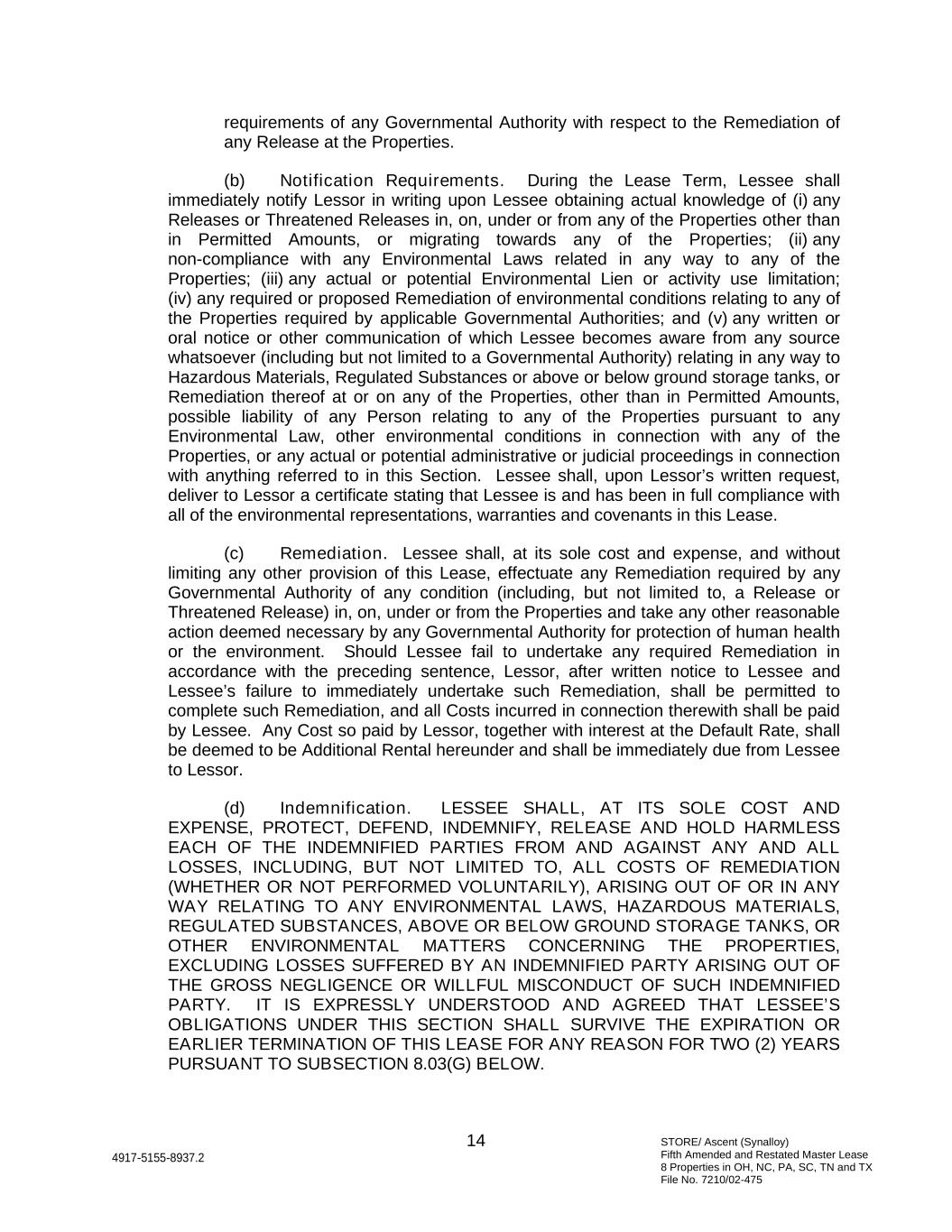 STORE/ Ascent (Synalloy) Fifth Amended and Restated Master Lease 8 Properties in OH, NC, PA, SC, TN and TX File No. 7210/02-475 14 4917-5155-8937.2 requirements of any Governmental Authority with respect to the Remediation of any Release at the Properties. (b) Notification Requirements. During the Lease Term, Lessee shall immediately notify Lessor in writing upon Lessee obtaining actual knowledge of (i) any Releases or Threatened Releases in, on, under or from any of the Properties other than in Permitted Amounts, or migrating towards any of the Properties; (ii) any non-compliance with any Environmental Laws related in any way to any of the Properties; (iii) any actual or potential Environmental Lien or activity use limitation; (iv) any required or proposed Remediation of environmental conditions relating to any of the Properties required by applicable Governmental Authorities; and (v) any written or oral notice or other communication of which Lessee becomes aware from any source whatsoever (including but not limited to a Governmental Authority) relating in any way to Hazardous Materials, Regulated Substances or above or below ground storage tanks, or Remediation thereof at or on any of the Properties, other than in Permitted Amounts, possible liability of any Person relating to any of the Properties pursuant to any Environmental Law, other environmental conditions in connection with any of the Properties, or any actual or potential administrative or judicial proceedings in connection with anything referred to in this Section. Lessee shall, upon Lessor’s written request, deliver to Lessor a certificate stating that Lessee is and has been in full compliance with all of the environmental representations, warranties and covenants in this Lease. (c) Remediation. Lessee shall, at its sole cost and expense, and without limiting any other provision of this Lease, effectuate any Remediation required by any Governmental Authority of any condition (including, but not limited to, a Release or Threatened Release) in, on, under or from the Properties and take any other reasonable action deemed necessary by any Governmental Authority for protection of human health or the environment. Should Lessee fail to undertake any required Remediation in accordance with the preceding sentence, Lessor, after written notice to Lessee and Lessee’s failure to immediately undertake such Remediation, shall be permitted to complete such Remediation, and all Costs incurred in connection therewith shall be paid by Lessee. Any Cost so paid by Lessor, together with interest at the Default Rate, shall be deemed to be Additional Rental hereunder and shall be immediately due from Lessee to Lessor. (d) Indemnification. LESSEE SHALL, AT ITS SOLE COST AND EXPENSE, PROTECT, DEFEND, INDEMNIFY, RELEASE AND HOLD HARMLESS EACH OF THE INDEMNIFIED PARTIES FROM AND AGAINST ANY AND ALL LOSSES, INCLUDING, BUT NOT LIMITED TO, ALL COSTS OF REMEDIATION (WHETHER OR NOT PERFORMED VOLUNTARILY), ARISING OUT OF OR IN ANY WAY RELATING TO ANY ENVIRONMENTAL LAWS, HAZARDOUS MATERIALS, REGULATED SUBSTANCES, ABOVE OR BELOW GROUND STORAGE TANKS, OR OTHER ENVIRONMENTAL MATTERS CONCERNING THE PROPERTIES, EXCLUDING LOSSES SUFFERED BY AN INDEMNIFIED PARTY ARISING OUT OF THE GROSS NEGLIGENCE OR WILLFUL MISCONDUCT OF SUCH INDEMNIFIED PARTY. IT IS EXPRESSLY UNDERSTOOD AND AGREED THAT LESSEE’S OBLIGATIONS UNDER THIS SECTION SHALL SURVIVE THE EXPIRATION OR EARLIER TERMINATION OF THIS LEASE FOR ANY REASON FOR TWO (2) YEARS PURSUANT TO SUBSECTION 8.03(G) BELOW.