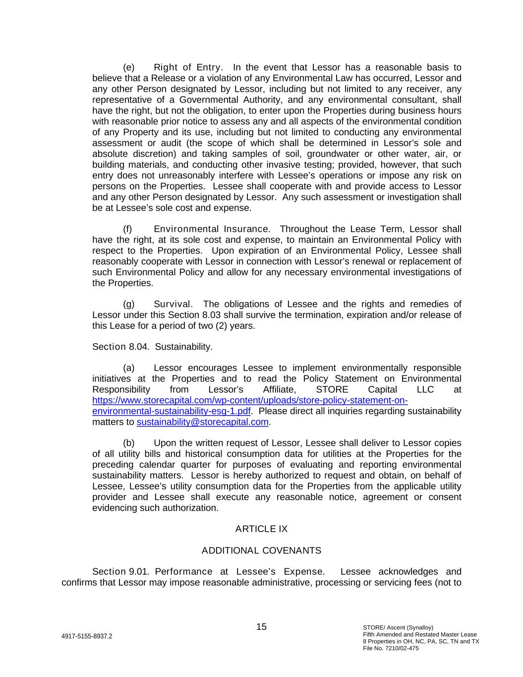 STORE/ Ascent (Synalloy) Fifth Amended and Restated Master Lease 8 Properties in OH, NC, PA, SC, TN and TX File No. 7210/02-475 15 4917-5155-8937.2 (e) Right of Entry. In the event that Lessor has a reasonable basis to believe that a Release or a violation of any Environmental Law has occurred, Lessor and any other Person designated by Lessor, including but not limited to any receiver, any representative of a Governmental Authority, and any environmental consultant, shall have the right, but not the obligation, to enter upon the Properties during business hours with reasonable prior notice to assess any and all aspects of the environmental condition of any Property and its use, including but not limited to conducting any environmental assessment or audit (the scope of which shall be determined in Lessor’s sole and absolute discretion) and taking samples of soil, groundwater or other water, air, or building materials, and conducting other invasive testing; provided, however, that such entry does not unreasonably interfere with Lessee’s operations or impose any risk on persons on the Properties. Lessee shall cooperate with and provide access to Lessor and any other Person designated by Lessor. Any such assessment or investigation shall be at Lessee’s sole cost and expense. (f) Environmental Insurance. Throughout the Lease Term, Lessor shall have the right, at its sole cost and expense, to maintain an Environmental Policy with respect to the Properties. Upon expiration of an Environmental Policy, Lessee shall reasonably cooperate with Lessor in connection with Lessor’s renewal or replacement of such Environmental Policy and allow for any necessary environmental investigations of the Properties. (g) Survival. The obligations of Lessee and the rights and remedies of Lessor under this Section 8.03 shall survive the termination, expiration and/or release of this Lease for a period of two (2) years. Section 8.04. Sustainability. (a) Lessor encourages Lessee to implement environmentally responsible initiatives at the Properties and to read the Policy Statement on Environmental Responsibility from Lessor’s Affiliate, STORE Capital LLC at https://www.storecapital.com/wp-content/uploads/store-policy-statement-on- environmental-sustainability-esg-1.pdf. Please direct all inquiries regarding sustainability matters to sustainability@storecapital.com. (b) Upon the written request of Lessor, Lessee shall deliver to Lessor copies of all utility bills and historical consumption data for utilities at the Properties for the preceding calendar quarter for purposes of evaluating and reporting environmental sustainability matters. Lessor is hereby authorized to request and obtain, on behalf of Lessee, Lessee’s utility consumption data for the Properties from the applicable utility provider and Lessee shall execute any reasonable notice, agreement or consent evidencing such authorization. ARTICLE IX ADDITIONAL COVENANTS Section 9.01. Performance at Lessee’s Expense. Lessee acknowledges and confirms that Lessor may impose reasonable administrative, processing or servicing fees (not to