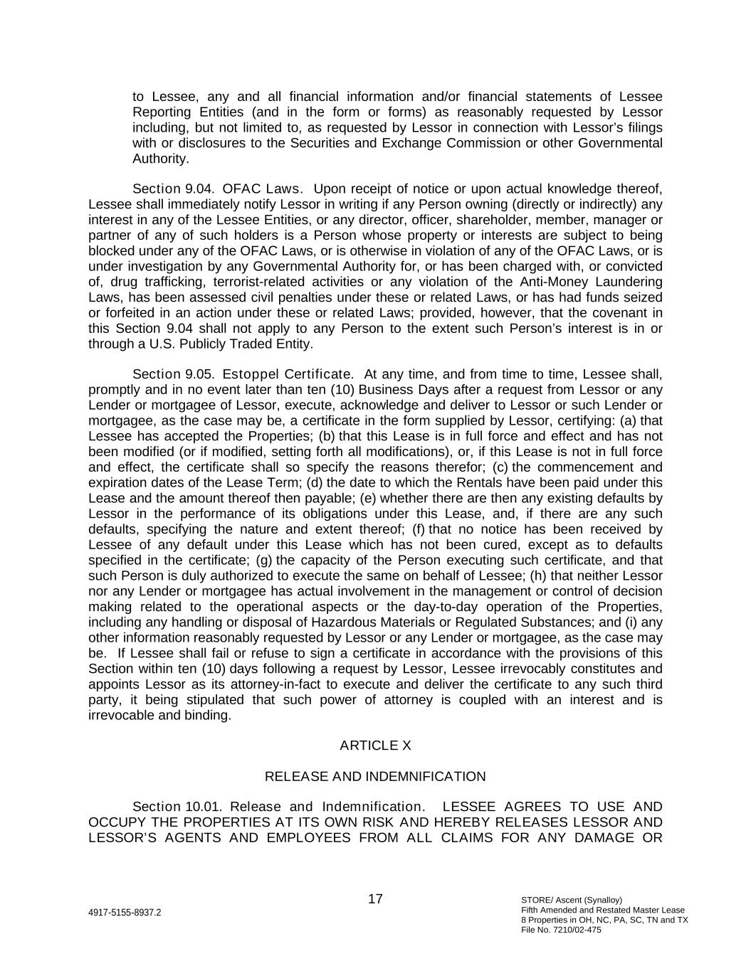 STORE/ Ascent (Synalloy) Fifth Amended and Restated Master Lease 8 Properties in OH, NC, PA, SC, TN and TX File No. 7210/02-475 17 4917-5155-8937.2 to Lessee, any and all financial information and/or financial statements of Lessee Reporting Entities (and in the form or forms) as reasonably requested by Lessor including, but not limited to, as requested by Lessor in connection with Lessor’s filings with or disclosures to the Securities and Exchange Commission or other Governmental Authority. Section 9.04. OFAC Laws. Upon receipt of notice or upon actual knowledge thereof, Lessee shall immediately notify Lessor in writing if any Person owning (directly or indirectly) any interest in any of the Lessee Entities, or any director, officer, shareholder, member, manager or partner of any of such holders is a Person whose property or interests are subject to being blocked under any of the OFAC Laws, or is otherwise in violation of any of the OFAC Laws, or is under investigation by any Governmental Authority for, or has been charged with, or convicted of, drug trafficking, terrorist-related activities or any violation of the Anti-Money Laundering Laws, has been assessed civil penalties under these or related Laws, or has had funds seized or forfeited in an action under these or related Laws; provided, however, that the covenant in this Section 9.04 shall not apply to any Person to the extent such Person’s interest is in or through a U.S. Publicly Traded Entity. Section 9.05. Estoppel Certificate. At any time, and from time to time, Lessee shall, promptly and in no event later than ten (10) Business Days after a request from Lessor or any Lender or mortgagee of Lessor, execute, acknowledge and deliver to Lessor or such Lender or mortgagee, as the case may be, a certificate in the form supplied by Lessor, certifying: (a) that Lessee has accepted the Properties; (b) that this Lease is in full force and effect and has not been modified (or if modified, setting forth all modifications), or, if this Lease is not in full force and effect, the certificate shall so specify the reasons therefor; (c) the commencement and expiration dates of the Lease Term; (d) the date to which the Rentals have been paid under this Lease and the amount thereof then payable; (e) whether there are then any existing defaults by Lessor in the performance of its obligations under this Lease, and, if there are any such defaults, specifying the nature and extent thereof; (f) that no notice has been received by Lessee of any default under this Lease which has not been cured, except as to defaults specified in the certificate; (g) the capacity of the Person executing such certificate, and that such Person is duly authorized to execute the same on behalf of Lessee; (h) that neither Lessor nor any Lender or mortgagee has actual involvement in the management or control of decision making related to the operational aspects or the day-to-day operation of the Properties, including any handling or disposal of Hazardous Materials or Regulated Substances; and (i) any other information reasonably requested by Lessor or any Lender or mortgagee, as the case may be. If Lessee shall fail or refuse to sign a certificate in accordance with the provisions of this Section within ten (10) days following a request by Lessor, Lessee irrevocably constitutes and appoints Lessor as its attorney-in-fact to execute and deliver the certificate to any such third party, it being stipulated that such power of attorney is coupled with an interest and is irrevocable and binding. ARTICLE X RELEASE AND INDEMNIFICATION Section 10.01. Release and Indemnification. LESSEE AGREES TO USE AND OCCUPY THE PROPERTIES AT ITS OWN RISK AND HEREBY RELEASES LESSOR AND LESSOR’S AGENTS AND EMPLOYEES FROM ALL CLAIMS FOR ANY DAMAGE OR