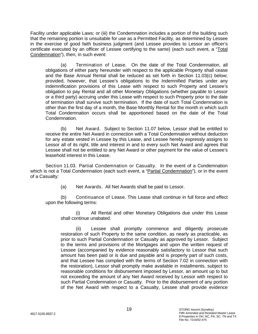 STORE/ Ascent (Synalloy) Fifth Amended and Restated Master Lease 8 Properties in OH, NC, PA, SC, TN and TX File No. 7210/02-475 19 4917-5155-8937.2 Facility under applicable Laws; or (iii) the Condemnation includes a portion of the building such that the remaining portion is unsuitable for use as a Permitted Facility, as determined by Lessee in the exercise of good faith business judgment (and Lessee provides to Lessor an officer’s certificate executed by an officer of Lessee certifying to the same) (each such event, a “Total Condemnation”), then, in such event: (a) Termination of Lease. On the date of the Total Condemnation, all obligations of either party hereunder with respect to the applicable Property shall cease and the Base Annual Rental shall be reduced as set forth in Section 11.03(c) below; provided, however, that Lessee’s obligations to the Indemnified Parties under any indemnification provisions of this Lease with respect to such Property and Lessee’s obligation to pay Rental and all other Monetary Obligations (whether payable to Lessor or a third party) accruing under this Lease with respect to such Property prior to the date of termination shall survive such termination. If the date of such Total Condemnation is other than the first day of a month, the Base Monthly Rental for the month in which such Total Condemnation occurs shall be apportioned based on the date of the Total Condemnation. (b) Net Award. Subject to Section 11.07 below, Lessor shall be entitled to receive the entire Net Award in connection with a Total Condemnation without deduction for any estate vested in Lessee by this Lease, and Lessee hereby expressly assigns to Lessor all of its right, title and interest in and to every such Net Award and agrees that Lessee shall not be entitled to any Net Award or other payment for the value of Lessee’s leasehold interest in this Lease. Section 11.03. Partial Condemnation or Casualty. In the event of a Condemnation which is not a Total Condemnation (each such event, a “Partial Condemnation”), or in the event of a Casualty: (a) Net Awards. All Net Awards shall be paid to Lessor. (b) Continuance of Lease. This Lease shall continue in full force and effect upon the following terms: (i) All Rental and other Monetary Obligations due under this Lease shall continue unabated. (ii) Lessee shall promptly commence and diligently prosecute restoration of such Property to the same condition, as nearly as practicable, as prior to such Partial Condemnation or Casualty as approved by Lessor. Subject to the terms and provisions of the Mortgages and upon the written request of Lessee (accompanied by evidence reasonably satisfactory to Lessor that such amount has been paid or is due and payable and is properly part of such costs, and that Lessee has complied with the terms of Section 7.02 in connection with the restoration), Lessor shall promptly make available in installments, subject to reasonable conditions for disbursement imposed by Lessor, an amount up to but not exceeding the amount of any Net Award received by Lessor with respect to such Partial Condemnation or Casualty. Prior to the disbursement of any portion of the Net Award with respect to a Casualty, Lessee shall provide evidence