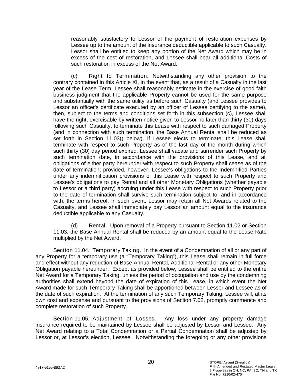 STORE/ Ascent (Synalloy) Fifth Amended and Restated Master Lease 8 Properties in OH, NC, PA, SC, TN and TX File No. 7210/02-475 20 4917-5155-8937.2 reasonably satisfactory to Lessor of the payment of restoration expenses by Lessee up to the amount of the insurance deductible applicable to such Casualty. Lessor shall be entitled to keep any portion of the Net Award which may be in excess of the cost of restoration, and Lessee shall bear all additional Costs of such restoration in excess of the Net Award. (c) Right to Termination. Notwithstanding any other provision to the contrary contained in this Article XI, in the event that, as a result of a Casualty in the last year of the Lease Term, Lessee shall reasonably estimate in the exercise of good faith business judgment that the applicable Property cannot be used for the same purpose and substantially with the same utility as before such Casualty (and Lessee provides to Lessor an officer's certificate executed by an officer of Lessee certifying to the same), then, subject to the terms and conditions set forth in this subsection (c), Lessee shall have the right, exercisable by written notice given to Lessor no later than thirty (30) days following such Casualty, to terminate this Lease with respect to such damaged Property (and in connection with such termination, the Base Annual Rental shall be reduced as set forth in Section 11.03() below). If Lessee elects to terminate, this Lease shall terminate with respect to such Property as of the last day of the month during which such thirty (30) day period expired. Lessee shall vacate and surrender such Property by such termination date, in accordance with the provisions of this Lease, and ail obligations of either party hereunder with respect to such Property shall cease as of the date of termination; provided, however, Lessee's obligations to the Indemnified Parties under any indemnification provisions of this Lease with respect to such Property and Lessee's obligations to pay Rental and all other Monetary Obligations (whether payable to Lessor or a third party) accruing under this Lease with respect to such Property prior to the date of termination shall survive such termination subject to, and in accordance with, the terms hereof. In such event, Lessor may retain all Net Awards related to the Casualty, and Lessee shall immediately pay Lessor an amount equal to the insurance deductible applicable to any Casualty. (d) Rental. Upon removal of a Property pursuant to Section 11.02 or Section 11.03, the Base Annual Rental shall be reduced by an amount equal to the Lease Rate multiplied by the Net Award. Section 11.04. Temporary Taking. In the event of a Condemnation of all or any part of any Property for a temporary use (a “Temporary Taking”), this Lease shall remain in full force and effect without any reduction of Base Annual Rental, Additional Rental or any other Monetary Obligation payable hereunder. Except as provided below, Lessee shall be entitled to the entire Net Award for a Temporary Taking, unless the period of occupation and use by the condemning authorities shall extend beyond the date of expiration of this Lease, in which event the Net Award made for such Temporary Taking shall be apportioned between Lessor and Lessee as of the date of such expiration. At the termination of any such Temporary Taking, Lessee will, at its own cost and expense and pursuant to the provisions of Section 7.02, promptly commence and complete restoration of such Property. Section 11.05. Adjustment of Losses. Any loss under any property damage insurance required to be maintained by Lessee shall be adjusted by Lessor and Lessee. Any Net Award relating to a Total Condemnation or a Partial Condemnation shall be adjusted by Lessor or, at Lessor’s election, Lessee. Notwithstanding the foregoing or any other provisions