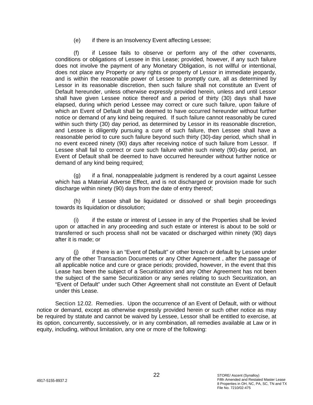 STORE/ Ascent (Synalloy) Fifth Amended and Restated Master Lease 8 Properties in OH, NC, PA, SC, TN and TX File No. 7210/02-475 22 4917-5155-8937.2 (e) if there is an Insolvency Event affecting Lessee; (f) if Lessee fails to observe or perform any of the other covenants, conditions or obligations of Lessee in this Lease; provided, however, if any such failure does not involve the payment of any Monetary Obligation, is not willful or intentional, does not place any Property or any rights or property of Lessor in immediate jeopardy, and is within the reasonable power of Lessee to promptly cure, all as determined by Lessor in its reasonable discretion, then such failure shall not constitute an Event of Default hereunder, unless otherwise expressly provided herein, unless and until Lessor shall have given Lessee notice thereof and a period of thirty (30) days shall have elapsed, during which period Lessee may correct or cure such failure, upon failure of which an Event of Default shall be deemed to have occurred hereunder without further notice or demand of any kind being required. If such failure cannot reasonably be cured within such thirty (30) day period, as determined by Lessor in its reasonable discretion, and Lessee is diligently pursuing a cure of such failure, then Lessee shall have a reasonable period to cure such failure beyond such thirty (30)-day period, which shall in no event exceed ninety (90) days after receiving notice of such failure from Lessor. If Lessee shall fail to correct or cure such failure within such ninety (90)-day period, an Event of Default shall be deemed to have occurred hereunder without further notice or demand of any kind being required; (g) if a final, nonappealable judgment is rendered by a court against Lessee which has a Material Adverse Effect, and is not discharged or provision made for such discharge within ninety (90) days from the date of entry thereof; (h) if Lessee shall be liquidated or dissolved or shall begin proceedings towards its liquidation or dissolution; (i) if the estate or interest of Lessee in any of the Properties shall be levied upon or attached in any proceeding and such estate or interest is about to be sold or transferred or such process shall not be vacated or discharged within ninety (90) days after it is made; or (j) if there is an “Event of Default” or other breach or default by Lessee under any of the other Transaction Documents or any Other Agreement , after the passage of all applicable notice and cure or grace periods; provided, however, in the event that this Lease has been the subject of a Securitization and any Other Agreement has not been the subject of the same Securitization or any series relating to such Securitization, an “Event of Default” under such Other Agreement shall not constitute an Event of Default under this Lease. Section 12.02. Remedies. Upon the occurrence of an Event of Default, with or without notice or demand, except as otherwise expressly provided herein or such other notice as may be required by statute and cannot be waived by Lessee, Lessor shall be entitled to exercise, at its option, concurrently, successively, or in any combination, all remedies available at Law or in equity, including, without limitation, any one or more of the following:
