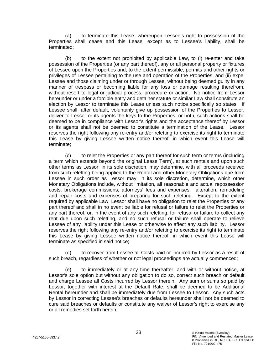 STORE/ Ascent (Synalloy) Fifth Amended and Restated Master Lease 8 Properties in OH, NC, PA, SC, TN and TX File No. 7210/02-475 23 4917-5155-8937.2 (a) to terminate this Lease, whereupon Lessee’s right to possession of the Properties shall cease and this Lease, except as to Lessee’s liability, shall be terminated; (b) to the extent not prohibited by applicable Law, to (i) re-enter and take possession of the Properties (or any part thereof), any or all personal property or fixtures of Lessee upon the Properties and, to the extent permissible, permits and other rights or privileges of Lessee pertaining to the use and operation of the Properties, and (ii) expel Lessee and those claiming under or through Lessee, without being deemed guilty in any manner of trespass or becoming liable for any loss or damage resulting therefrom, without resort to legal or judicial process, procedure or action. No notice from Lessor hereunder or under a forcible entry and detainer statute or similar Law shall constitute an election by Lessor to terminate this Lease unless such notice specifically so states. If Lessee shall, after default, voluntarily give up possession of the Properties to Lessor, deliver to Lessor or its agents the keys to the Properties, or both, such actions shall be deemed to be in compliance with Lessor’s rights and the acceptance thereof by Lessor or its agents shall not be deemed to constitute a termination of the Lease. Lessor reserves the right following any re-entry and/or reletting to exercise its right to terminate this Lease by giving Lessee written notice thereof, in which event this Lease will terminate; (c) to relet the Properties or any part thereof for such term or terms (including a term which extends beyond the original Lease Term), at such rentals and upon such other terms as Lessor, in its sole discretion, may determine, with all proceeds received from such reletting being applied to the Rental and other Monetary Obligations due from Lessee in such order as Lessor may, in its sole discretion, determine, which other Monetary Obligations include, without limitation, all reasonable and actual repossession costs, brokerage commissions, attorneys’ fees and expenses, alteration, remodeling and repair costs and expenses of preparing for such reletting. Except to the extent required by applicable Law, Lessor shall have no obligation to relet the Properties or any part thereof and shall in no event be liable for refusal or failure to relet the Properties or any part thereof, or, in the event of any such reletting, for refusal or failure to collect any rent due upon such reletting, and no such refusal or failure shall operate to relieve Lessee of any liability under this Lease or otherwise to affect any such liability. Lessor reserves the right following any re-entry and/or reletting to exercise its right to terminate this Lease by giving Lessee written notice thereof, in which event this Lease will terminate as specified in said notice; (d) to recover from Lessee all Costs paid or incurred by Lessor as a result of such breach, regardless of whether or not legal proceedings are actually commenced; (e) to immediately or at any time thereafter, and with or without notice, at Lessor’s sole option but without any obligation to do so, correct such breach or default and charge Lessee all Costs incurred by Lessor therein. Any sum or sums so paid by Lessor, together with interest at the Default Rate, shall be deemed to be Additional Rental hereunder and shall be immediately due from Lessee to Lessor. Any such acts by Lessor in correcting Lessee’s breaches or defaults hereunder shall not be deemed to cure said breaches or defaults or constitute any waiver of Lessor’s right to exercise any or all remedies set forth herein;