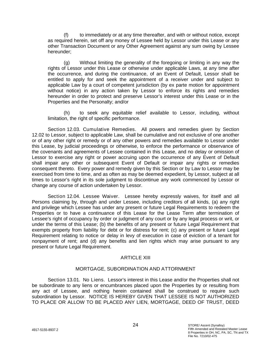 STORE/ Ascent (Synalloy) Fifth Amended and Restated Master Lease 8 Properties in OH, NC, PA, SC, TN and TX File No. 7210/02-475 24 4917-5155-8937.2 (f) to immediately or at any time thereafter, and with or without notice, except as required herein, set off any money of Lessee held by Lessor under this Lease or any other Transaction Document or any Other Agreement against any sum owing by Lessee hereunder; (g) Without limiting the generality of the foregoing or limiting in any way the rights of Lessor under this Lease or otherwise under applicable Laws, at any time after the occurrence, and during the continuance, of an Event of Default, Lessor shall be entitled to apply for and seek the appointment of a receiver under and subject to applicable Law by a court of competent jurisdiction (by ex parte motion for appointment without notice) in any action taken by Lessor to enforce its rights and remedies hereunder in order to protect and preserve Lessor’s interest under this Lease or in the Properties and the Personalty; and/or (h) to seek any equitable relief available to Lessor, including, without limitation, the right of specific performance. Section 12.03. Cumulative Remedies. All powers and remedies given by Section 12.02 to Lessor, subject to applicable Law, shall be cumulative and not exclusive of one another or of any other right or remedy or of any other powers and remedies available to Lessor under this Lease, by judicial proceedings or otherwise, to enforce the performance or observance of the covenants and agreements of Lessee contained in this Lease, and no delay or omission of Lessor to exercise any right or power accruing upon the occurrence of any Event of Default shall impair any other or subsequent Event of Default or impair any rights or remedies consequent thereto. Every power and remedy given by this Section or by Law to Lessor may be exercised from time to time, and as often as may be deemed expedient, by Lessor, subject at all times to Lessor’s right in its sole judgment to discontinue any work commenced by Lessor or change any course of action undertaken by Lessor. Section 12.04. Lessee Waiver. Lessee hereby expressly waives, for itself and all Persons claiming by, through and under Lessee, including creditors of all kinds, (a) any right and privilege which Lessee has under any present or future Legal Requirements to redeem the Properties or to have a continuance of this Lease for the Lease Term after termination of Lessee’s right of occupancy by order or judgment of any court or by any legal process or writ, or under the terms of this Lease; (b) the benefits of any present or future Legal Requirement that exempts property from liability for debt or for distress for rent; (c) any present or future Legal Requirement relating to notice or delay in levy of execution in case of eviction of a tenant for nonpayment of rent; and (d) any benefits and lien rights which may arise pursuant to any present or future Legal Requirement. ARTICLE XIII MORTGAGE, SUBORDINATION AND ATTORNMENT Section 13.01. No Liens. Lessor’s interest in this Lease and/or the Properties shall not be subordinate to any liens or encumbrances placed upon the Properties by or resulting from any act of Lessee, and nothing herein contained shall be construed to require such subordination by Lessor. NOTICE IS HEREBY GIVEN THAT LESSEE IS NOT AUTHORIZED TO PLACE OR ALLOW TO BE PLACED ANY LIEN, MORTGAGE, DEED OF TRUST, DEED