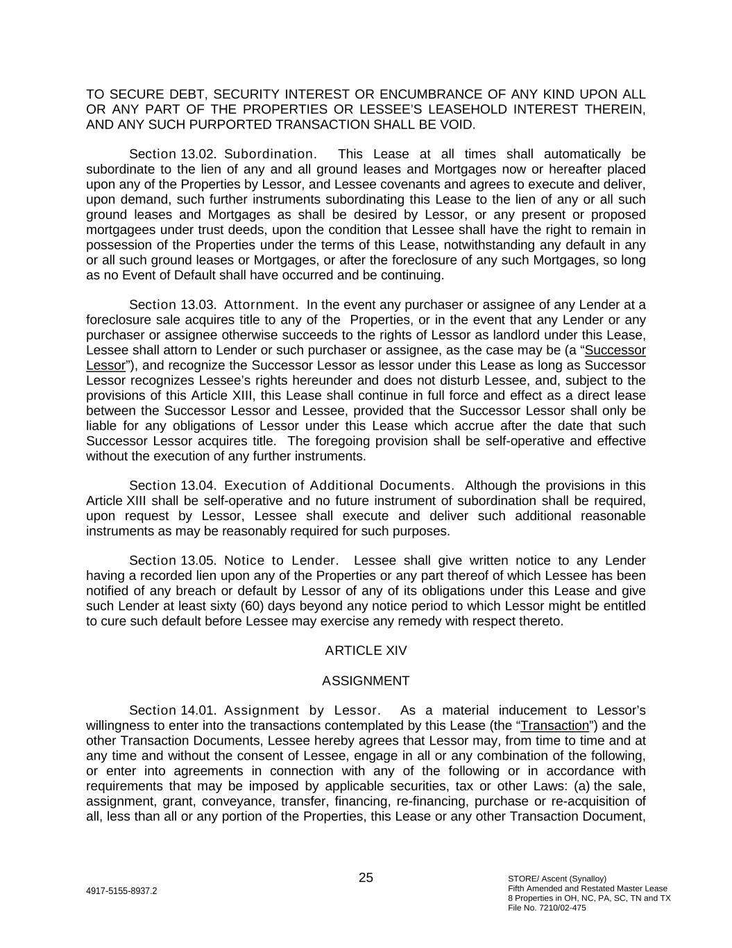 STORE/ Ascent (Synalloy) Fifth Amended and Restated Master Lease 8 Properties in OH, NC, PA, SC, TN and TX File No. 7210/02-475 25 4917-5155-8937.2 TO SECURE DEBT, SECURITY INTEREST OR ENCUMBRANCE OF ANY KIND UPON ALL OR ANY PART OF THE PROPERTIES OR LESSEE’S LEASEHOLD INTEREST THEREIN, AND ANY SUCH PURPORTED TRANSACTION SHALL BE VOID. Section 13.02. Subordination. This Lease at all times shall automatically be subordinate to the lien of any and all ground leases and Mortgages now or hereafter placed upon any of the Properties by Lessor, and Lessee covenants and agrees to execute and deliver, upon demand, such further instruments subordinating this Lease to the lien of any or all such ground leases and Mortgages as shall be desired by Lessor, or any present or proposed mortgagees under trust deeds, upon the condition that Lessee shall have the right to remain in possession of the Properties under the terms of this Lease, notwithstanding any default in any or all such ground leases or Mortgages, or after the foreclosure of any such Mortgages, so long as no Event of Default shall have occurred and be continuing. Section 13.03. Attornment. In the event any purchaser or assignee of any Lender at a foreclosure sale acquires title to any of the Properties, or in the event that any Lender or any purchaser or assignee otherwise succeeds to the rights of Lessor as landlord under this Lease, Lessee shall attorn to Lender or such purchaser or assignee, as the case may be (a “Successor Lessor”), and recognize the Successor Lessor as lessor under this Lease as long as Successor Lessor recognizes Lessee’s rights hereunder and does not disturb Lessee, and, subject to the provisions of this Article XIII, this Lease shall continue in full force and effect as a direct lease between the Successor Lessor and Lessee, provided that the Successor Lessor shall only be liable for any obligations of Lessor under this Lease which accrue after the date that such Successor Lessor acquires title. The foregoing provision shall be self-operative and effective without the execution of any further instruments. Section 13.04. Execution of Additional Documents. Although the provisions in this Article XIII shall be self-operative and no future instrument of subordination shall be required, upon request by Lessor, Lessee shall execute and deliver such additional reasonable instruments as may be reasonably required for such purposes. Section 13.05. Notice to Lender. Lessee shall give written notice to any Lender having a recorded lien upon any of the Properties or any part thereof of which Lessee has been notified of any breach or default by Lessor of any of its obligations under this Lease and give such Lender at least sixty (60) days beyond any notice period to which Lessor might be entitled to cure such default before Lessee may exercise any remedy with respect thereto. ARTICLE XIV ASSIGNMENT Section 14.01. Assignment by Lessor. As a material inducement to Lessor’s willingness to enter into the transactions contemplated by this Lease (the “Transaction”) and the other Transaction Documents, Lessee hereby agrees that Lessor may, from time to time and at any time and without the consent of Lessee, engage in all or any combination of the following, or enter into agreements in connection with any of the following or in accordance with requirements that may be imposed by applicable securities, tax or other Laws: (a) the sale, assignment, grant, conveyance, transfer, financing, re-financing, purchase or re-acquisition of all, less than all or any portion of the Properties, this Lease or any other Transaction Document,