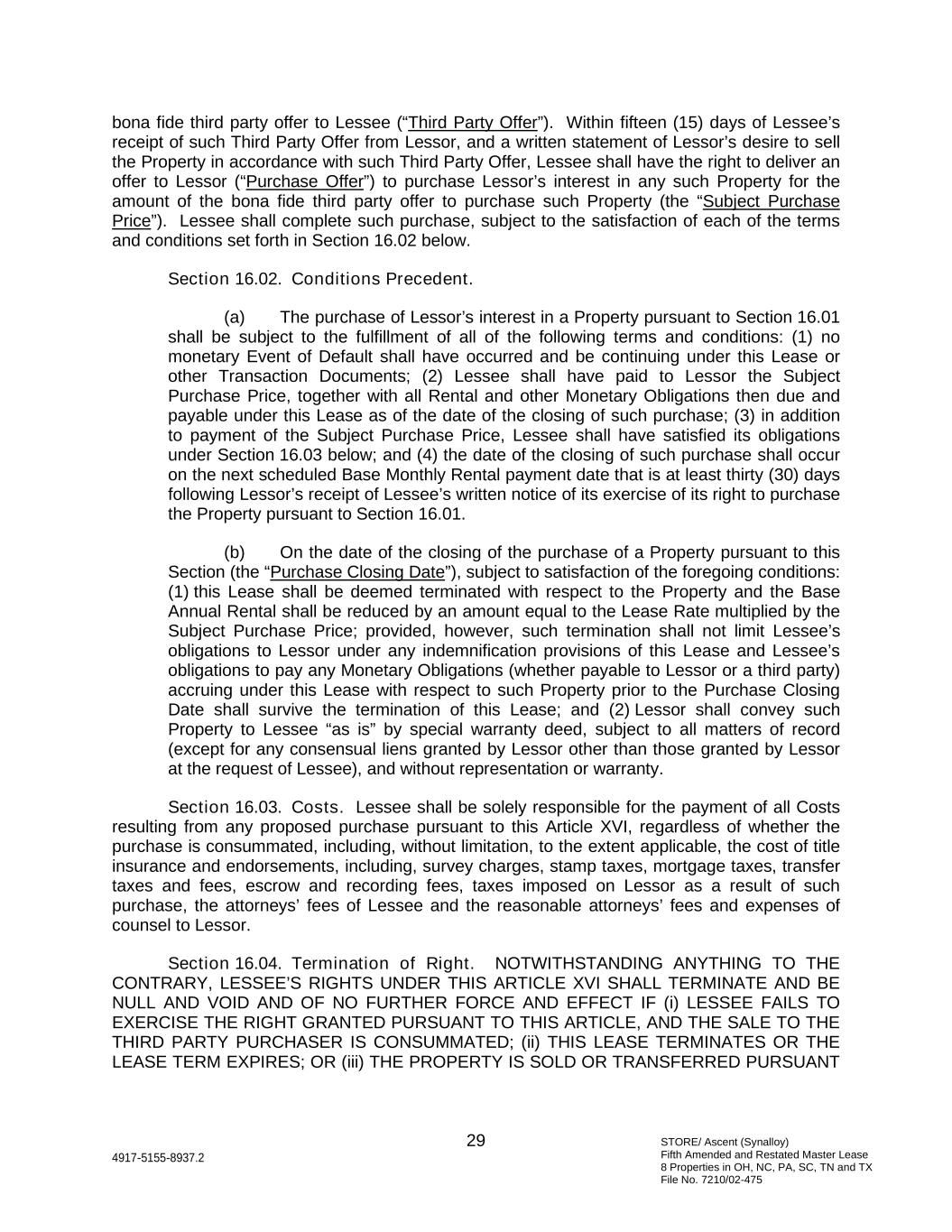 STORE/ Ascent (Synalloy) Fifth Amended and Restated Master Lease 8 Properties in OH, NC, PA, SC, TN and TX File No. 7210/02-475 29 4917-5155-8937.2 bona fide third party offer to Lessee (“Third Party Offer”). Within fifteen (15) days of Lessee’s receipt of such Third Party Offer from Lessor, and a written statement of Lessor’s desire to sell the Property in accordance with such Third Party Offer, Lessee shall have the right to deliver an offer to Lessor (“Purchase Offer”) to purchase Lessor’s interest in any such Property for the amount of the bona fide third party offer to purchase such Property (the “Subject Purchase Price”). Lessee shall complete such purchase, subject to the satisfaction of each of the terms and conditions set forth in Section 16.02 below. Section 16.02. Conditions Precedent. (a) The purchase of Lessor’s interest in a Property pursuant to Section 16.01 shall be subject to the fulfillment of all of the following terms and conditions: (1) no monetary Event of Default shall have occurred and be continuing under this Lease or other Transaction Documents; (2) Lessee shall have paid to Lessor the Subject Purchase Price, together with all Rental and other Monetary Obligations then due and payable under this Lease as of the date of the closing of such purchase; (3) in addition to payment of the Subject Purchase Price, Lessee shall have satisfied its obligations under Section 16.03 below; and (4) the date of the closing of such purchase shall occur on the next scheduled Base Monthly Rental payment date that is at least thirty (30) days following Lessor’s receipt of Lessee’s written notice of its exercise of its right to purchase the Property pursuant to Section 16.01. (b) On the date of the closing of the purchase of a Property pursuant to this Section (the “Purchase Closing Date”), subject to satisfaction of the foregoing conditions: (1) this Lease shall be deemed terminated with respect to the Property and the Base Annual Rental shall be reduced by an amount equal to the Lease Rate multiplied by the Subject Purchase Price; provided, however, such termination shall not limit Lessee’s obligations to Lessor under any indemnification provisions of this Lease and Lessee’s obligations to pay any Monetary Obligations (whether payable to Lessor or a third party) accruing under this Lease with respect to such Property prior to the Purchase Closing Date shall survive the termination of this Lease; and (2) Lessor shall convey such Property to Lessee “as is” by special warranty deed, subject to all matters of record (except for any consensual liens granted by Lessor other than those granted by Lessor at the request of Lessee), and without representation or warranty. Section 16.03. Costs. Lessee shall be solely responsible for the payment of all Costs resulting from any proposed purchase pursuant to this Article XVI, regardless of whether the purchase is consummated, including, without limitation, to the extent applicable, the cost of title insurance and endorsements, including, survey charges, stamp taxes, mortgage taxes, transfer taxes and fees, escrow and recording fees, taxes imposed on Lessor as a result of such purchase, the attorneys’ fees of Lessee and the reasonable attorneys’ fees and expenses of counsel to Lessor. Section 16.04. Termination of Right. NOTWITHSTANDING ANYTHING TO THE CONTRARY, LESSEE’S RIGHTS UNDER THIS ARTICLE XVI SHALL TERMINATE AND BE NULL AND VOID AND OF NO FURTHER FORCE AND EFFECT IF (i) LESSEE FAILS TO EXERCISE THE RIGHT GRANTED PURSUANT TO THIS ARTICLE, AND THE SALE TO THE THIRD PARTY PURCHASER IS CONSUMMATED; (ii) THIS LEASE TERMINATES OR THE LEASE TERM EXPIRES; OR (iii) THE PROPERTY IS SOLD OR TRANSFERRED PURSUANT