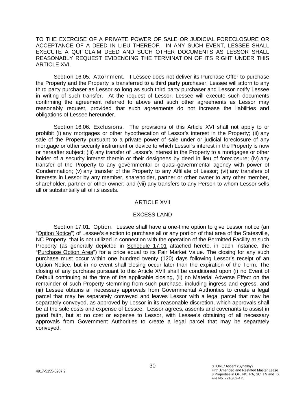 STORE/ Ascent (Synalloy) Fifth Amended and Restated Master Lease 8 Properties in OH, NC, PA, SC, TN and TX File No. 7210/02-475 30 4917-5155-8937.2 TO THE EXERCISE OF A PRIVATE POWER OF SALE OR JUDICIAL FORECLOSURE OR ACCEPTANCE OF A DEED IN LIEU THEREOF. IN ANY SUCH EVENT, LESSEE SHALL EXECUTE A QUITCLAIM DEED AND SUCH OTHER DOCUMENTS AS LESSOR SHALL REASONABLY REQUEST EVIDENCING THE TERMINATION OF ITS RIGHT UNDER THIS ARTICLE XVI. Section 16.05. Attornment. If Lessee does not deliver its Purchase Offer to purchase the Property and the Property is transferred to a third party purchaser, Lessee will attorn to any third party purchaser as Lessor so long as such third party purchaser and Lessor notify Lessee in writing of such transfer. At the request of Lessor, Lessee will execute such documents confirming the agreement referred to above and such other agreements as Lessor may reasonably request, provided that such agreements do not increase the liabilities and obligations of Lessee hereunder. Section 16.06. Exclusions. The provisions of this Article XVI shall not apply to or prohibit (i) any mortgages or other hypothecation of Lessor’s interest in the Property; (ii) any sale of the Property pursuant to a private power of sale under or judicial foreclosure of any mortgage or other security instrument or device to which Lessor’s interest in the Property is now or hereafter subject; (iii) any transfer of Lessor’s interest in the Property to a mortgagee or other holder of a security interest therein or their designees by deed in lieu of foreclosure; (iv) any transfer of the Property to any governmental or quasi-governmental agency with power of Condemnation; (v) any transfer of the Property to any Affiliate of Lessor; (vi) any transfers of interests in Lessor by any member, shareholder, partner or other owner to any other member, shareholder, partner or other owner; and (vii) any transfers to any Person to whom Lessor sells all or substantially all of its assets. ARTICLE XVII EXCESS LAND Section 17.01. Option. Lessee shall have a one-time option to give Lessor notice (an “Option Notice”) of Lessee’s election to purchase all or any portion of that area of the Statesville, NC Property, that is not utilized in connection with the operation of the Permitted Facility at such Property (as generally depicted in Schedule 17.01 attached hereto, in each instance, the “Purchase Option Area”) for a price equal to its Fair Market Value. The closing for any such purchase must occur within one hundred twenty (120) days following Lessor’s receipt of an Option Notice, but in no event shall closing occur later than the expiration of the Term. The closing of any purchase pursuant to this Article XVII shall be conditioned upon (i) no Event of Default continuing at the time of the applicable closing, (ii) no Material Adverse Effect on the remainder of such Property stemming from such purchase, including ingress and egress, and (iii) Lessee obtains all necessary approvals from Governmental Authorities to create a legal parcel that may be separately conveyed and leaves Lessor with a legal parcel that may be separately conveyed, as approved by Lessor in its reasonable discretion, which approvals shall be at the sole costs and expense of Lessee. Lessor agrees, assents and covenants to assist in good faith, but at no cost or expense to Lessor, with Lessee’s obtaining of all necessary approvals from Government Authorities to create a legal parcel that may be separately conveyed.
