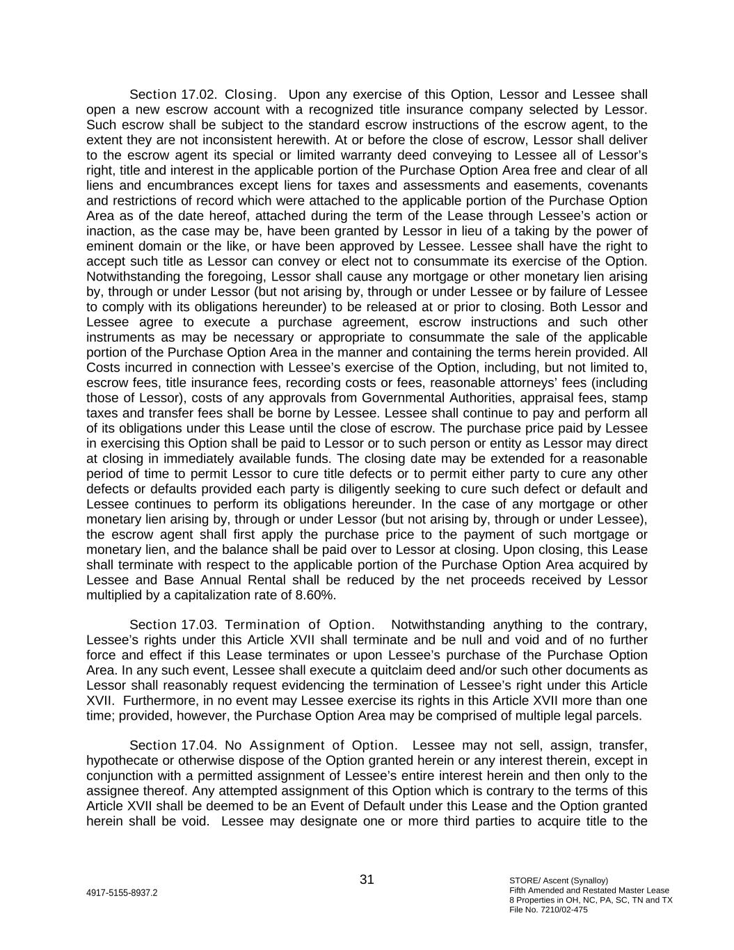 STORE/ Ascent (Synalloy) Fifth Amended and Restated Master Lease 8 Properties in OH, NC, PA, SC, TN and TX File No. 7210/02-475 31 4917-5155-8937.2 Section 17.02. Closing. Upon any exercise of this Option, Lessor and Lessee shall open a new escrow account with a recognized title insurance company selected by Lessor. Such escrow shall be subject to the standard escrow instructions of the escrow agent, to the extent they are not inconsistent herewith. At or before the close of escrow, Lessor shall deliver to the escrow agent its special or limited warranty deed conveying to Lessee all of Lessor’s right, title and interest in the applicable portion of the Purchase Option Area free and clear of all liens and encumbrances except liens for taxes and assessments and easements, covenants and restrictions of record which were attached to the applicable portion of the Purchase Option Area as of the date hereof, attached during the term of the Lease through Lessee’s action or inaction, as the case may be, have been granted by Lessor in lieu of a taking by the power of eminent domain or the like, or have been approved by Lessee. Lessee shall have the right to accept such title as Lessor can convey or elect not to consummate its exercise of the Option. Notwithstanding the foregoing, Lessor shall cause any mortgage or other monetary lien arising by, through or under Lessor (but not arising by, through or under Lessee or by failure of Lessee to comply with its obligations hereunder) to be released at or prior to closing. Both Lessor and Lessee agree to execute a purchase agreement, escrow instructions and such other instruments as may be necessary or appropriate to consummate the sale of the applicable portion of the Purchase Option Area in the manner and containing the terms herein provided. All Costs incurred in connection with Lessee’s exercise of the Option, including, but not limited to, escrow fees, title insurance fees, recording costs or fees, reasonable attorneys’ fees (including those of Lessor), costs of any approvals from Governmental Authorities, appraisal fees, stamp taxes and transfer fees shall be borne by Lessee. Lessee shall continue to pay and perform all of its obligations under this Lease until the close of escrow. The purchase price paid by Lessee in exercising this Option shall be paid to Lessor or to such person or entity as Lessor may direct at closing in immediately available funds. The closing date may be extended for a reasonable period of time to permit Lessor to cure title defects or to permit either party to cure any other defects or defaults provided each party is diligently seeking to cure such defect or default and Lessee continues to perform its obligations hereunder. In the case of any mortgage or other monetary lien arising by, through or under Lessor (but not arising by, through or under Lessee), the escrow agent shall first apply the purchase price to the payment of such mortgage or monetary lien, and the balance shall be paid over to Lessor at closing. Upon closing, this Lease shall terminate with respect to the applicable portion of the Purchase Option Area acquired by Lessee and Base Annual Rental shall be reduced by the net proceeds received by Lessor multiplied by a capitalization rate of 8.60%. Section 17.03. Termination of Option. Notwithstanding anything to the contrary, Lessee’s rights under this Article XVII shall terminate and be null and void and of no further force and effect if this Lease terminates or upon Lessee’s purchase of the Purchase Option Area. In any such event, Lessee shall execute a quitclaim deed and/or such other documents as Lessor shall reasonably request evidencing the termination of Lessee’s right under this Article XVII. Furthermore, in no event may Lessee exercise its rights in this Article XVII more than one time; provided, however, the Purchase Option Area may be comprised of multiple legal parcels. Section 17.04. No Assignment of Option. Lessee may not sell, assign, transfer, hypothecate or otherwise dispose of the Option granted herein or any interest therein, except in conjunction with a permitted assignment of Lessee’s entire interest herein and then only to the assignee thereof. Any attempted assignment of this Option which is contrary to the terms of this Article XVII shall be deemed to be an Event of Default under this Lease and the Option granted herein shall be void. Lessee may designate one or more third parties to acquire title to the