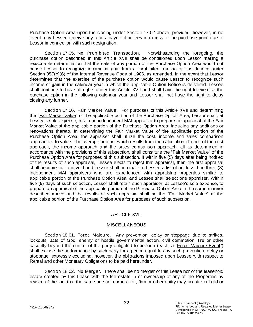 STORE/ Ascent (Synalloy) Fifth Amended and Restated Master Lease 8 Properties in OH, NC, PA, SC, TN and TX File No. 7210/02-475 32 4917-5155-8937.2 Purchase Option Area upon the closing under Section 17.02 above; provided, however, in no event may Lessee receive any funds, payment or fees in excess of the purchase price due to Lessor in connection with such designation. Section 17.05. No Prohibited Transaction. Notwithstanding the foregoing, the purchase option described in this Article XVII shall be conditioned upon Lessor making a reasonable determination that the sale of any portion of the Purchase Option Area would not cause Lessor to recognize income or gain from a “prohibited transaction” as defined under Section 857(b)(6) of the Internal Revenue Code of 1986, as amended. In the event that Lessor determines that the exercise of the purchase option would cause Lessor to recognize such income or gain in the calendar year in which the applicable Option Notice is delivered, Lessee shall continue to have all rights under this Article XVII and shall have the right to exercise the purchase option in the following calendar year and Lessor shall not have the right to delay closing any further. Section 17.06. Fair Market Value. For purposes of this Article XVII and determining the “Fair Market Value” of the applicable portion of the Purchase Option Area, Lessor shall, at Lessee’s sole expense, retain an independent MAI appraiser to prepare an appraisal of the Fair Market Value of the applicable portion of the Purchase Option Area, including any additions or renovations thereto. In determining the Fair Market Value of the applicable portion of the Purchase Option Area, the appraiser shall utilize the cost, income and sales comparison approaches to value. The average amount which results from the calculation of each of the cost approach, the income approach and the sales comparison approach, all as determined in accordance with the provisions of this subsection, shall constitute the “Fair Market Value” of the Purchase Option Area for purposes of this subsection. If within five (5) days after being notified of the results of such appraisal, Lessee elects to reject that appraisal, then the first appraisal shall become null and void and Lessor shall nominate to Lessee a list of not less than three (3) independent MAI appraisers who are experienced with appraising properties similar to applicable portion of the Purchase Option Area, and Lessee shall select one appraiser. Within five (5) days of such selection, Lessor shall retain such appraiser, at Lessee’s sole expense, to prepare an appraisal of the applicable portion of the Purchase Option Area in the same manner described above and the results of such appraisal shall be the “Fair Market Value” of the applicable portion of the Purchase Option Area for purposes of such subsection. ARTICLE XVIII MISCELLANEOUS Section 18.01. Force Majeure. Any prevention, delay or stoppage due to strikes, lockouts, acts of God, enemy or hostile governmental action, civil commotion, fire or other casualty beyond the control of the party obligated to perform (each, a “Force Majeure Event”) shall excuse the performance by such party for a period equal to any such prevention, delay or stoppage, expressly excluding, however, the obligations imposed upon Lessee with respect to Rental and other Monetary Obligations to be paid hereunder. Section 18.02. No Merger. There shall be no merger of this Lease nor of the leasehold estate created by this Lease with the fee estate in or ownership of any of the Properties by reason of the fact that the same person, corporation, firm or other entity may acquire or hold or