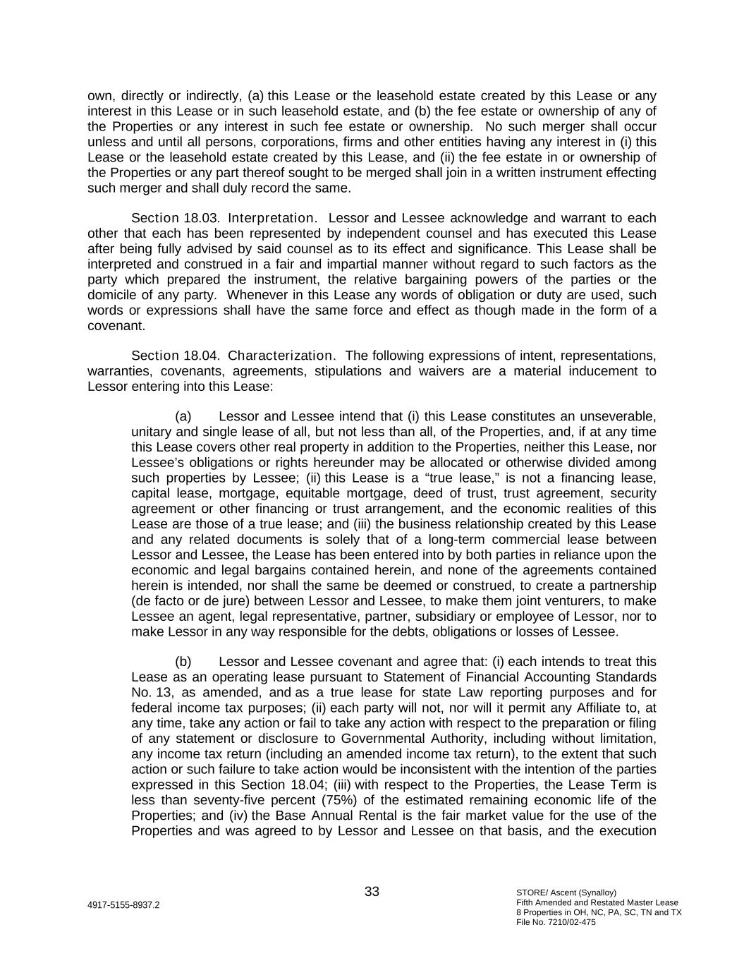 STORE/ Ascent (Synalloy) Fifth Amended and Restated Master Lease 8 Properties in OH, NC, PA, SC, TN and TX File No. 7210/02-475 33 4917-5155-8937.2 own, directly or indirectly, (a) this Lease or the leasehold estate created by this Lease or any interest in this Lease or in such leasehold estate, and (b) the fee estate or ownership of any of the Properties or any interest in such fee estate or ownership. No such merger shall occur unless and until all persons, corporations, firms and other entities having any interest in (i) this Lease or the leasehold estate created by this Lease, and (ii) the fee estate in or ownership of the Properties or any part thereof sought to be merged shall join in a written instrument effecting such merger and shall duly record the same. Section 18.03. Interpretation. Lessor and Lessee acknowledge and warrant to each other that each has been represented by independent counsel and has executed this Lease after being fully advised by said counsel as to its effect and significance. This Lease shall be interpreted and construed in a fair and impartial manner without regard to such factors as the party which prepared the instrument, the relative bargaining powers of the parties or the domicile of any party. Whenever in this Lease any words of obligation or duty are used, such words or expressions shall have the same force and effect as though made in the form of a covenant. Section 18.04. Characterization. The following expressions of intent, representations, warranties, covenants, agreements, stipulations and waivers are a material inducement to Lessor entering into this Lease: (a) Lessor and Lessee intend that (i) this Lease constitutes an unseverable, unitary and single lease of all, but not less than all, of the Properties, and, if at any time this Lease covers other real property in addition to the Properties, neither this Lease, nor Lessee’s obligations or rights hereunder may be allocated or otherwise divided among such properties by Lessee; (ii) this Lease is a “true lease,” is not a financing lease, capital lease, mortgage, equitable mortgage, deed of trust, trust agreement, security agreement or other financing or trust arrangement, and the economic realities of this Lease are those of a true lease; and (iii) the business relationship created by this Lease and any related documents is solely that of a long-term commercial lease between Lessor and Lessee, the Lease has been entered into by both parties in reliance upon the economic and legal bargains contained herein, and none of the agreements contained herein is intended, nor shall the same be deemed or construed, to create a partnership (de facto or de jure) between Lessor and Lessee, to make them joint venturers, to make Lessee an agent, legal representative, partner, subsidiary or employee of Lessor, nor to make Lessor in any way responsible for the debts, obligations or losses of Lessee. (b) Lessor and Lessee covenant and agree that: (i) each intends to treat this Lease as an operating lease pursuant to Statement of Financial Accounting Standards No. 13, as amended, and as a true lease for state Law reporting purposes and for federal income tax purposes; (ii) each party will not, nor will it permit any Affiliate to, at any time, take any action or fail to take any action with respect to the preparation or filing of any statement or disclosure to Governmental Authority, including without limitation, any income tax return (including an amended income tax return), to the extent that such action or such failure to take action would be inconsistent with the intention of the parties expressed in this Section 18.04; (iii) with respect to the Properties, the Lease Term is less than seventy-five percent (75%) of the estimated remaining economic life of the Properties; and (iv) the Base Annual Rental is the fair market value for the use of the Properties and was agreed to by Lessor and Lessee on that basis, and the execution