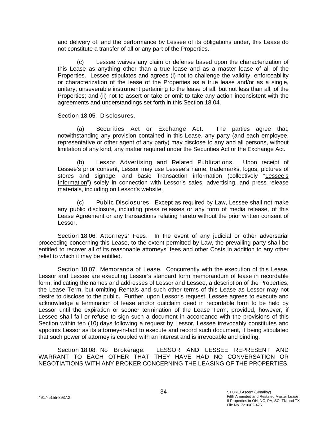 STORE/ Ascent (Synalloy) Fifth Amended and Restated Master Lease 8 Properties in OH, NC, PA, SC, TN and TX File No. 7210/02-475 34 4917-5155-8937.2 and delivery of, and the performance by Lessee of its obligations under, this Lease do not constitute a transfer of all or any part of the Properties. (c) Lessee waives any claim or defense based upon the characterization of this Lease as anything other than a true lease and as a master lease of all of the Properties. Lessee stipulates and agrees (i) not to challenge the validity, enforceability or characterization of the lease of the Properties as a true lease and/or as a single, unitary, unseverable instrument pertaining to the lease of all, but not less than all, of the Properties; and (ii) not to assert or take or omit to take any action inconsistent with the agreements and understandings set forth in this Section 18.04. Section 18.05. Disclosures. (a) Securities Act or Exchange Act. The parties agree that, notwithstanding any provision contained in this Lease, any party (and each employee, representative or other agent of any party) may disclose to any and all persons, without limitation of any kind, any matter required under the Securities Act or the Exchange Act. (b) Lessor Advertising and Related Publications. Upon receipt of Lessee’s prior consent, Lessor may use Lessee’s name, trademarks, logos, pictures of stores and signage, and basic Transaction information (collectively “Lessee’s Information”) solely in connection with Lessor’s sales, advertising, and press release materials, including on Lessor’s website. (c) Public Disclosures. Except as required by Law, Lessee shall not make any public disclosure, including press releases or any form of media release, of this Lease Agreement or any transactions relating hereto without the prior written consent of Lessor. Section 18.06. Attorneys’ Fees. In the event of any judicial or other adversarial proceeding concerning this Lease, to the extent permitted by Law, the prevailing party shall be entitled to recover all of its reasonable attorneys’ fees and other Costs in addition to any other relief to which it may be entitled. Section 18.07. Memoranda of Lease. Concurrently with the execution of this Lease, Lessor and Lessee are executing Lessor’s standard form memorandum of lease in recordable form, indicating the names and addresses of Lessor and Lessee, a description of the Properties, the Lease Term, but omitting Rentals and such other terms of this Lease as Lessor may not desire to disclose to the public. Further, upon Lessor’s request, Lessee agrees to execute and acknowledge a termination of lease and/or quitclaim deed in recordable form to be held by Lessor until the expiration or sooner termination of the Lease Term; provided, however, if Lessee shall fail or refuse to sign such a document in accordance with the provisions of this Section within ten (10) days following a request by Lessor, Lessee irrevocably constitutes and appoints Lessor as its attorney-in-fact to execute and record such document, it being stipulated that such power of attorney is coupled with an interest and is irrevocable and binding. Section 18.08. No Brokerage. LESSOR AND LESSEE REPRESENT AND WARRANT TO EACH OTHER THAT THEY HAVE HAD NO CONVERSATION OR NEGOTIATIONS WITH ANY BROKER CONCERNING THE LEASING OF THE PROPERTIES.