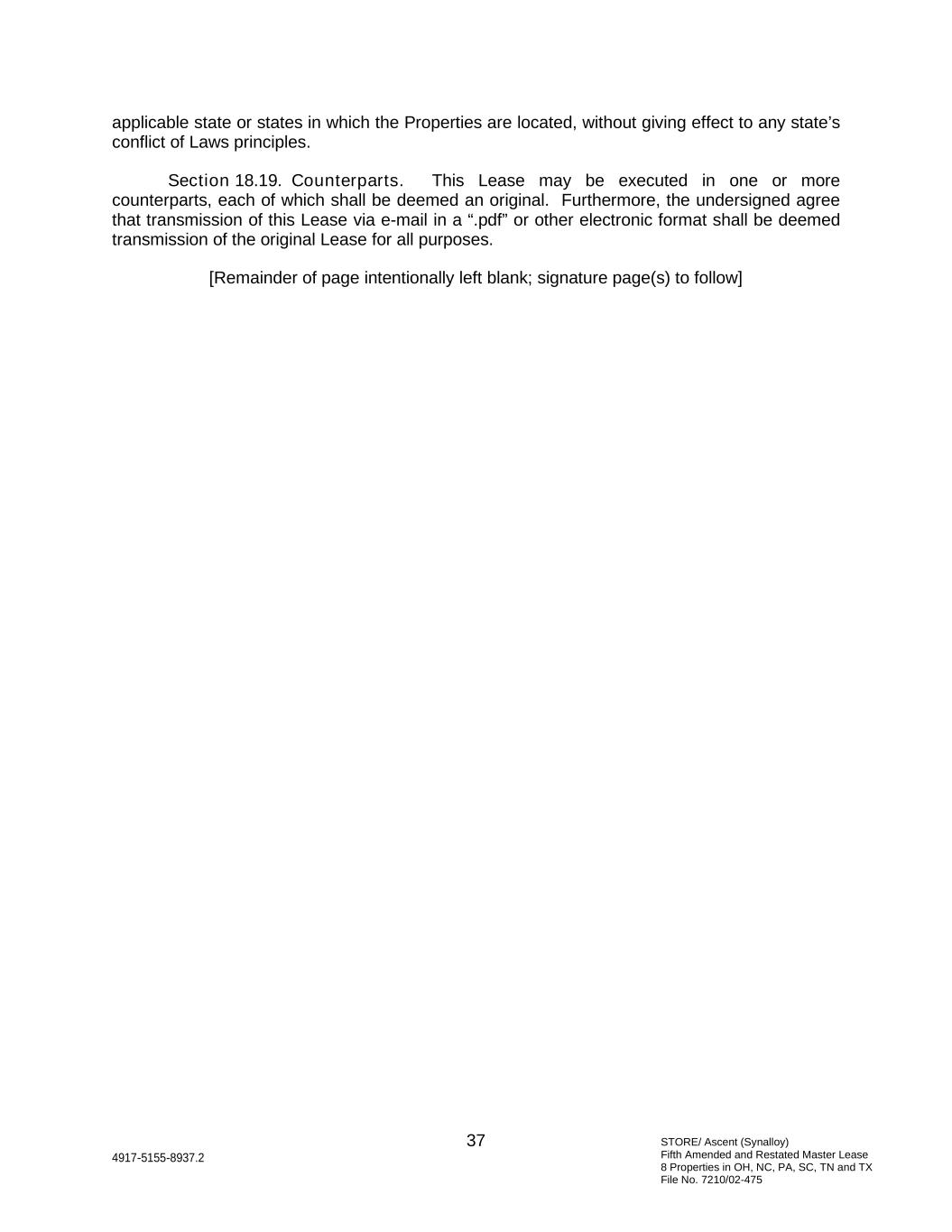 STORE/ Ascent (Synalloy) Fifth Amended and Restated Master Lease 8 Properties in OH, NC, PA, SC, TN and TX File No. 7210/02-475 37 4917-5155-8937.2 applicable state or states in which the Properties are located, without giving effect to any state’s conflict of Laws principles. Section 18.19. Counterparts. This Lease may be executed in one or more counterparts, each of which shall be deemed an original. Furthermore, the undersigned agree that transmission of this Lease via e-mail in a “.pdf” or other electronic format shall be deemed transmission of the original Lease for all purposes. [Remainder of page intentionally left blank; signature page(s) to follow]