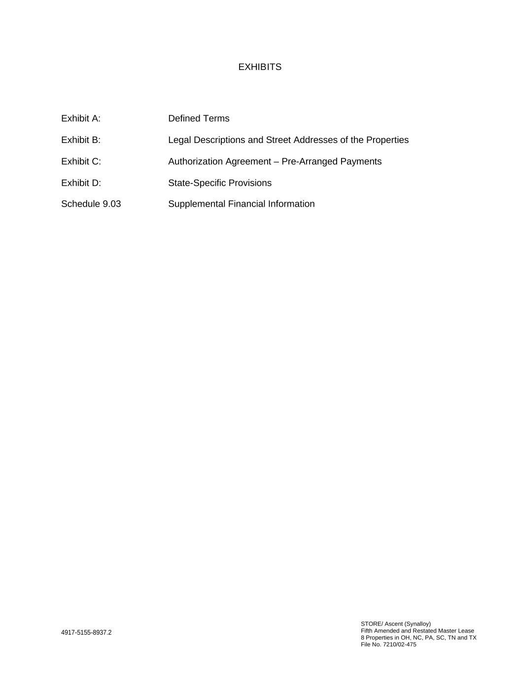 STORE/ Ascent (Synalloy) Fifth Amended and Restated Master Lease 8 Properties in OH, NC, PA, SC, TN and TX File No. 7210/02-475 4917-5155-8937.2 EXHIBITS Exhibit A: Defined Terms Exhibit B: Legal Descriptions and Street Addresses of the Properties Exhibit C: Authorization Agreement – Pre-Arranged Payments Exhibit D: State-Specific Provisions Schedule 9.03 Supplemental Financial Information