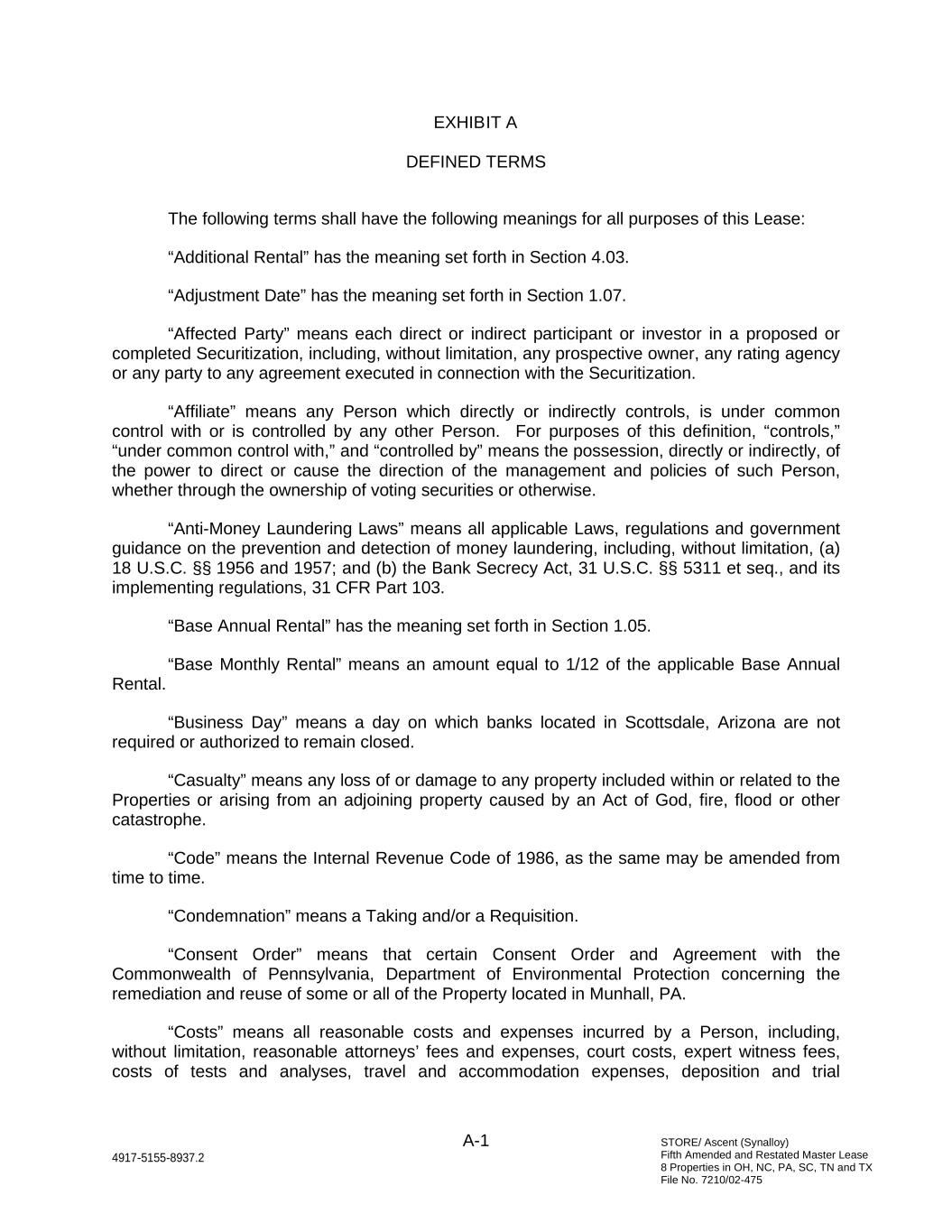STORE/ Ascent (Synalloy) Fifth Amended and Restated Master Lease 8 Properties in OH, NC, PA, SC, TN and TX File No. 7210/02-475 A-1 4917-5155-8937.2 EXHIBIT A DEFINED TERMS The following terms shall have the following meanings for all purposes of this Lease: “Additional Rental” has the meaning set forth in Section 4.03. “Adjustment Date” has the meaning set forth in Section 1.07. “Affected Party” means each direct or indirect participant or investor in a proposed or completed Securitization, including, without limitation, any prospective owner, any rating agency or any party to any agreement executed in connection with the Securitization. “Affiliate” means any Person which directly or indirectly controls, is under common control with or is controlled by any other Person. For purposes of this definition, “controls,” “under common control with,” and “controlled by” means the possession, directly or indirectly, of the power to direct or cause the direction of the management and policies of such Person, whether through the ownership of voting securities or otherwise. “Anti-Money Laundering Laws” means all applicable Laws, regulations and government guidance on the prevention and detection of money laundering, including, without limitation, (a) 18 U.S.C. §§ 1956 and 1957; and (b) the Bank Secrecy Act, 31 U.S.C. §§ 5311 et seq., and its implementing regulations, 31 CFR Part 103. “Base Annual Rental” has the meaning set forth in Section 1.05. “Base Monthly Rental” means an amount equal to 1/12 of the applicable Base Annual Rental. “Business Day” means a day on which banks located in Scottsdale, Arizona are not required or authorized to remain closed. “Casualty” means any loss of or damage to any property included within or related to the Properties or arising from an adjoining property caused by an Act of God, fire, flood or other catastrophe. “Code” means the Internal Revenue Code of 1986, as the same may be amended from time to time. “Condemnation” means a Taking and/or a Requisition. “Consent Order” means that certain Consent Order and Agreement with the Commonwealth of Pennsylvania, Department of Environmental Protection concerning the remediation and reuse of some or all of the Property located in Munhall, PA. “Costs” means all reasonable costs and expenses incurred by a Person, including, without limitation, reasonable attorneys’ fees and expenses, court costs, expert witness fees, costs of tests and analyses, travel and accommodation expenses, deposition and trial