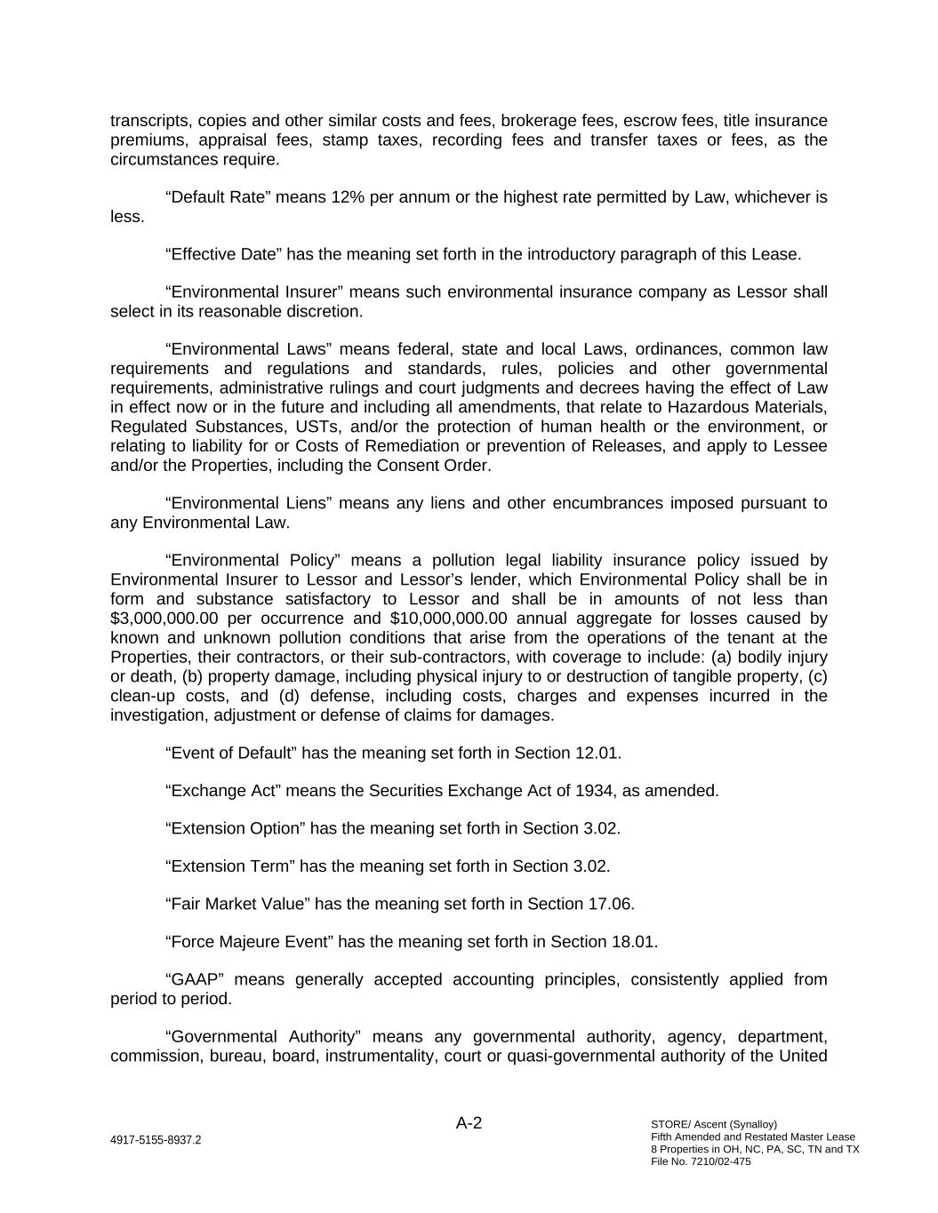 STORE/ Ascent (Synalloy) Fifth Amended and Restated Master Lease 8 Properties in OH, NC, PA, SC, TN and TX File No. 7210/02-475 A-2 4917-5155-8937.2 transcripts, copies and other similar costs and fees, brokerage fees, escrow fees, title insurance premiums, appraisal fees, stamp taxes, recording fees and transfer taxes or fees, as the circumstances require. “Default Rate” means 12% per annum or the highest rate permitted by Law, whichever is less. “Effective Date” has the meaning set forth in the introductory paragraph of this Lease. “Environmental Insurer” means such environmental insurance company as Lessor shall select in its reasonable discretion. “Environmental Laws” means federal, state and local Laws, ordinances, common law requirements and regulations and standards, rules, policies and other governmental requirements, administrative rulings and court judgments and decrees having the effect of Law in effect now or in the future and including all amendments, that relate to Hazardous Materials, Regulated Substances, USTs, and/or the protection of human health or the environment, or relating to liability for or Costs of Remediation or prevention of Releases, and apply to Lessee and/or the Properties, including the Consent Order. “Environmental Liens” means any liens and other encumbrances imposed pursuant to any Environmental Law. “Environmental Policy” means a pollution legal liability insurance policy issued by Environmental Insurer to Lessor and Lessor’s lender, which Environmental Policy shall be in form and substance satisfactory to Lessor and shall be in amounts of not less than $3,000,000.00 per occurrence and $10,000,000.00 annual aggregate for losses caused by known and unknown pollution conditions that arise from the operations of the tenant at the Properties, their contractors, or their sub-contractors, with coverage to include: (a) bodily injury or death, (b) property damage, including physical injury to or destruction of tangible property, (c) clean-up costs, and (d) defense, including costs, charges and expenses incurred in the investigation, adjustment or defense of claims for damages. “Event of Default” has the meaning set forth in Section 12.01. “Exchange Act” means the Securities Exchange Act of 1934, as amended. “Extension Option” has the meaning set forth in Section 3.02. “Extension Term” has the meaning set forth in Section 3.02. “Fair Market Value” has the meaning set forth in Section 17.06. “Force Majeure Event” has the meaning set forth in Section 18.01. “GAAP” means generally accepted accounting principles, consistently applied from period to period. “Governmental Authority” means any governmental authority, agency, department, commission, bureau, board, instrumentality, court or quasi-governmental authority of the United