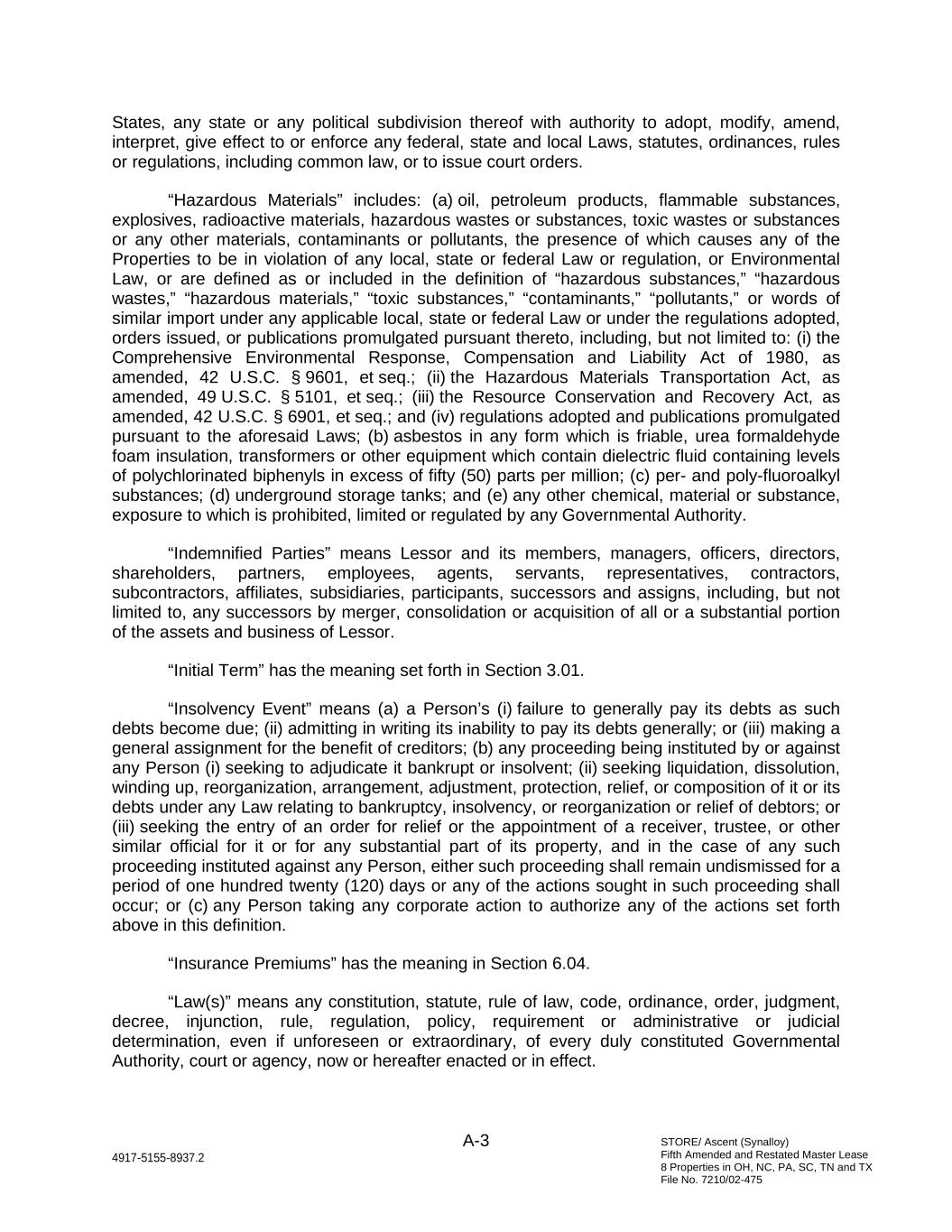 STORE/ Ascent (Synalloy) Fifth Amended and Restated Master Lease 8 Properties in OH, NC, PA, SC, TN and TX File No. 7210/02-475 A-3 4917-5155-8937.2 States, any state or any political subdivision thereof with authority to adopt, modify, amend, interpret, give effect to or enforce any federal, state and local Laws, statutes, ordinances, rules or regulations, including common law, or to issue court orders. “Hazardous Materials” includes: (a) oil, petroleum products, flammable substances, explosives, radioactive materials, hazardous wastes or substances, toxic wastes or substances or any other materials, contaminants or pollutants, the presence of which causes any of the Properties to be in violation of any local, state or federal Law or regulation, or Environmental Law, or are defined as or included in the definition of “hazardous substances,” “hazardous wastes,” “hazardous materials,” “toxic substances,” “contaminants,” “pollutants,” or words of similar import under any applicable local, state or federal Law or under the regulations adopted, orders issued, or publications promulgated pursuant thereto, including, but not limited to: (i) the Comprehensive Environmental Response, Compensation and Liability Act of 1980, as amended, 42 U.S.C. § 9601, et seq.; (ii) the Hazardous Materials Transportation Act, as amended, 49 U.S.C. § 5101, et seq.; (iii) the Resource Conservation and Recovery Act, as amended, 42 U.S.C. § 6901, et seq.; and (iv) regulations adopted and publications promulgated pursuant to the aforesaid Laws; (b) asbestos in any form which is friable, urea formaldehyde foam insulation, transformers or other equipment which contain dielectric fluid containing levels of polychlorinated biphenyls in excess of fifty (50) parts per million; (c) per- and poly-fluoroalkyl substances; (d) underground storage tanks; and (e) any other chemical, material or substance, exposure to which is prohibited, limited or regulated by any Governmental Authority. “Indemnified Parties” means Lessor and its members, managers, officers, directors, shareholders, partners, employees, agents, servants, representatives, contractors, subcontractors, affiliates, subsidiaries, participants, successors and assigns, including, but not limited to, any successors by merger, consolidation or acquisition of all or a substantial portion of the assets and business of Lessor. “Initial Term” has the meaning set forth in Section 3.01. “Insolvency Event” means (a) a Person’s (i) failure to generally pay its debts as such debts become due; (ii) admitting in writing its inability to pay its debts generally; or (iii) making a general assignment for the benefit of creditors; (b) any proceeding being instituted by or against any Person (i) seeking to adjudicate it bankrupt or insolvent; (ii) seeking liquidation, dissolution, winding up, reorganization, arrangement, adjustment, protection, relief, or composition of it or its debts under any Law relating to bankruptcy, insolvency, or reorganization or relief of debtors; or (iii) seeking the entry of an order for relief or the appointment of a receiver, trustee, or other similar official for it or for any substantial part of its property, and in the case of any such proceeding instituted against any Person, either such proceeding shall remain undismissed for a period of one hundred twenty (120) days or any of the actions sought in such proceeding shall occur; or (c) any Person taking any corporate action to authorize any of the actions set forth above in this definition. “Insurance Premiums” has the meaning in Section 6.04. “Law(s)” means any constitution, statute, rule of law, code, ordinance, order, judgment, decree, injunction, rule, regulation, policy, requirement or administrative or judicial determination, even if unforeseen or extraordinary, of every duly constituted Governmental Authority, court or agency, now or hereafter enacted or in effect.