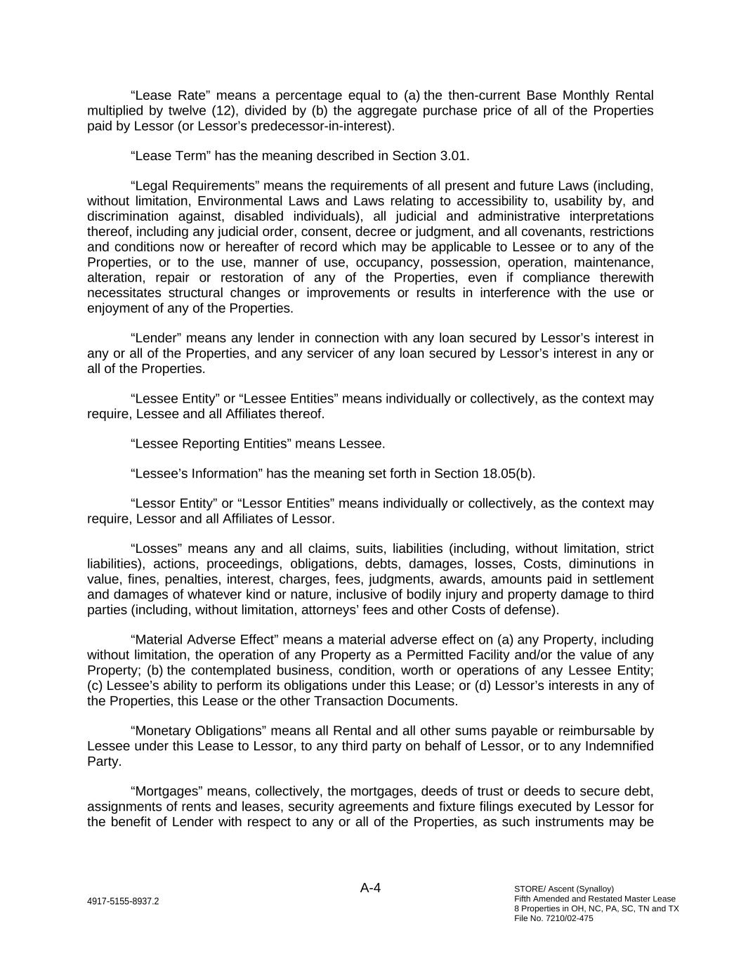 STORE/ Ascent (Synalloy) Fifth Amended and Restated Master Lease 8 Properties in OH, NC, PA, SC, TN and TX File No. 7210/02-475 A-4 4917-5155-8937.2 “Lease Rate” means a percentage equal to (a) the then-current Base Monthly Rental multiplied by twelve (12), divided by (b) the aggregate purchase price of all of the Properties paid by Lessor (or Lessor’s predecessor-in-interest). “Lease Term” has the meaning described in Section 3.01. “Legal Requirements” means the requirements of all present and future Laws (including, without limitation, Environmental Laws and Laws relating to accessibility to, usability by, and discrimination against, disabled individuals), all judicial and administrative interpretations thereof, including any judicial order, consent, decree or judgment, and all covenants, restrictions and conditions now or hereafter of record which may be applicable to Lessee or to any of the Properties, or to the use, manner of use, occupancy, possession, operation, maintenance, alteration, repair or restoration of any of the Properties, even if compliance therewith necessitates structural changes or improvements or results in interference with the use or enjoyment of any of the Properties. “Lender” means any lender in connection with any loan secured by Lessor’s interest in any or all of the Properties, and any servicer of any loan secured by Lessor’s interest in any or all of the Properties. “Lessee Entity” or “Lessee Entities” means individually or collectively, as the context may require, Lessee and all Affiliates thereof. “Lessee Reporting Entities” means Lessee. “Lessee’s Information” has the meaning set forth in Section 18.05(b). “Lessor Entity” or “Lessor Entities” means individually or collectively, as the context may require, Lessor and all Affiliates of Lessor. “Losses” means any and all claims, suits, liabilities (including, without limitation, strict liabilities), actions, proceedings, obligations, debts, damages, losses, Costs, diminutions in value, fines, penalties, interest, charges, fees, judgments, awards, amounts paid in settlement and damages of whatever kind or nature, inclusive of bodily injury and property damage to third parties (including, without limitation, attorneys’ fees and other Costs of defense). “Material Adverse Effect” means a material adverse effect on (a) any Property, including without limitation, the operation of any Property as a Permitted Facility and/or the value of any Property; (b) the contemplated business, condition, worth or operations of any Lessee Entity; (c) Lessee’s ability to perform its obligations under this Lease; or (d) Lessor’s interests in any of the Properties, this Lease or the other Transaction Documents. “Monetary Obligations” means all Rental and all other sums payable or reimbursable by Lessee under this Lease to Lessor, to any third party on behalf of Lessor, or to any Indemnified Party. “Mortgages” means, collectively, the mortgages, deeds of trust or deeds to secure debt, assignments of rents and leases, security agreements and fixture filings executed by Lessor for the benefit of Lender with respect to any or all of the Properties, as such instruments may be