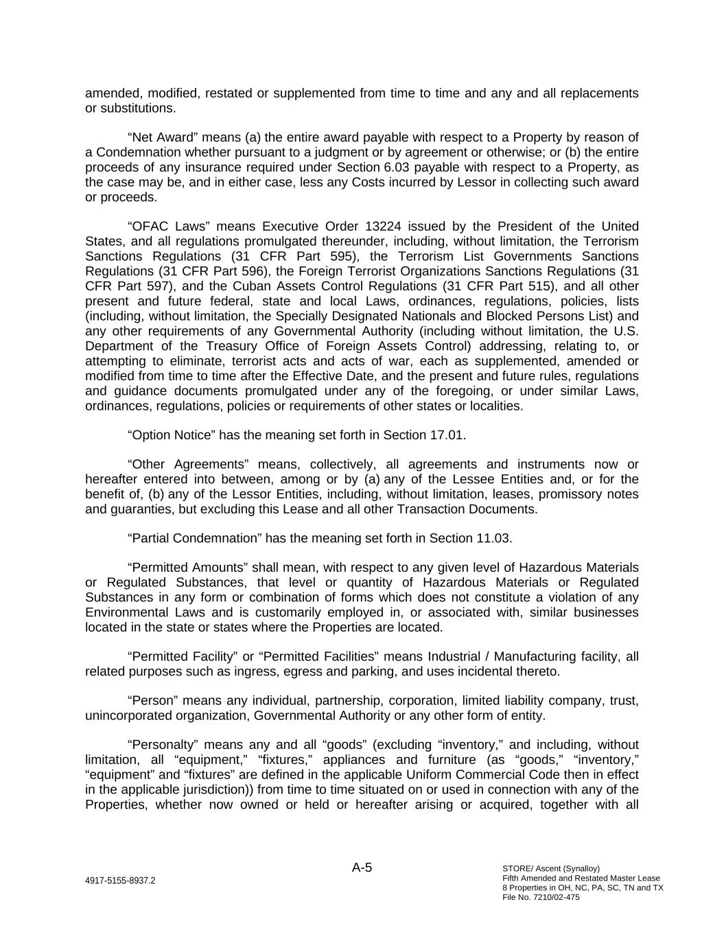 STORE/ Ascent (Synalloy) Fifth Amended and Restated Master Lease 8 Properties in OH, NC, PA, SC, TN and TX File No. 7210/02-475 A-5 4917-5155-8937.2 amended, modified, restated or supplemented from time to time and any and all replacements or substitutions. “Net Award” means (a) the entire award payable with respect to a Property by reason of a Condemnation whether pursuant to a judgment or by agreement or otherwise; or (b) the entire proceeds of any insurance required under Section 6.03 payable with respect to a Property, as the case may be, and in either case, less any Costs incurred by Lessor in collecting such award or proceeds. “OFAC Laws” means Executive Order 13224 issued by the President of the United States, and all regulations promulgated thereunder, including, without limitation, the Terrorism Sanctions Regulations (31 CFR Part 595), the Terrorism List Governments Sanctions Regulations (31 CFR Part 596), the Foreign Terrorist Organizations Sanctions Regulations (31 CFR Part 597), and the Cuban Assets Control Regulations (31 CFR Part 515), and all other present and future federal, state and local Laws, ordinances, regulations, policies, lists (including, without limitation, the Specially Designated Nationals and Blocked Persons List) and any other requirements of any Governmental Authority (including without limitation, the U.S. Department of the Treasury Office of Foreign Assets Control) addressing, relating to, or attempting to eliminate, terrorist acts and acts of war, each as supplemented, amended or modified from time to time after the Effective Date, and the present and future rules, regulations and guidance documents promulgated under any of the foregoing, or under similar Laws, ordinances, regulations, policies or requirements of other states or localities. “Option Notice” has the meaning set forth in Section 17.01. “Other Agreements” means, collectively, all agreements and instruments now or hereafter entered into between, among or by (a) any of the Lessee Entities and, or for the benefit of, (b) any of the Lessor Entities, including, without limitation, leases, promissory notes and guaranties, but excluding this Lease and all other Transaction Documents. “Partial Condemnation” has the meaning set forth in Section 11.03. “Permitted Amounts” shall mean, with respect to any given level of Hazardous Materials or Regulated Substances, that level or quantity of Hazardous Materials or Regulated Substances in any form or combination of forms which does not constitute a violation of any Environmental Laws and is customarily employed in, or associated with, similar businesses located in the state or states where the Properties are located. “Permitted Facility” or “Permitted Facilities” means Industrial / Manufacturing facility, all related purposes such as ingress, egress and parking, and uses incidental thereto. “Person” means any individual, partnership, corporation, limited liability company, trust, unincorporated organization, Governmental Authority or any other form of entity. “Personalty” means any and all “goods” (excluding “inventory,” and including, without limitation, all “equipment,” “fixtures,” appliances and furniture (as “goods,” “inventory,” “equipment” and “fixtures” are defined in the applicable Uniform Commercial Code then in effect in the applicable jurisdiction)) from time to time situated on or used in connection with any of the Properties, whether now owned or held or hereafter arising or acquired, together with all