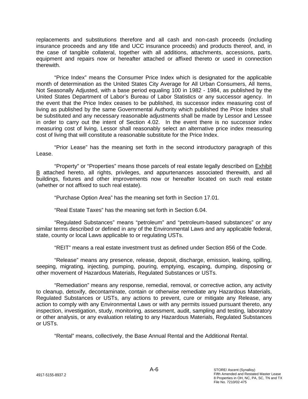 STORE/ Ascent (Synalloy) Fifth Amended and Restated Master Lease 8 Properties in OH, NC, PA, SC, TN and TX File No. 7210/02-475 A-6 4917-5155-8937.2 replacements and substitutions therefore and all cash and non-cash proceeds (including insurance proceeds and any title and UCC insurance proceeds) and products thereof, and, in the case of tangible collateral, together with all additions, attachments, accessions, parts, equipment and repairs now or hereafter attached or affixed thereto or used in connection therewith. “Price Index” means the Consumer Price Index which is designated for the applicable month of determination as the United States City Average for All Urban Consumers, All Items, Not Seasonally Adjusted, with a base period equaling 100 in 1982 - 1984, as published by the United States Department of Labor’s Bureau of Labor Statistics or any successor agency. In the event that the Price Index ceases to be published, its successor index measuring cost of living as published by the same Governmental Authority which published the Price Index shall be substituted and any necessary reasonable adjustments shall be made by Lessor and Lessee in order to carry out the intent of Section 4.02. In the event there is no successor index measuring cost of living, Lessor shall reasonably select an alternative price index measuring cost of living that will constitute a reasonable substitute for the Price Index. “Prior Lease” has the meaning set forth in the second introductory paragraph of this Lease. “Property” or “Properties” means those parcels of real estate legally described on Exhibit B attached hereto, all rights, privileges, and appurtenances associated therewith, and all buildings, fixtures and other improvements now or hereafter located on such real estate (whether or not affixed to such real estate). “Purchase Option Area” has the meaning set forth in Section 17.01. “Real Estate Taxes” has the meaning set forth in Section 6.04. “Regulated Substances” means “petroleum” and “petroleum-based substances” or any similar terms described or defined in any of the Environmental Laws and any applicable federal, state, county or local Laws applicable to or regulating USTs. “REIT” means a real estate investment trust as defined under Section 856 of the Code. “Release” means any presence, release, deposit, discharge, emission, leaking, spilling, seeping, migrating, injecting, pumping, pouring, emptying, escaping, dumping, disposing or other movement of Hazardous Materials, Regulated Substances or USTs. “Remediation” means any response, remedial, removal, or corrective action, any activity to cleanup, detoxify, decontaminate, contain or otherwise remediate any Hazardous Materials, Regulated Substances or USTs, any actions to prevent, cure or mitigate any Release, any action to comply with any Environmental Laws or with any permits issued pursuant thereto, any inspection, investigation, study, monitoring, assessment, audit, sampling and testing, laboratory or other analysis, or any evaluation relating to any Hazardous Materials, Regulated Substances or USTs. “Rental” means, collectively, the Base Annual Rental and the Additional Rental.