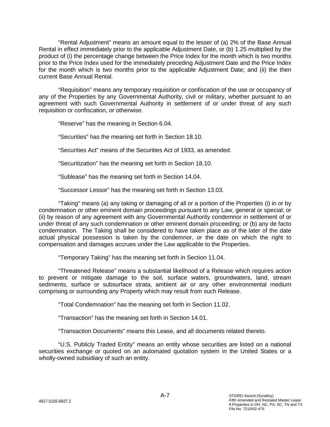 STORE/ Ascent (Synalloy) Fifth Amended and Restated Master Lease 8 Properties in OH, NC, PA, SC, TN and TX File No. 7210/02-475 A-7 4917-5155-8937.2 “Rental Adjustment” means an amount equal to the lesser of (a) 2% of the Base Annual Rental in effect immediately prior to the applicable Adjustment Date, or (b) 1.25 multiplied by the product of (i) the percentage change between the Price Index for the month which is two months prior to the Price Index used for the immediately preceding Adjustment Date and the Price Index for the month which is two months prior to the applicable Adjustment Date; and (ii) the then current Base Annual Rental. “Requisition” means any temporary requisition or confiscation of the use or occupancy of any of the Properties by any Governmental Authority, civil or military, whether pursuant to an agreement with such Governmental Authority in settlement of or under threat of any such requisition or confiscation, or otherwise. “Reserve” has the meaning in Section 6.04. “Securities” has the meaning set forth in Section 18.10. “Securities Act” means of the Securities Act of 1933, as amended. “Securitization” has the meaning set forth in Section 18.10. “Sublease” has the meaning set forth in Section 14.04. “Successor Lessor” has the meaning set forth in Section 13.03. “Taking” means (a) any taking or damaging of all or a portion of the Properties (i) in or by condemnation or other eminent domain proceedings pursuant to any Law, general or special; or (ii) by reason of any agreement with any Governmental Authority condemnor in settlement of or under threat of any such condemnation or other eminent domain proceeding; or (b) any de facto condemnation. The Taking shall be considered to have taken place as of the later of the date actual physical possession is taken by the condemnor, or the date on which the right to compensation and damages accrues under the Law applicable to the Properties. “Temporary Taking” has the meaning set forth in Section 11.04. “Threatened Release” means a substantial likelihood of a Release which requires action to prevent or mitigate damage to the soil, surface waters, groundwaters, land, stream sediments, surface or subsurface strata, ambient air or any other environmental medium comprising or surrounding any Property which may result from such Release. “Total Condemnation” has the meaning set forth in Section 11.02. “Transaction” has the meaning set forth in Section 14.01. “Transaction Documents” means this Lease, and all documents related thereto. “U.S. Publicly Traded Entity” means an entity whose securities are listed on a national securities exchange or quoted on an automated quotation system in the United States or a wholly-owned subsidiary of such an entity.