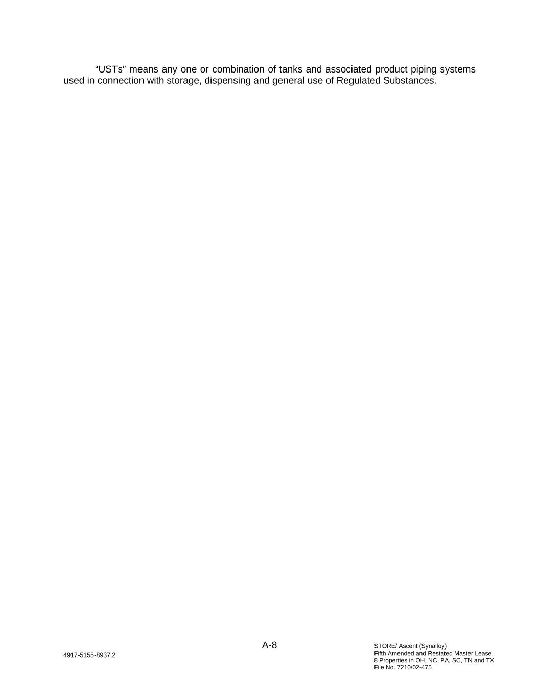 STORE/ Ascent (Synalloy) Fifth Amended and Restated Master Lease 8 Properties in OH, NC, PA, SC, TN and TX File No. 7210/02-475 A-8 4917-5155-8937.2 “USTs” means any one or combination of tanks and associated product piping systems used in connection with storage, dispensing and general use of Regulated Substances.